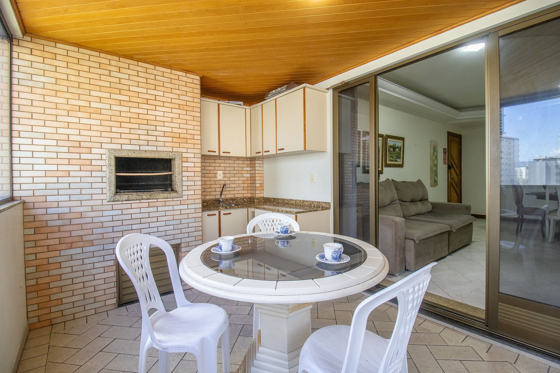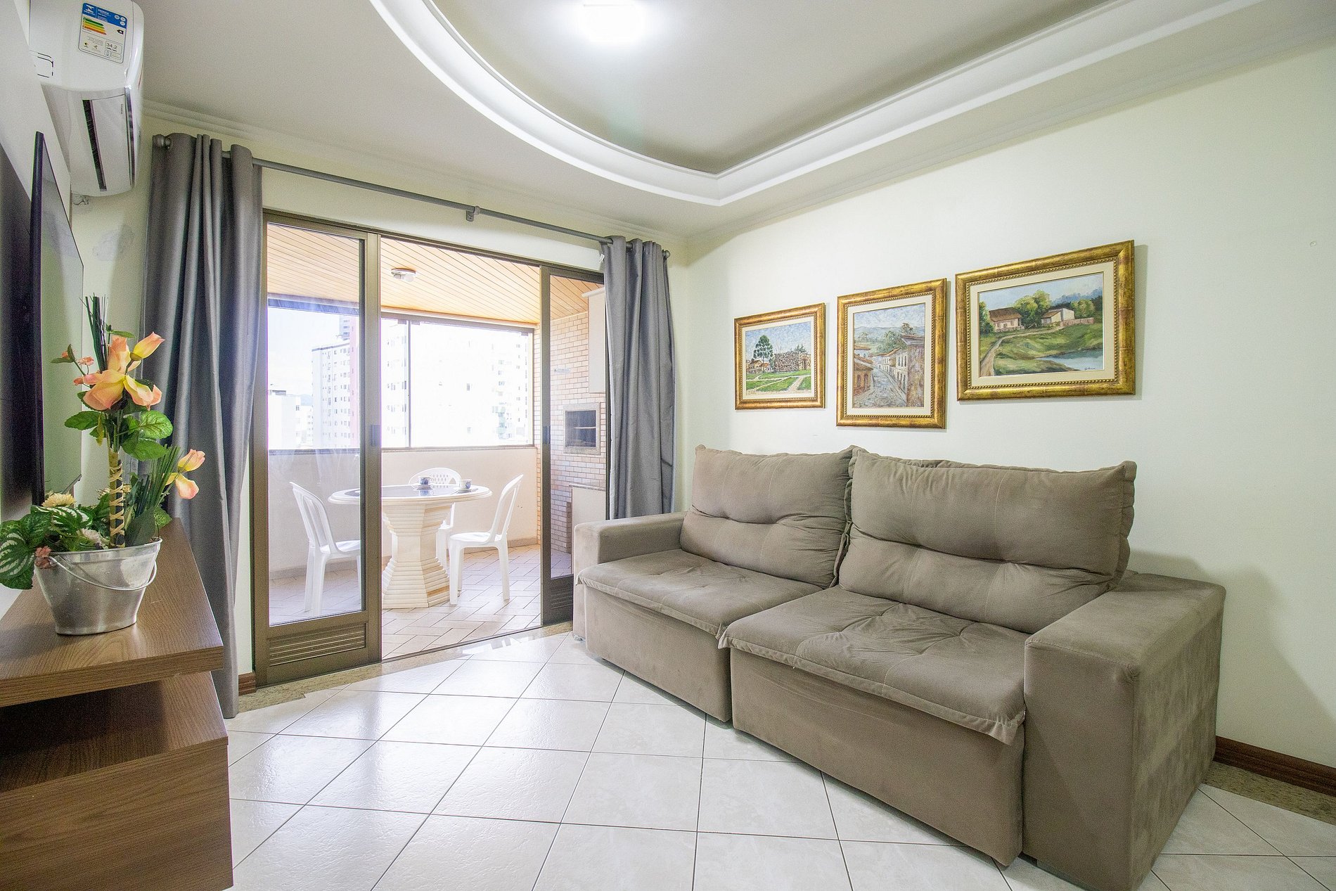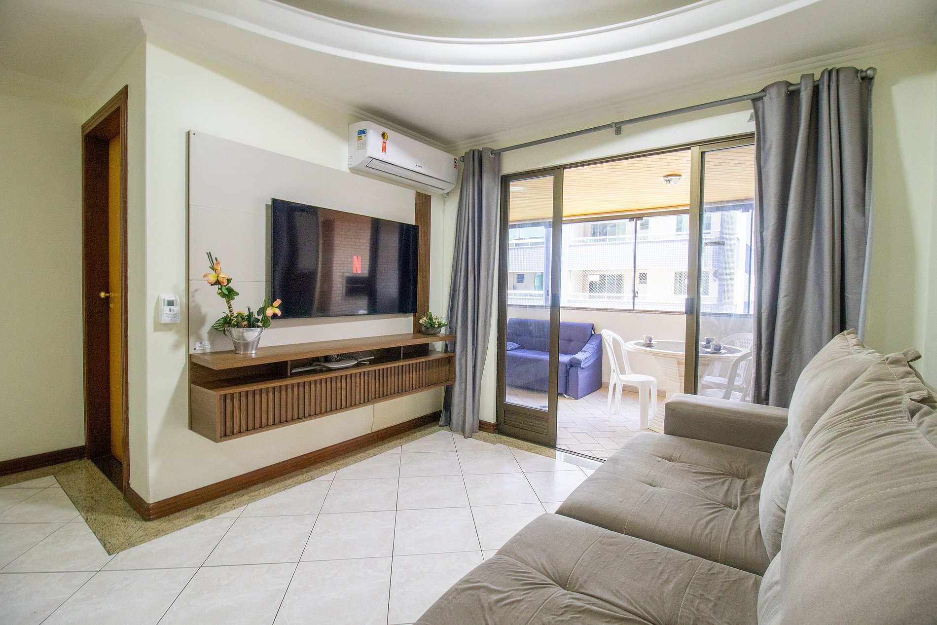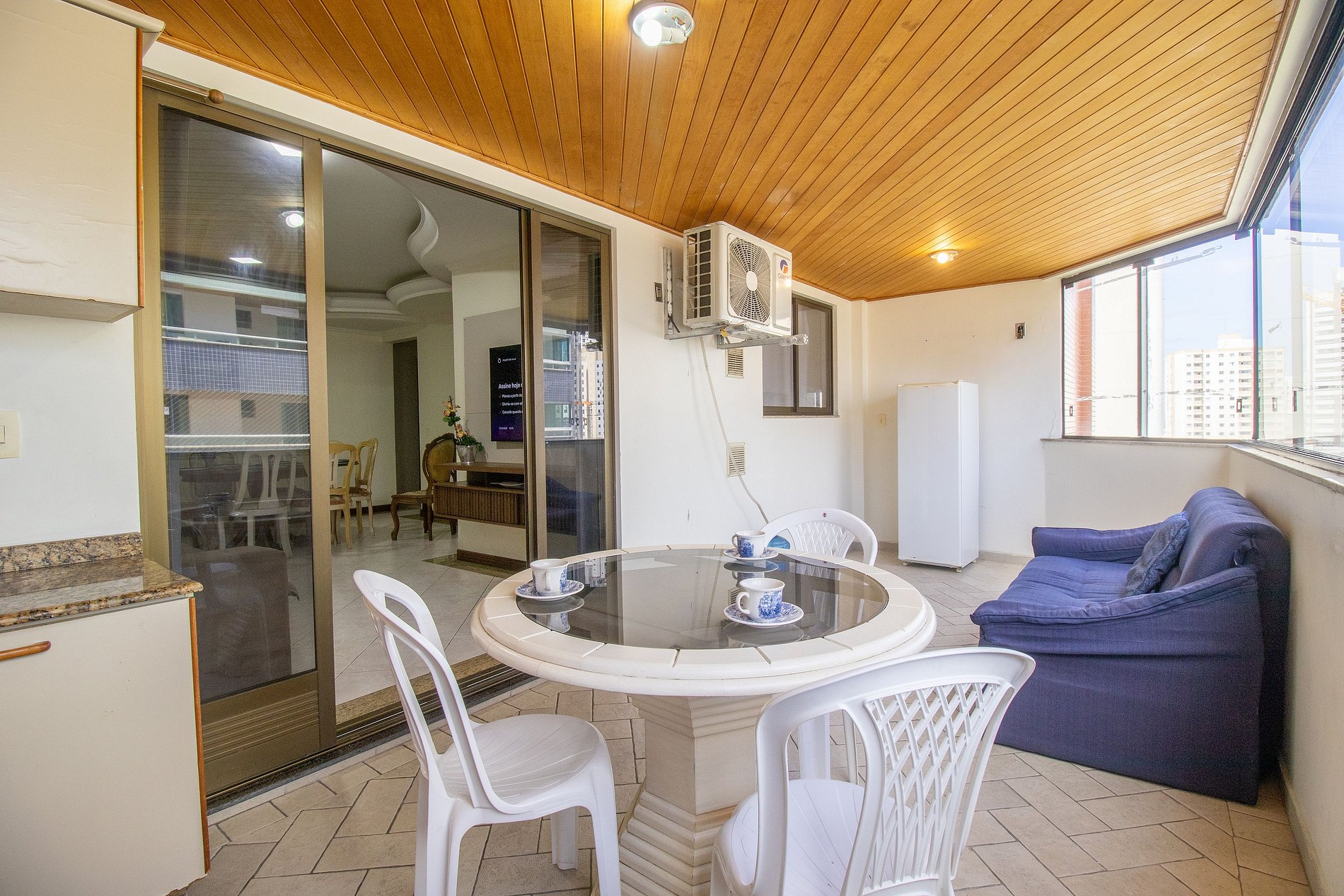 A sala é dois ambientes com mesa de jantar e sala de TV Smart, Sacada ampla fechada de vidro (que pode ser abertos) com churrasqueira, duas mesas, um sofá e uma geladeira apenas para a sacada. Uma cozinha completa com todos os utensílios para preparar as suas refeições básicas e uma lavanderia com máquina de lavar e varal.