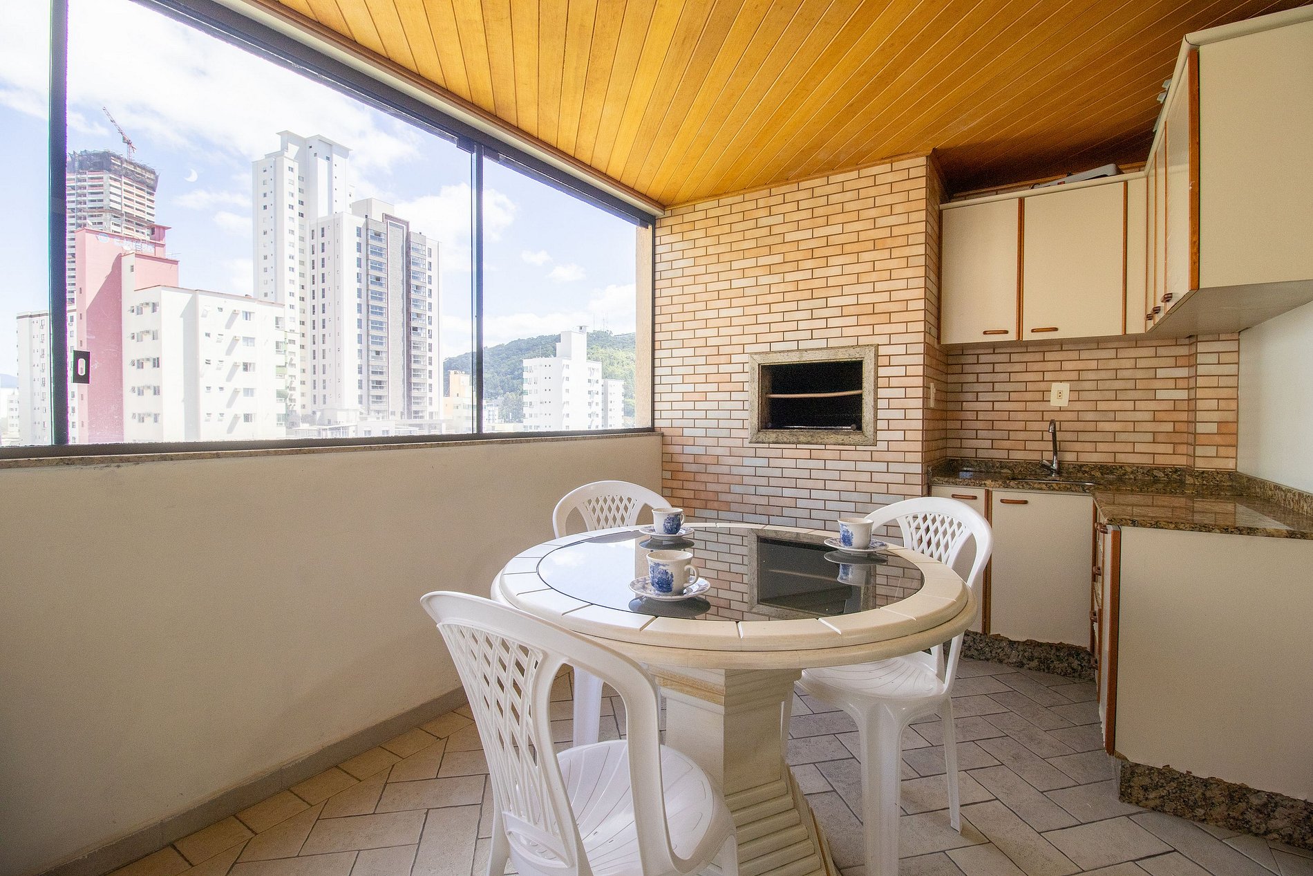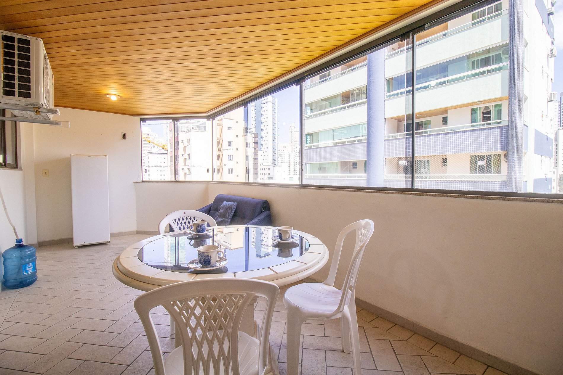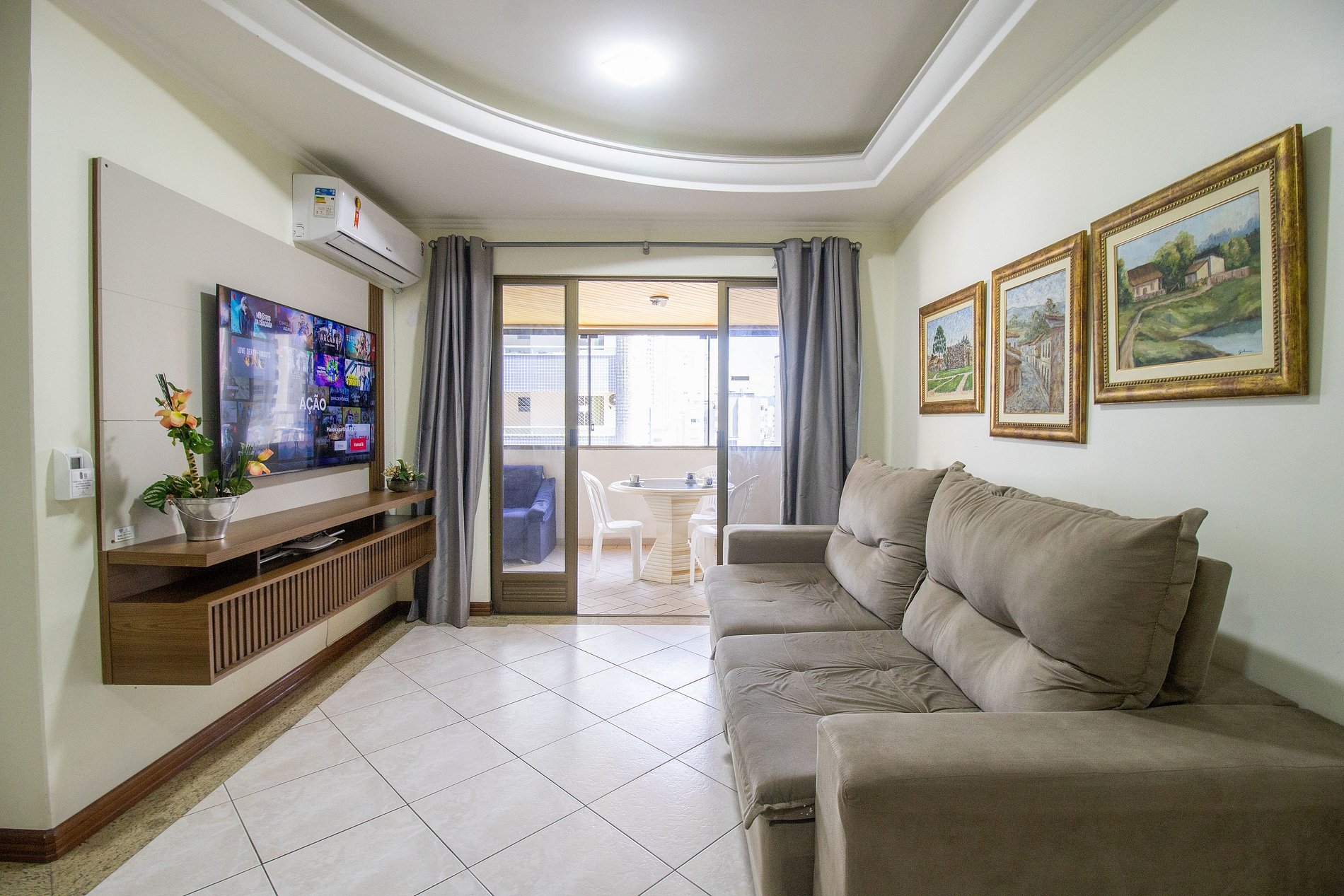 A sala é dois ambientes com mesa de jantar e sala de TV Smart, Sacada ampla fechada de vidro (que pode ser abertos) com churrasqueira, duas mesas, um sofá e uma geladeira apenas para a sacada. Uma cozinha completa com todos os utensílios para preparar as suas refeições básicas e uma lavanderia com máquina de lavar e varal.