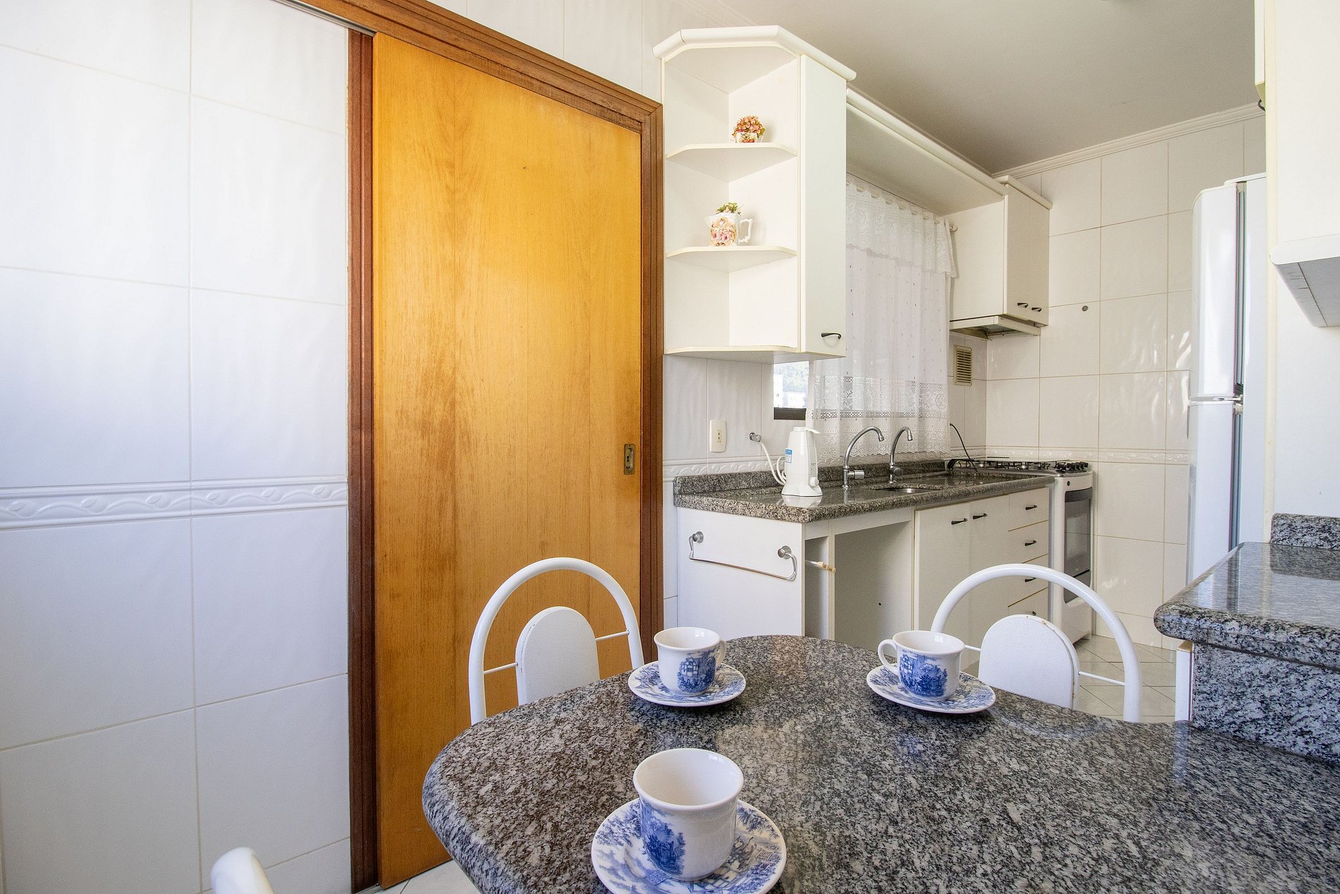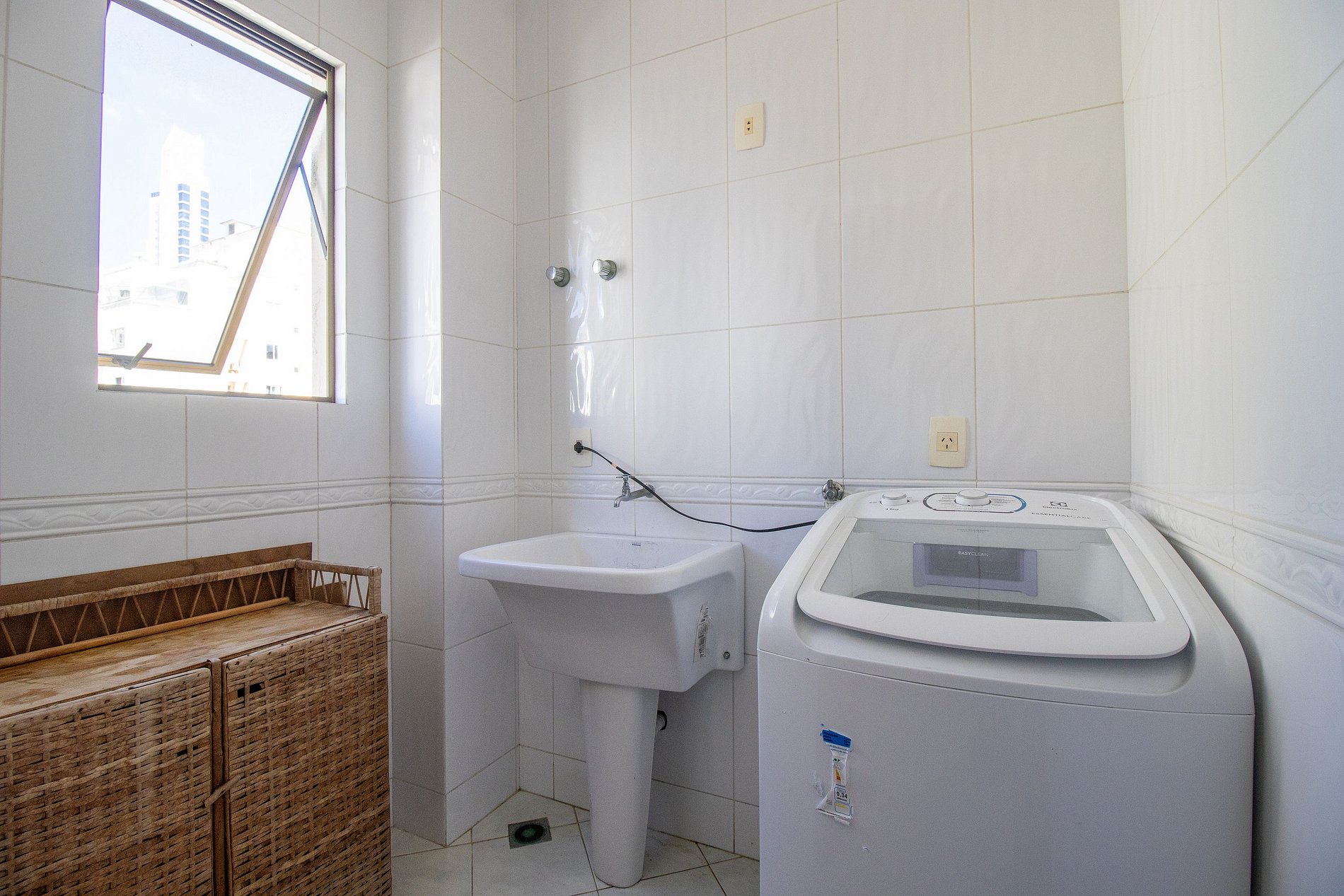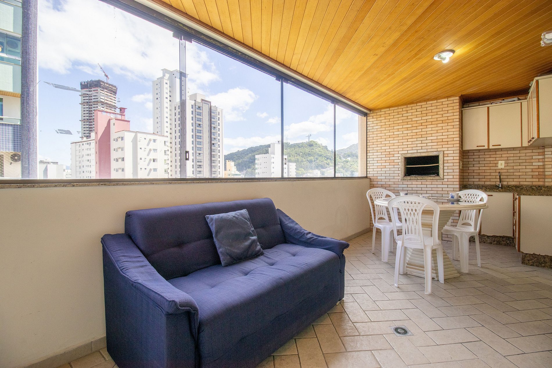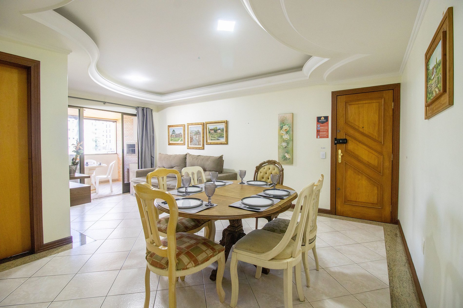 A sala é dois ambientes com mesa de jantar e sala de TV Smart, Sacada ampla fechada de vidro (que pode ser abertos) com churrasqueira, duas mesas, um sofá e uma geladeira apenas para a sacada. Uma cozinha completa com todos os utensílios para preparar as suas refeições básicas e uma lavanderia com máquina de lavar e varal.