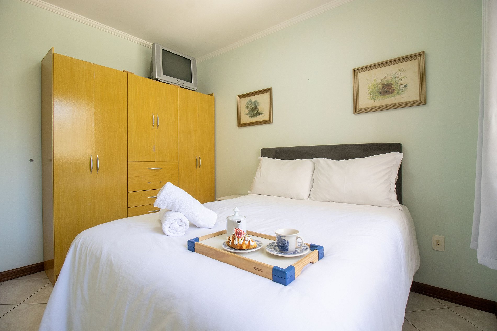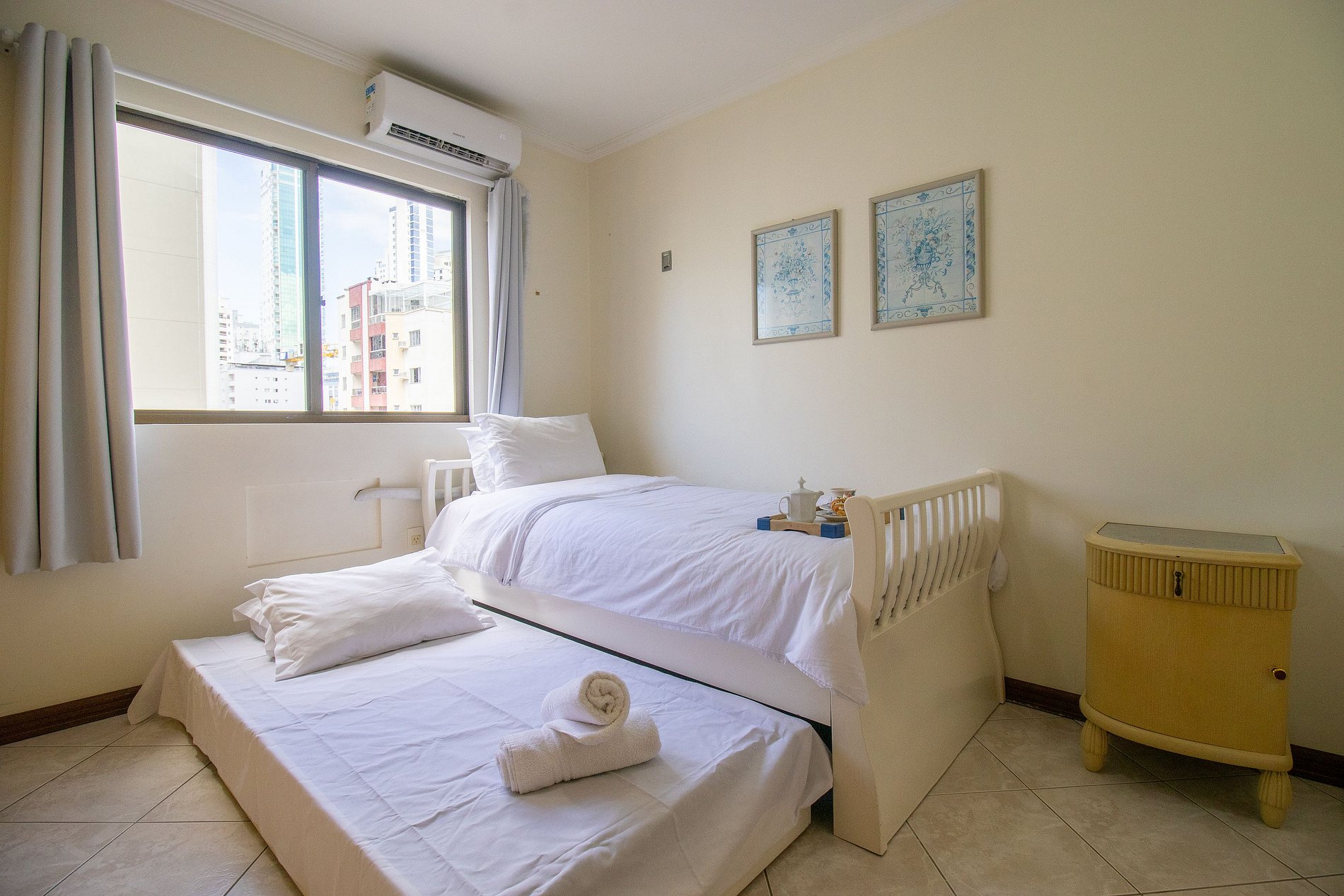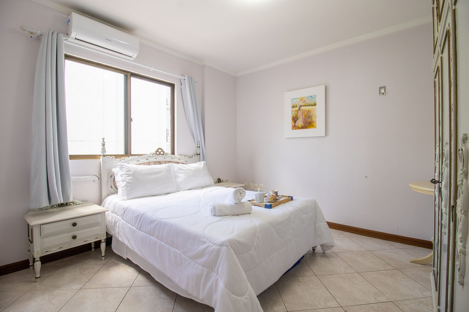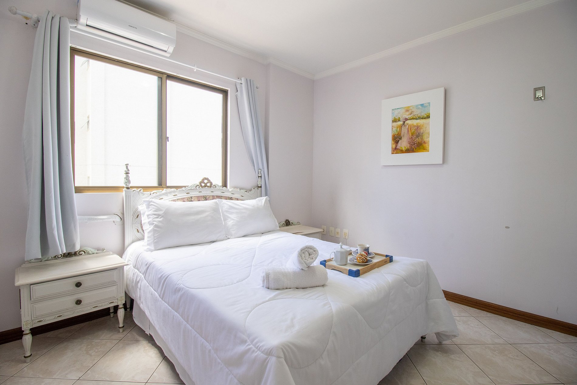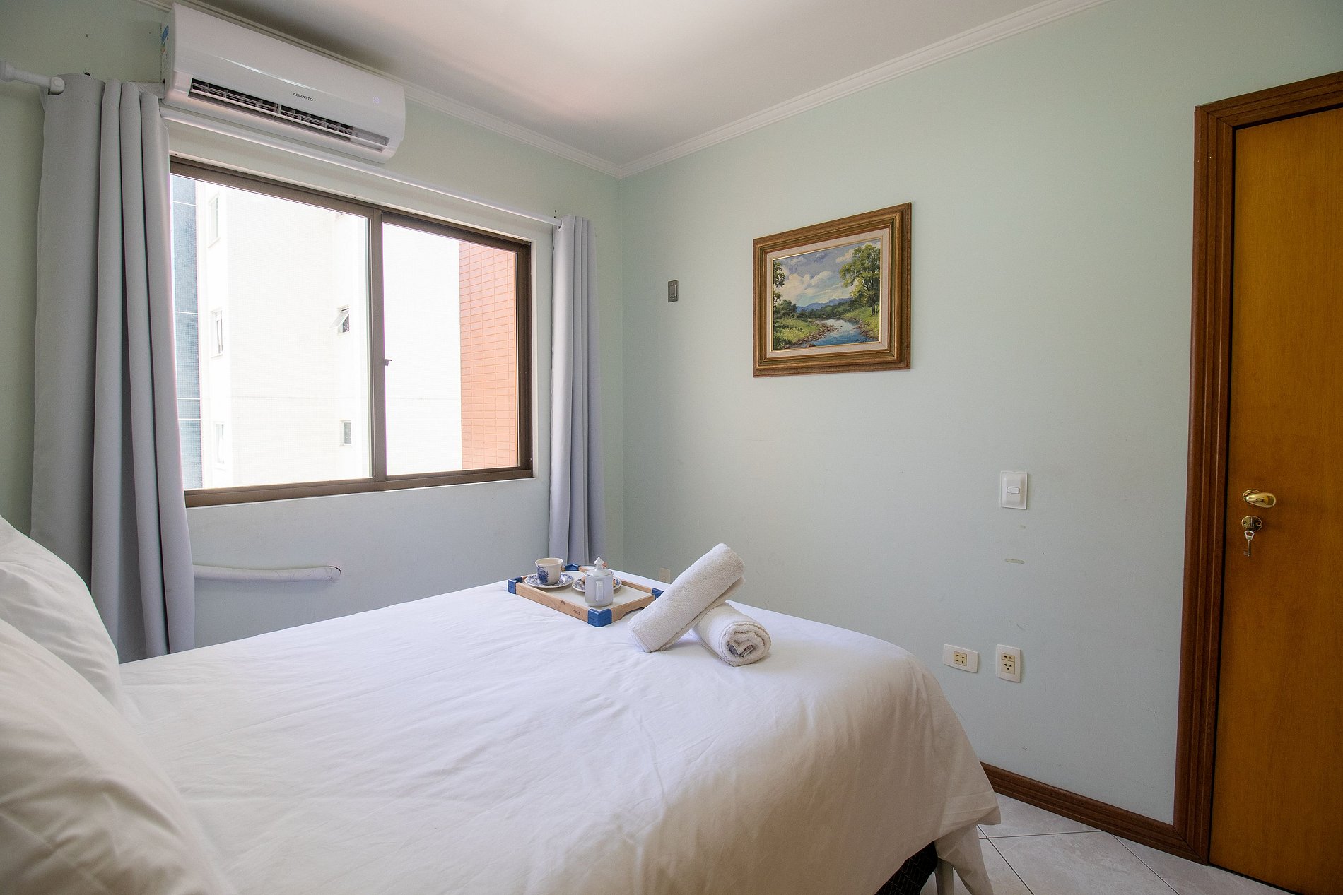 O apartamento dispõe de três dormitórios, sendo uma suíte. Esse espaço confortável possui um ambiente bem amplo e ótima iluminação natural. Ao total temos duas camas de casal de ótima qualidade, uma bicama e dois colchões de solteiro avulsos.