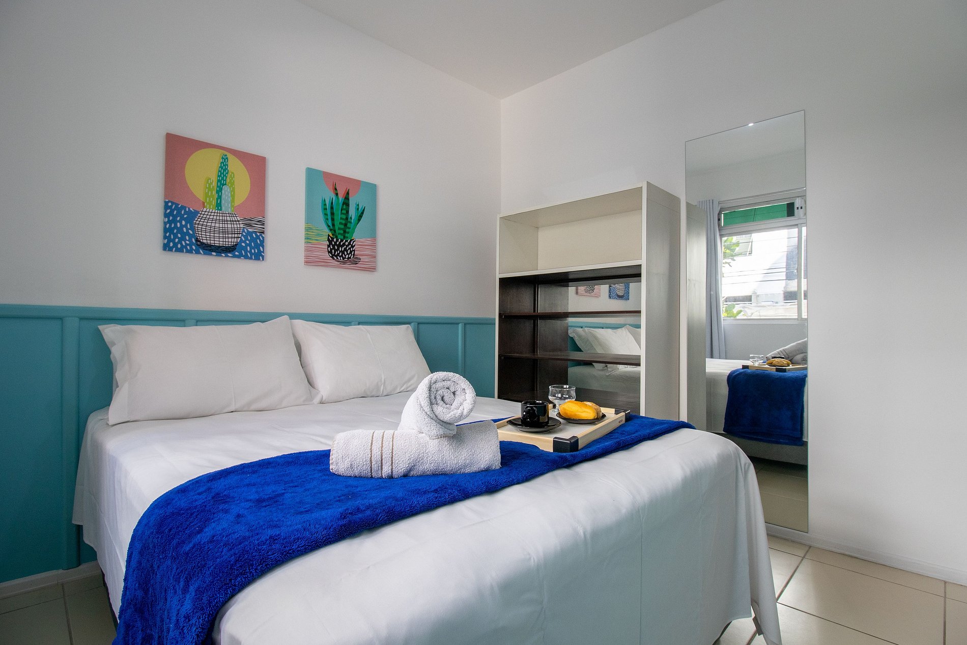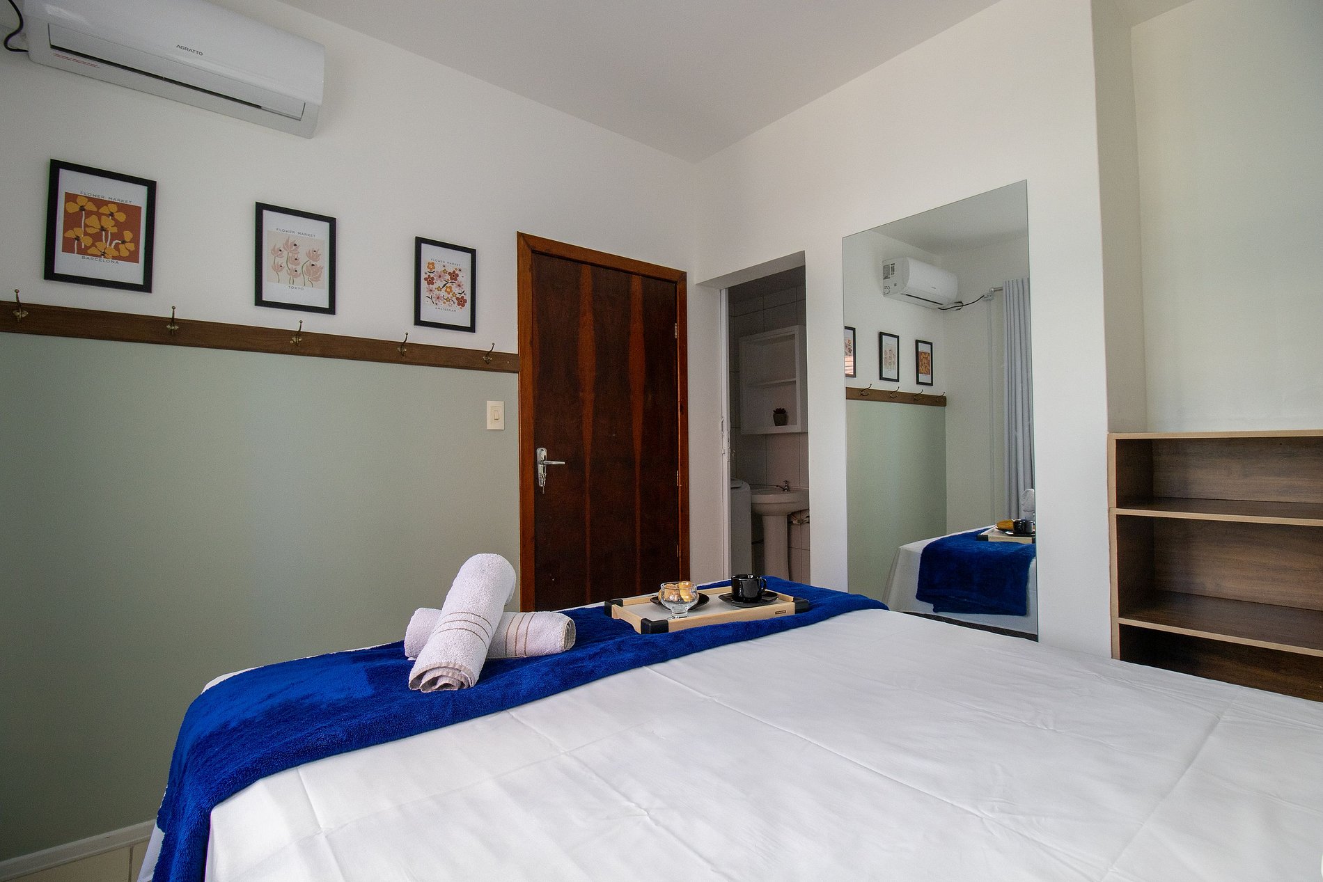 O espaço possui dois ares condicionados split, sendo um em cada dormitório.