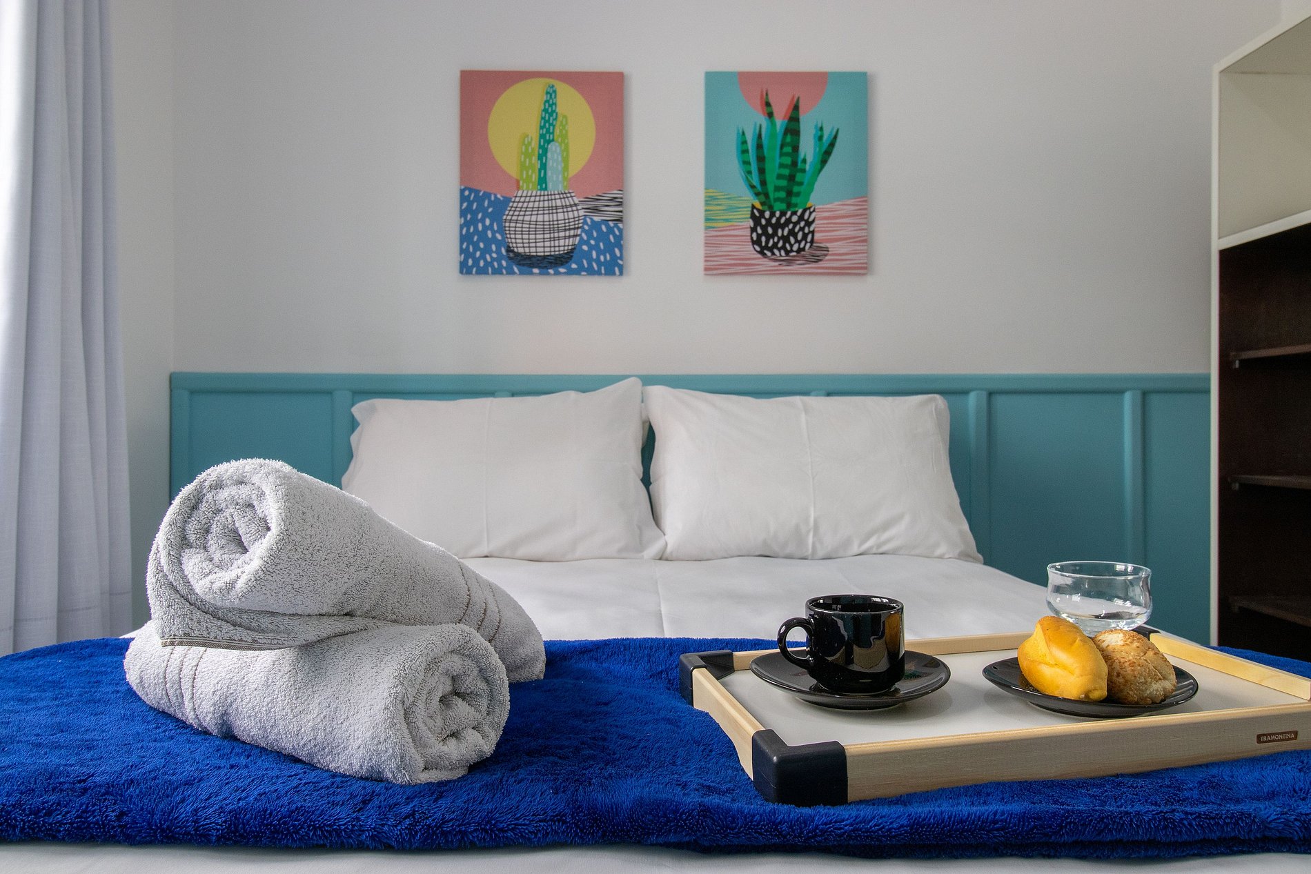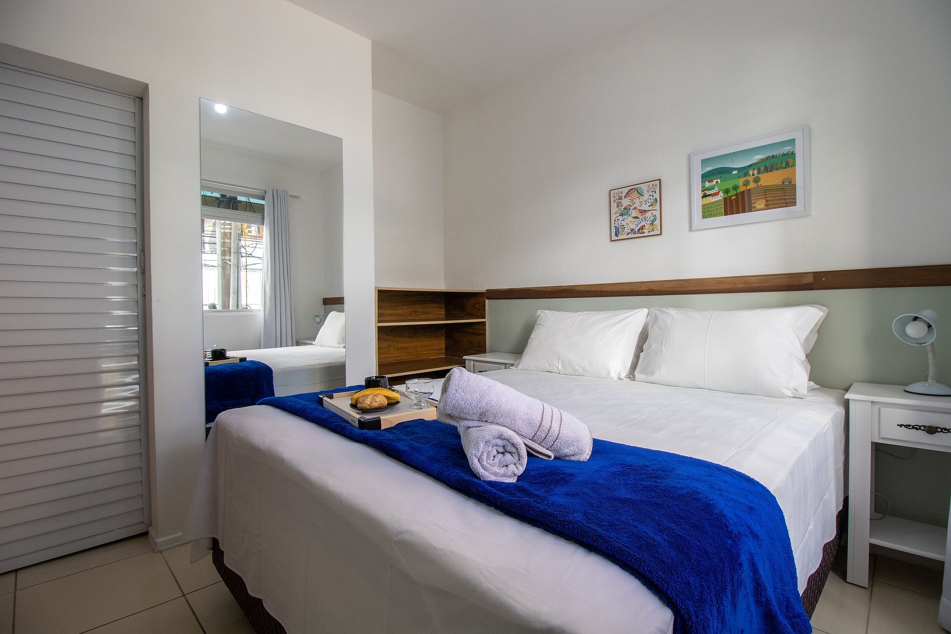 Disponibilizamos roupas de cama básica, travesseiros com fronha e uma toalha de banho por hóspede. Oferecemos um edredom para cada cama e uma manta de microfibra para o sofá-cama, garantindo seu máximo conforto.