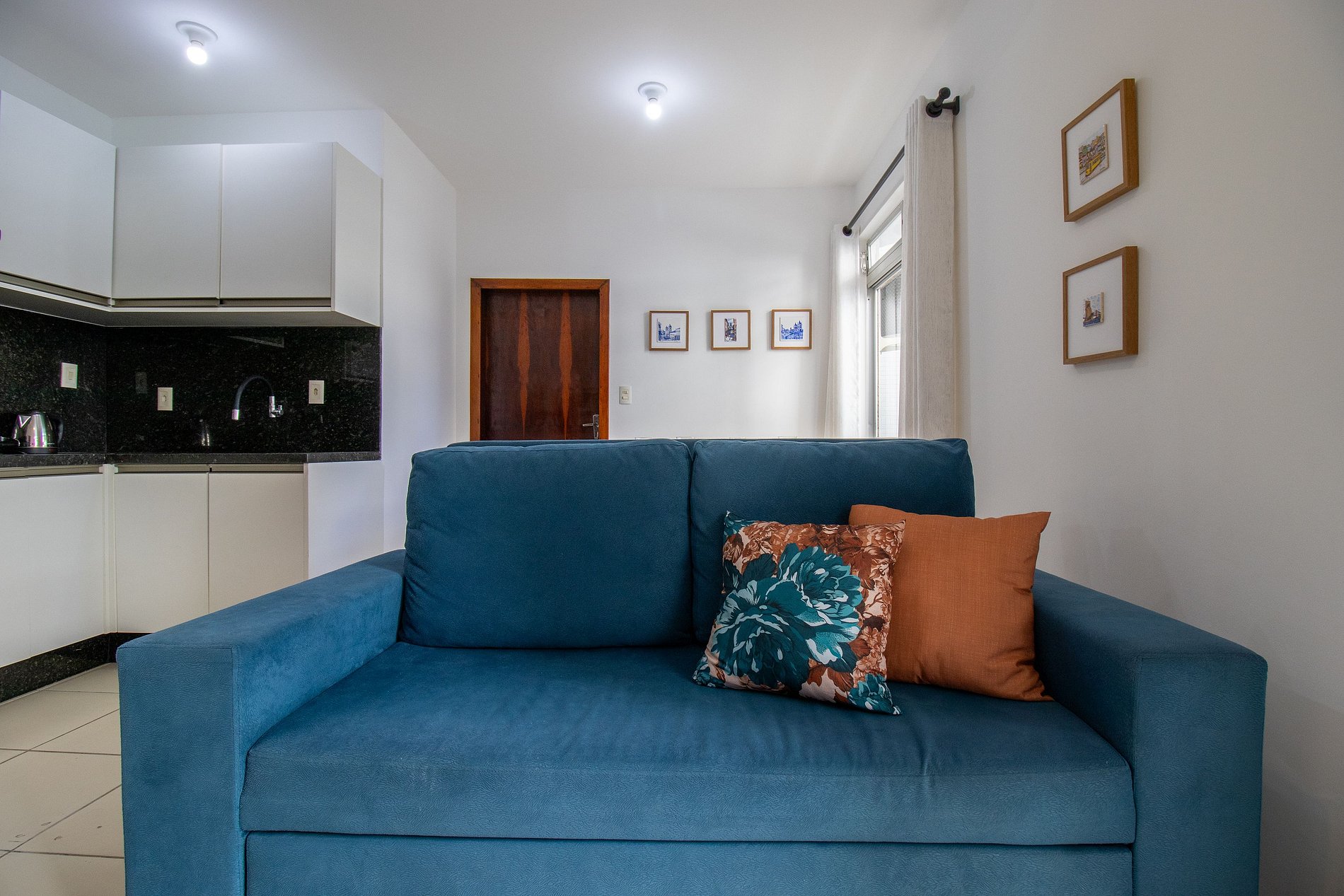 O apartamento conta com uma suíte e um dormitório, ao total temos uma cama queen, uma cama de casal e um sofá cama casal. Cozinha equipada com utensílios para o preparo de refeições básicas, microondas, liquidificador, cafeteira e sanduicheira. Sala com sófa confortável e TV Smart. Há ainda uma máquina de lavar, ferro de passar roupas e secador de cabelo.