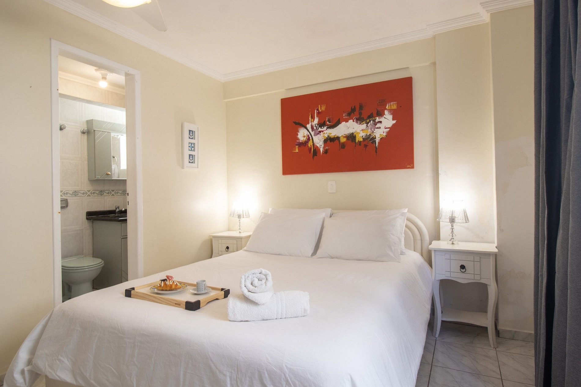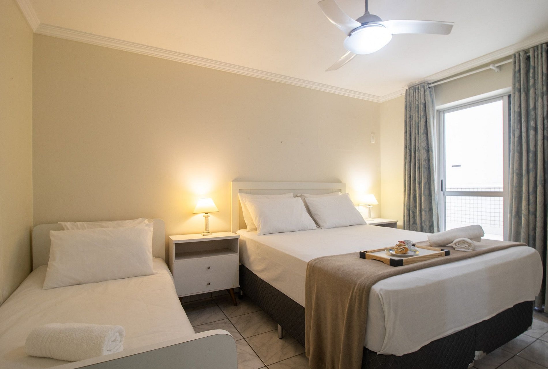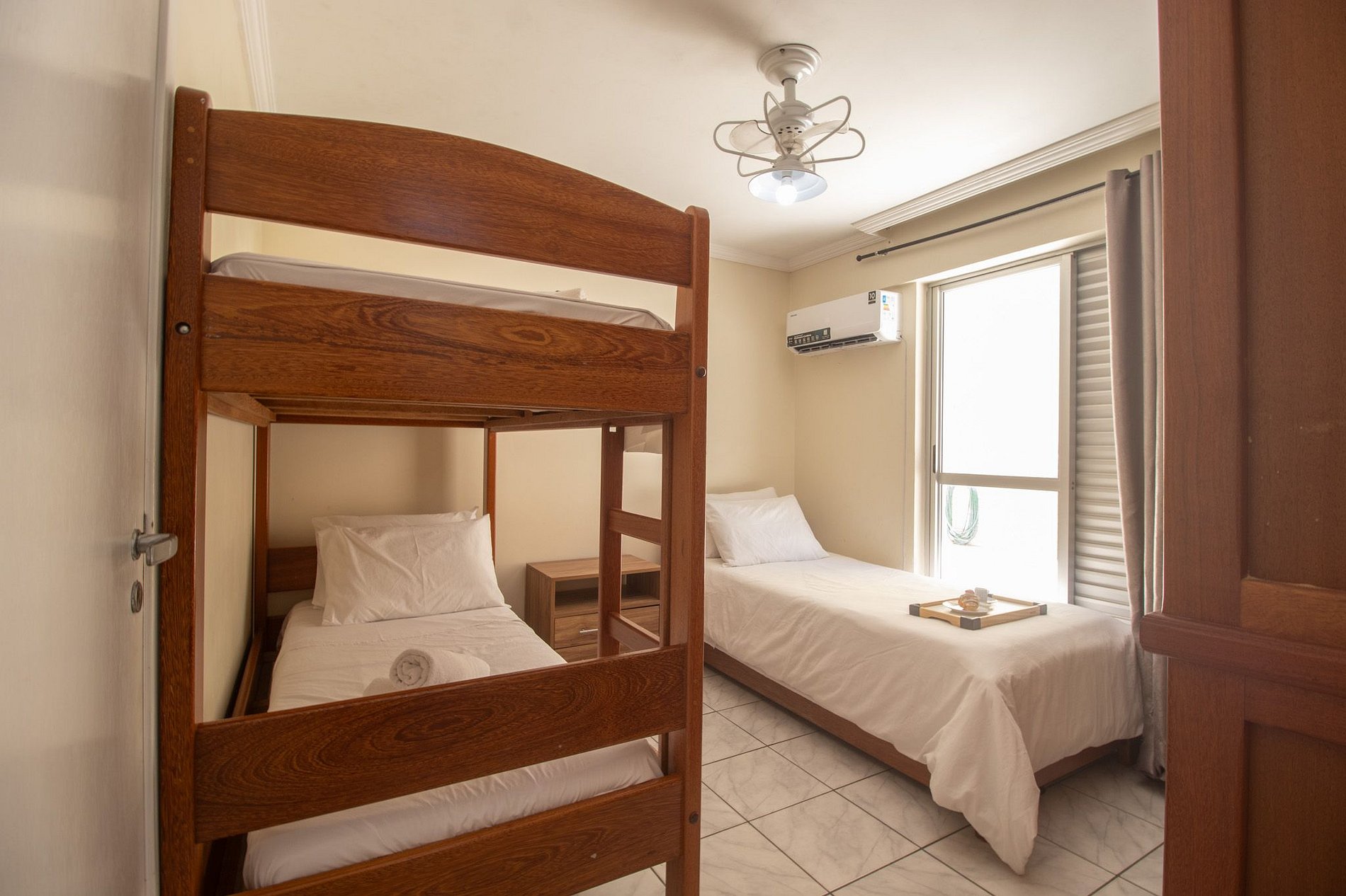Com quatro suítes e um dormitório adicional, que fica junto ao salão de festas, separado do restante do apartamento. Todos os chuveiros são elétricos. Este espaço oferece conforto e privacidade para seus hóspedes. O apartamento conta com uma cama queen, duas camas de casal, quatro camas de solteiro e um beliche. A sala conta com sofá e TV para entretenimento com acesso aos canais abertos. Uma cozinha equipada para realizar as refeições básicas e a área de serviço com máquina de lavar, varal para secar as roupas, ferro de passar e secador de cabelos.