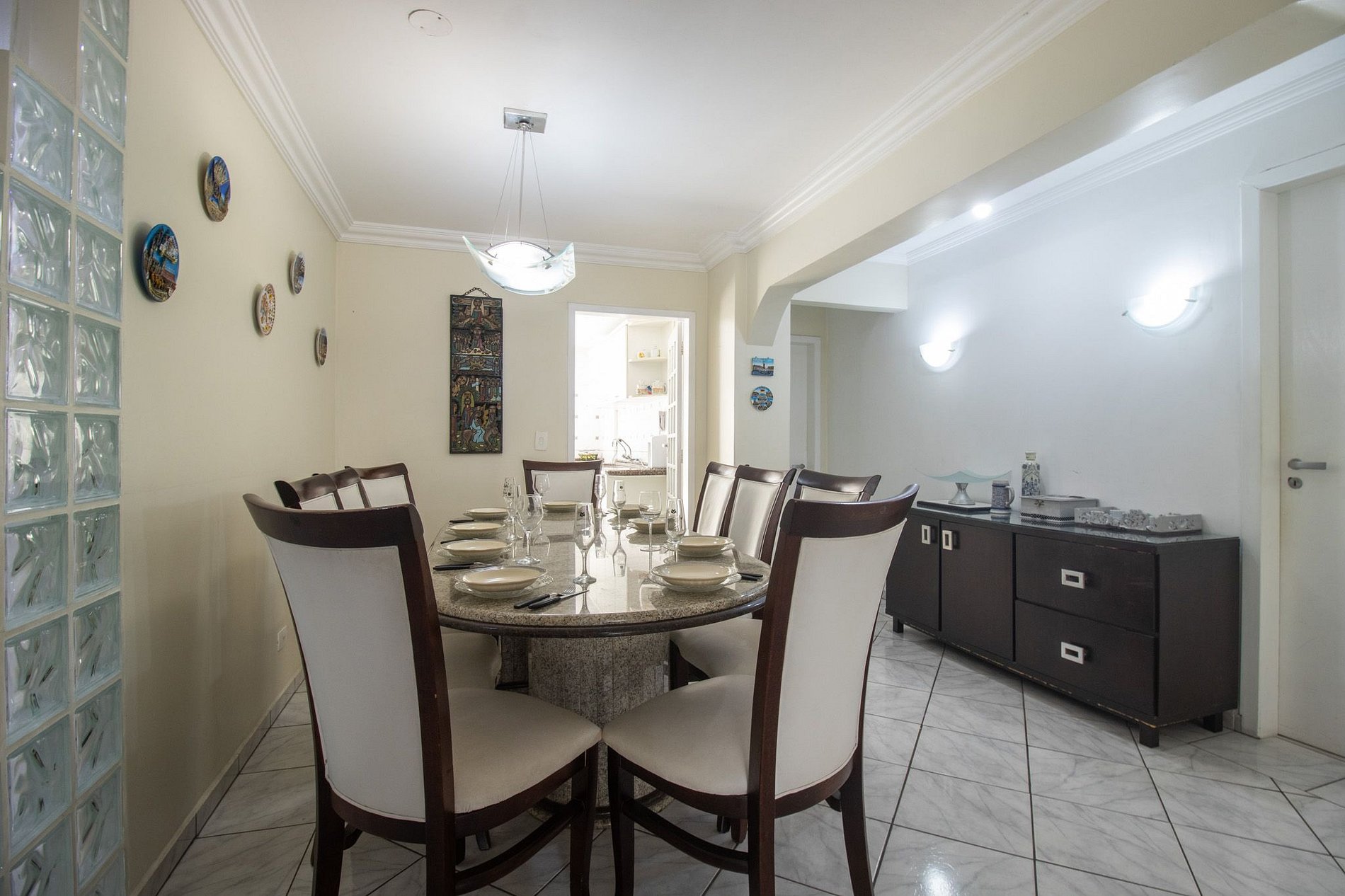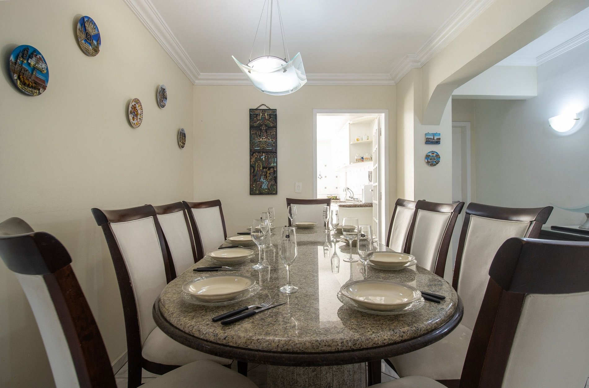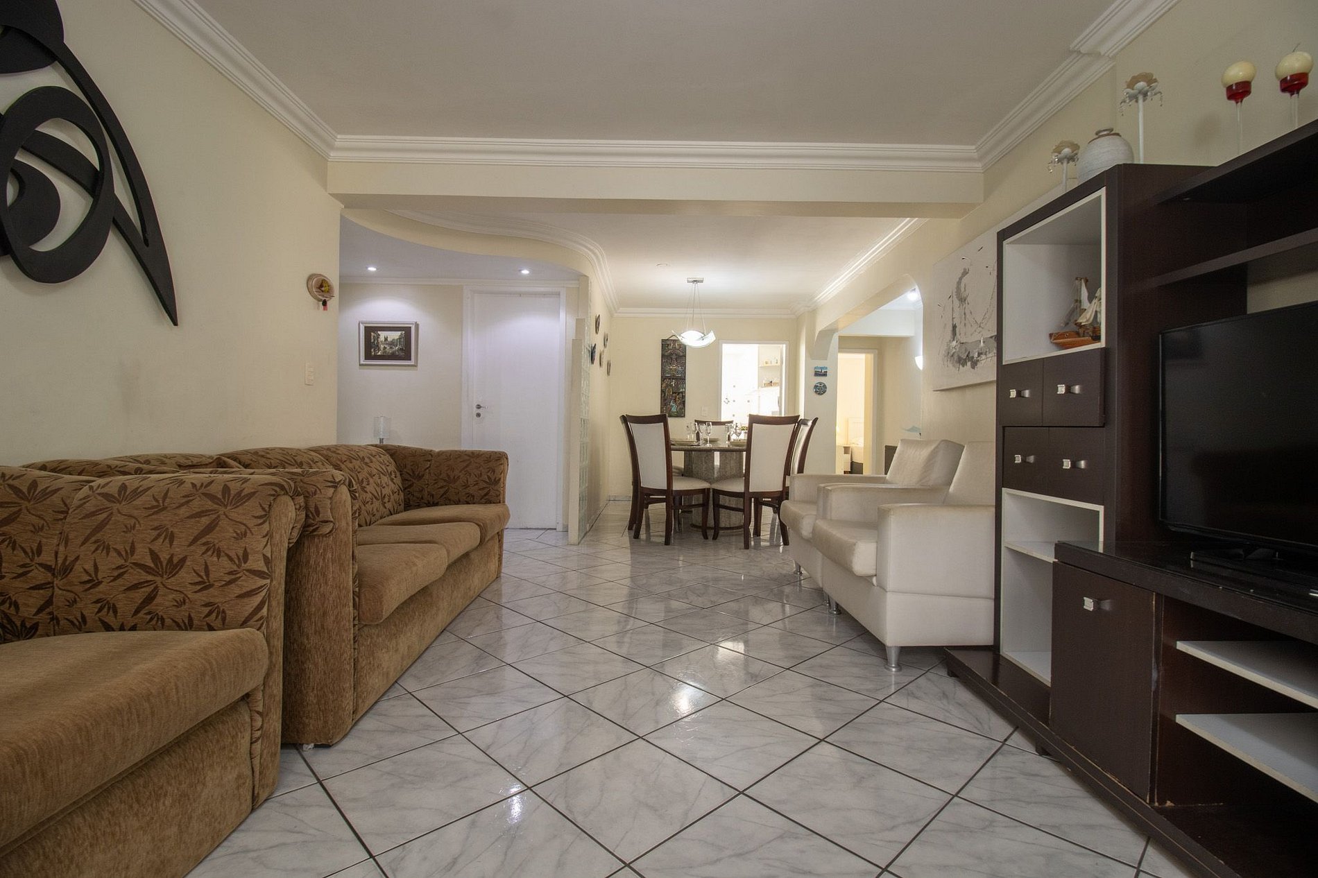 Com quatro suítes e um dormitório adicional, que fica junto ao salão de festas, separado do restante do apartamento. Todos os chuveiros são elétricos. Este espaço oferece conforto e privacidade para seus hóspedes. O apartamento conta com uma cama queen, duas camas de casal, quatro camas de solteiro e um beliche. A sala conta com sofá e TV para entretenimento com acesso aos canais abertos. Uma cozinha equipada para realizar as refeições básicas e a área de serviço com máquina de lavar, varal para secar as roupas, ferro de passar e secador de cabelos.