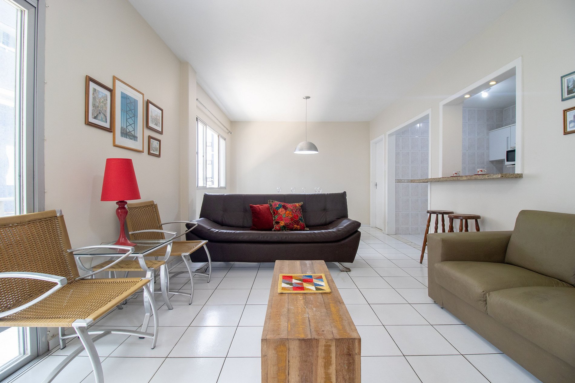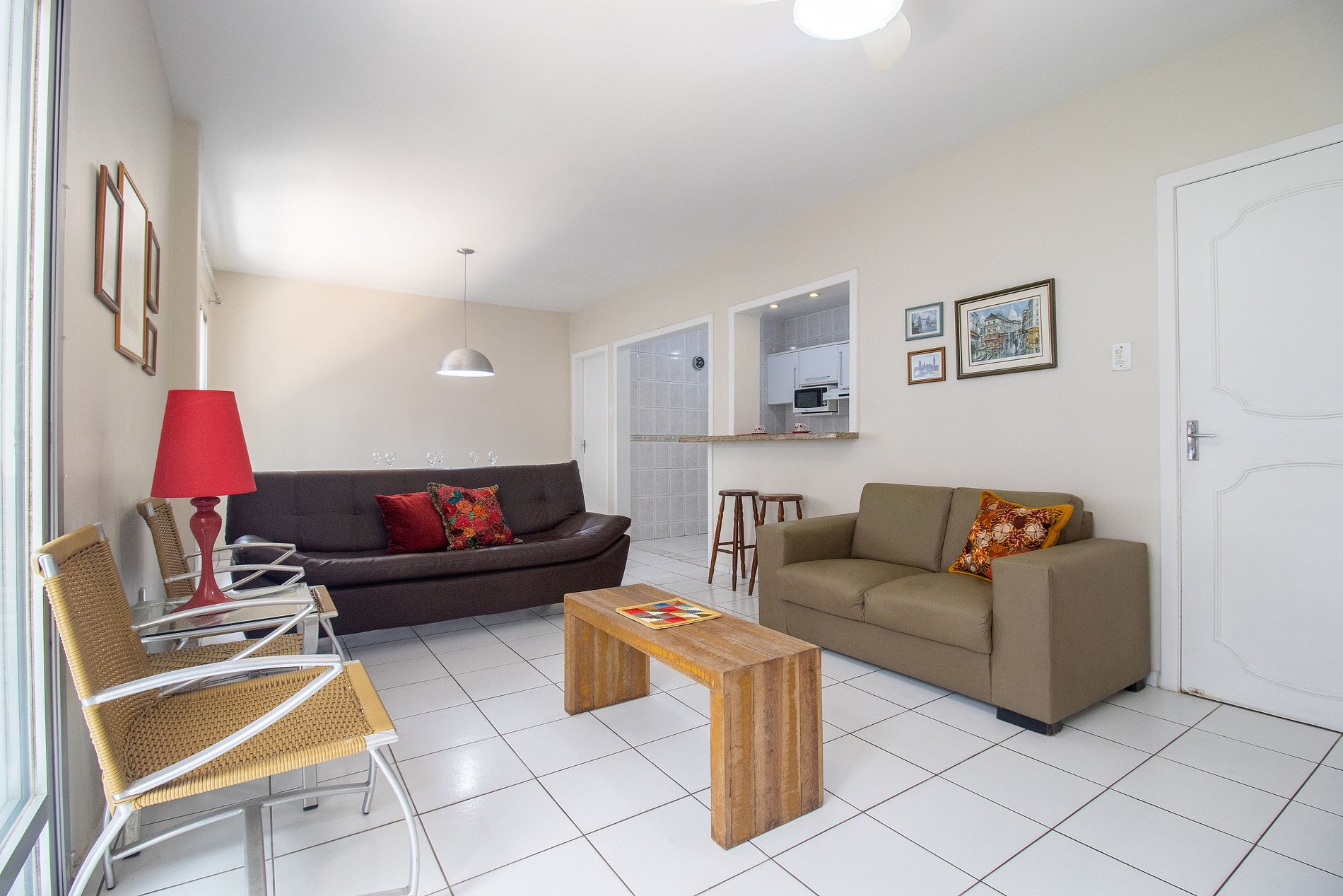 O apartamento conta com dois dormitórios e uma suíte climatizados. Ao total são duas camas de casal, duas bases de cama de solteiro unidas que formam uma cama queen, e mais dois colchões de solteiro avulsos. Sala e cozinha integradas, TV Smart e sofá confortável. Cozinha equipada com utensílios para o preparo de refeições básicas, microondas, cafeiteira, liquidificador e sanduicheira. Área de serviço com máquina de lavar e local para secar roupas, temos também ferrro de passar roupa e secador de cabelo. Oferecemos um edredom para cada cama e uma manta de microfibra para cada colchão avulso, garantindo seu máximo conforto.