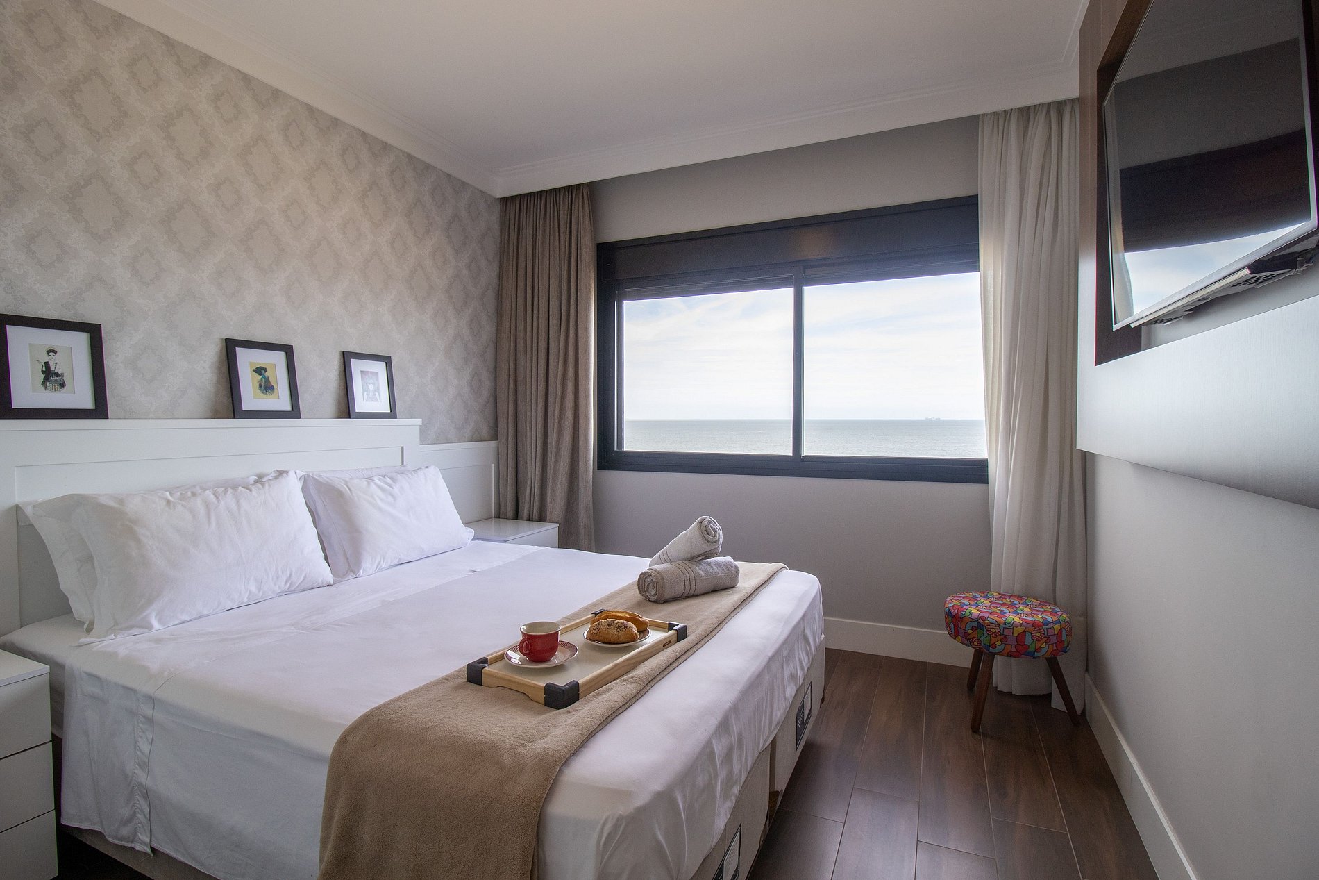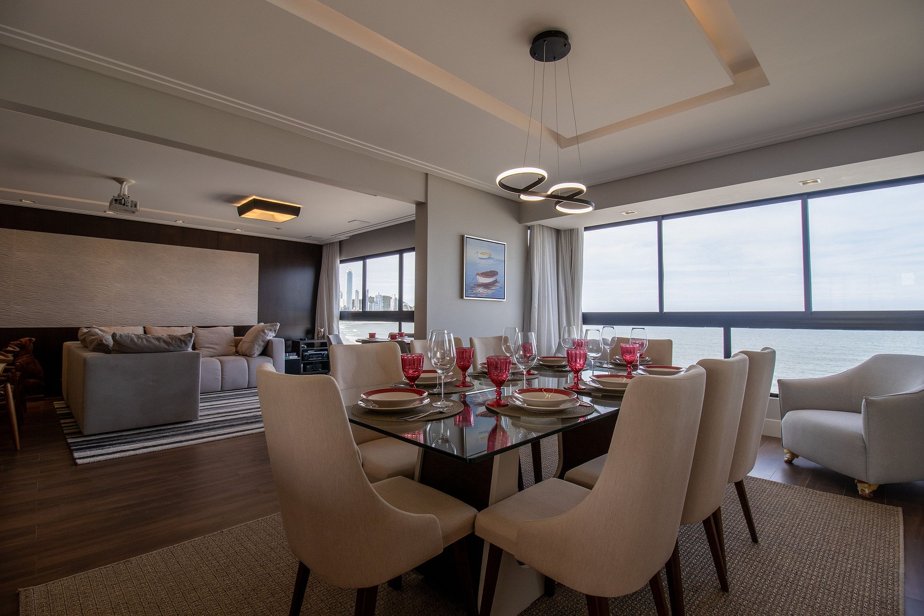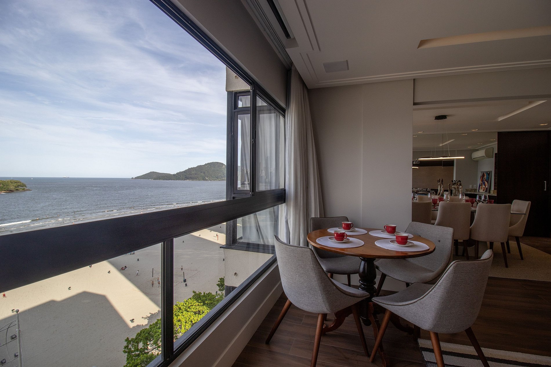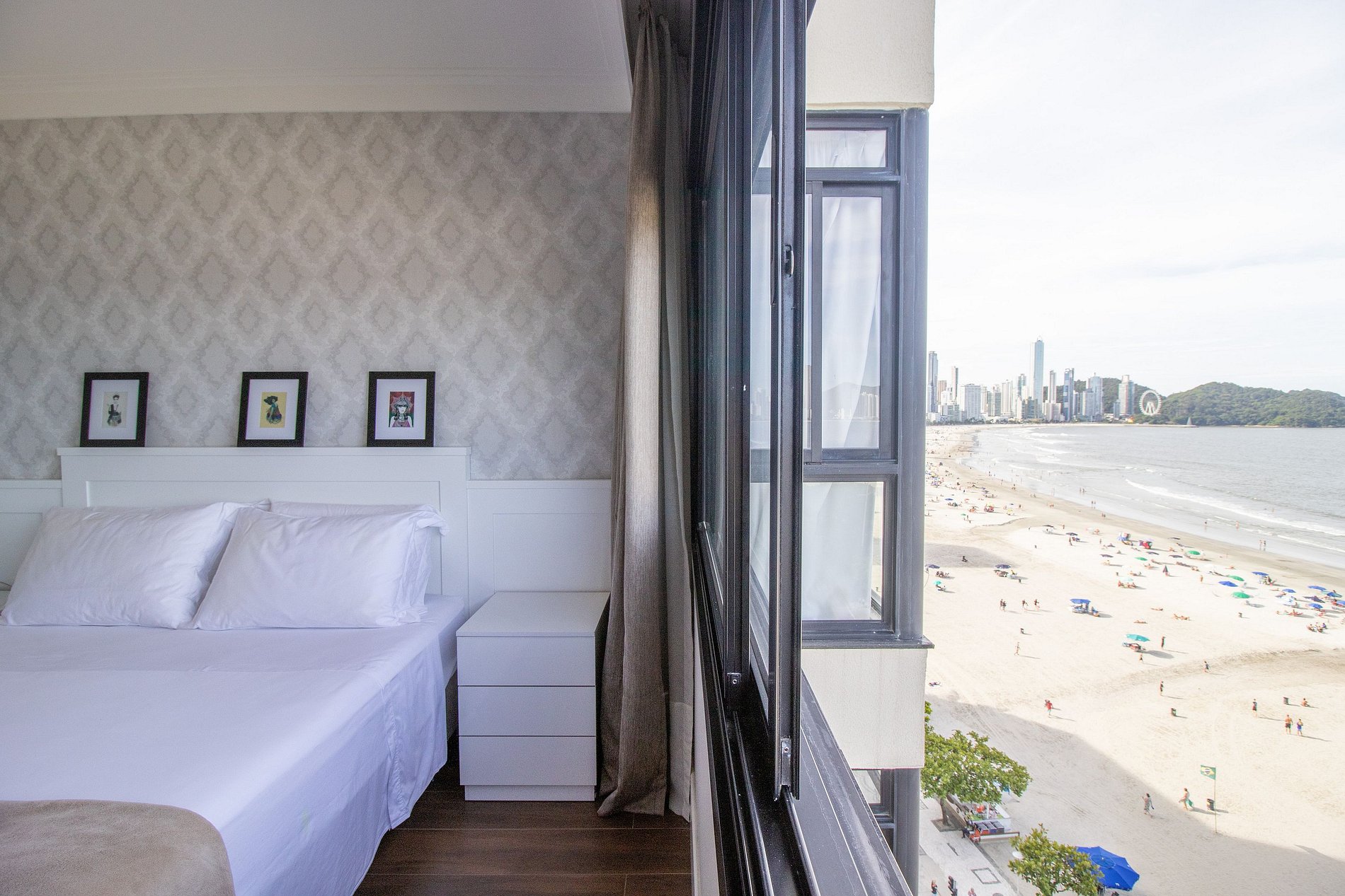 Esse apartamento fica na melhor localização da cidade, na esquina com o Calçadão Central e de frente para o mar com uma vista espetacular da orla de Balneário Camboriú. O espaço é totalmente climatizado, há ar condicionado em dois dormitórios, na sala de jantar e sala de estar, ao total temos uma cama king, duas camas queen, uma cama de solteiro e um colchão de solteiro avulso, acomodando facilmente oito pessoas. Além disso, há TV Smart em todos os dormitórios e um projetor na sala de estar!