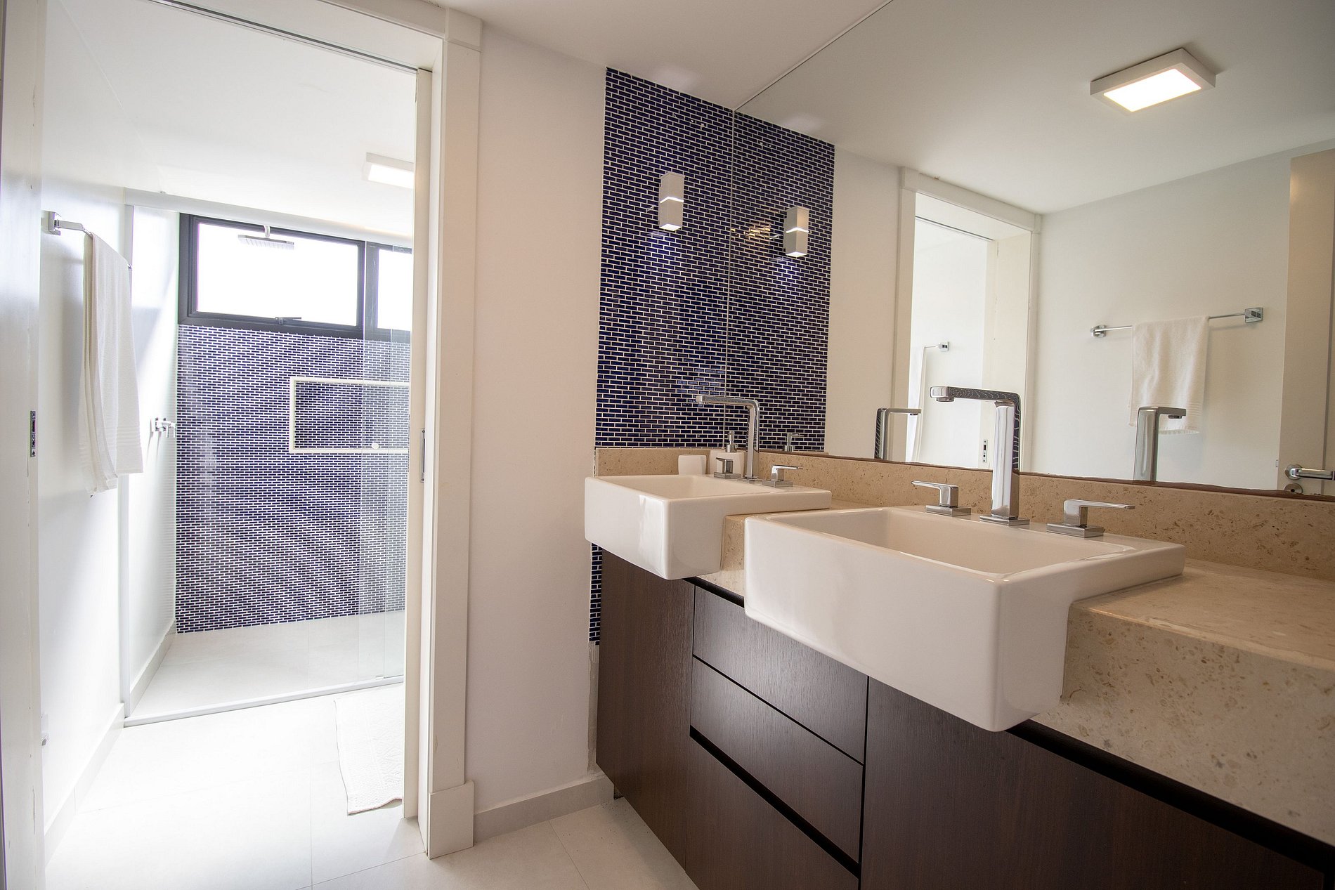 Sobre os banheiros: Há um banheiro com dois chuveiros no box, um banheiro apenas com vaso sanitário e pia e um terceiro banheiro apenas com chuveiro.