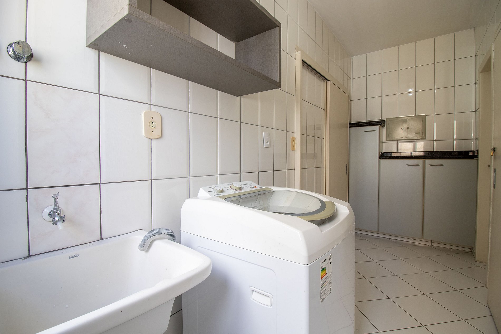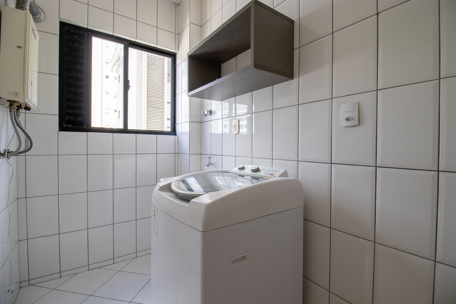 Cozinha completa com todos os utensílios para cozinhar, lavanderia com máquina lava e seca.
