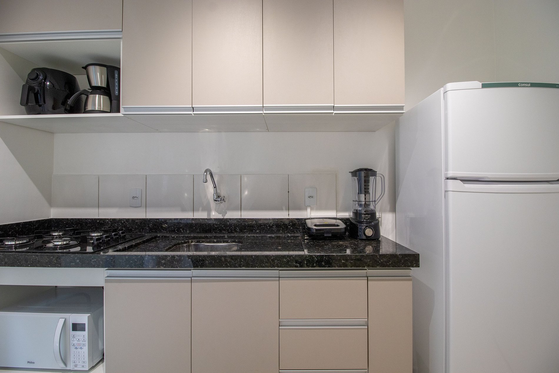 O apartamento possui uma suíte com uma cama queen e um colchão de solteiro avulso. Cozinha equipada com utensílios para o preparo de refeições básicas, liquidificador, microondas, sanduicheira e cafeteira. Temos também ferro de passar roupa e secador de cabelos.