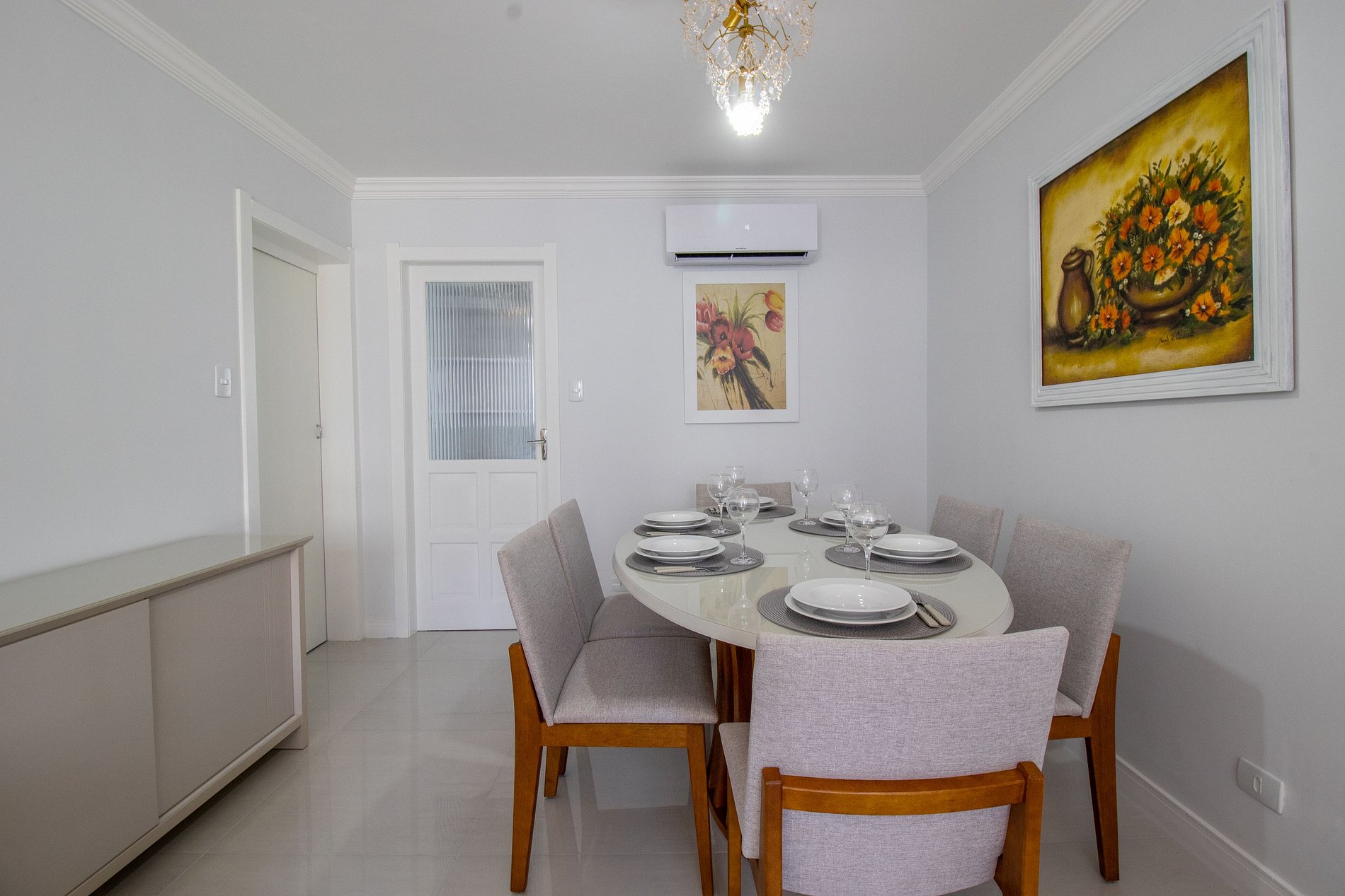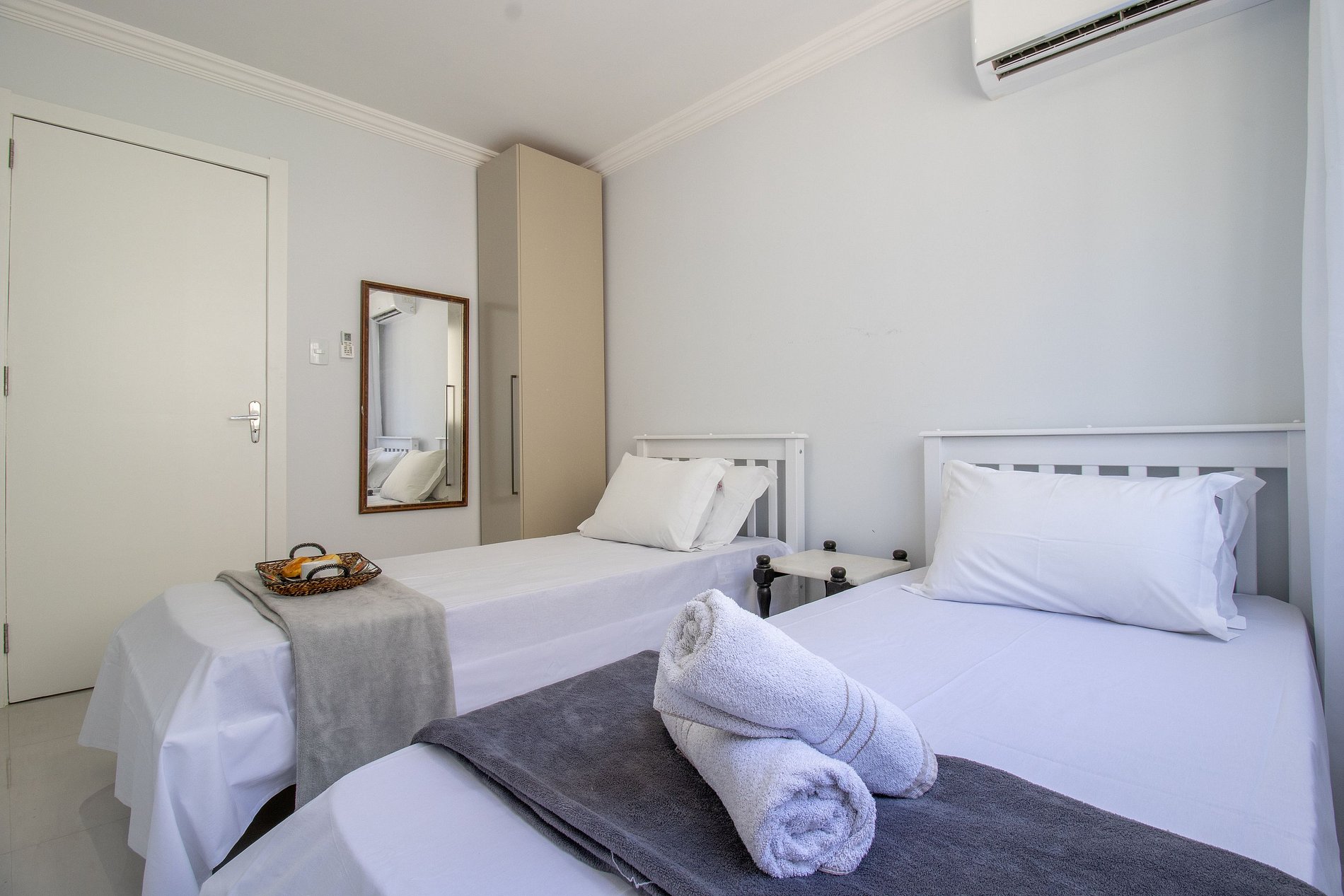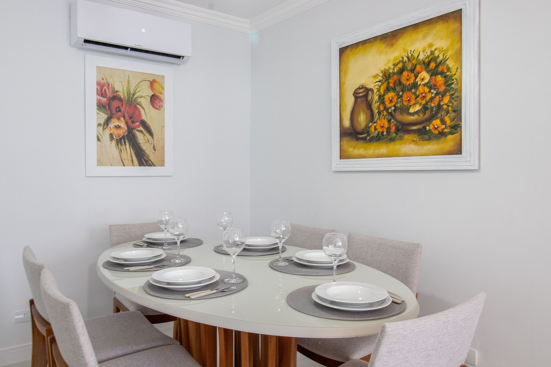 Há quatro aparelhos de ar-condicionado, um em cada dormitório e na sala. Há dois ares com os modos quente e frio (de um dormitório e da suíte), e outros dois somente com a função de refrigeração (da sala e de um dos dormitórios).