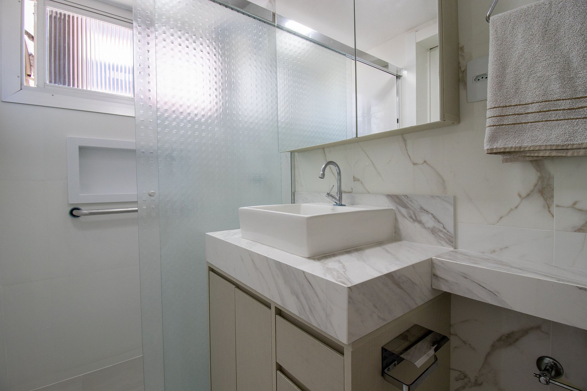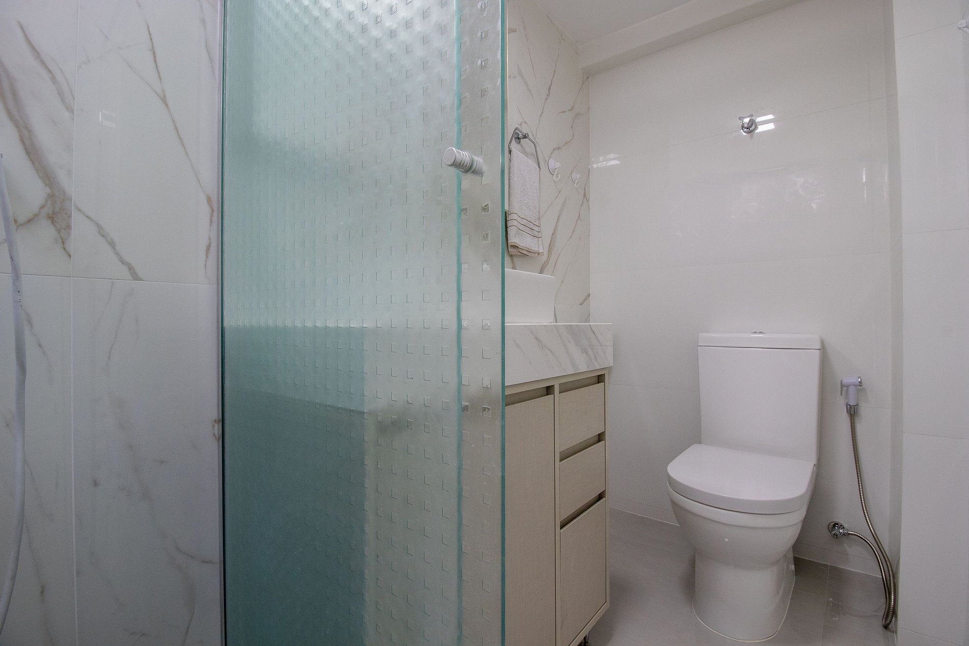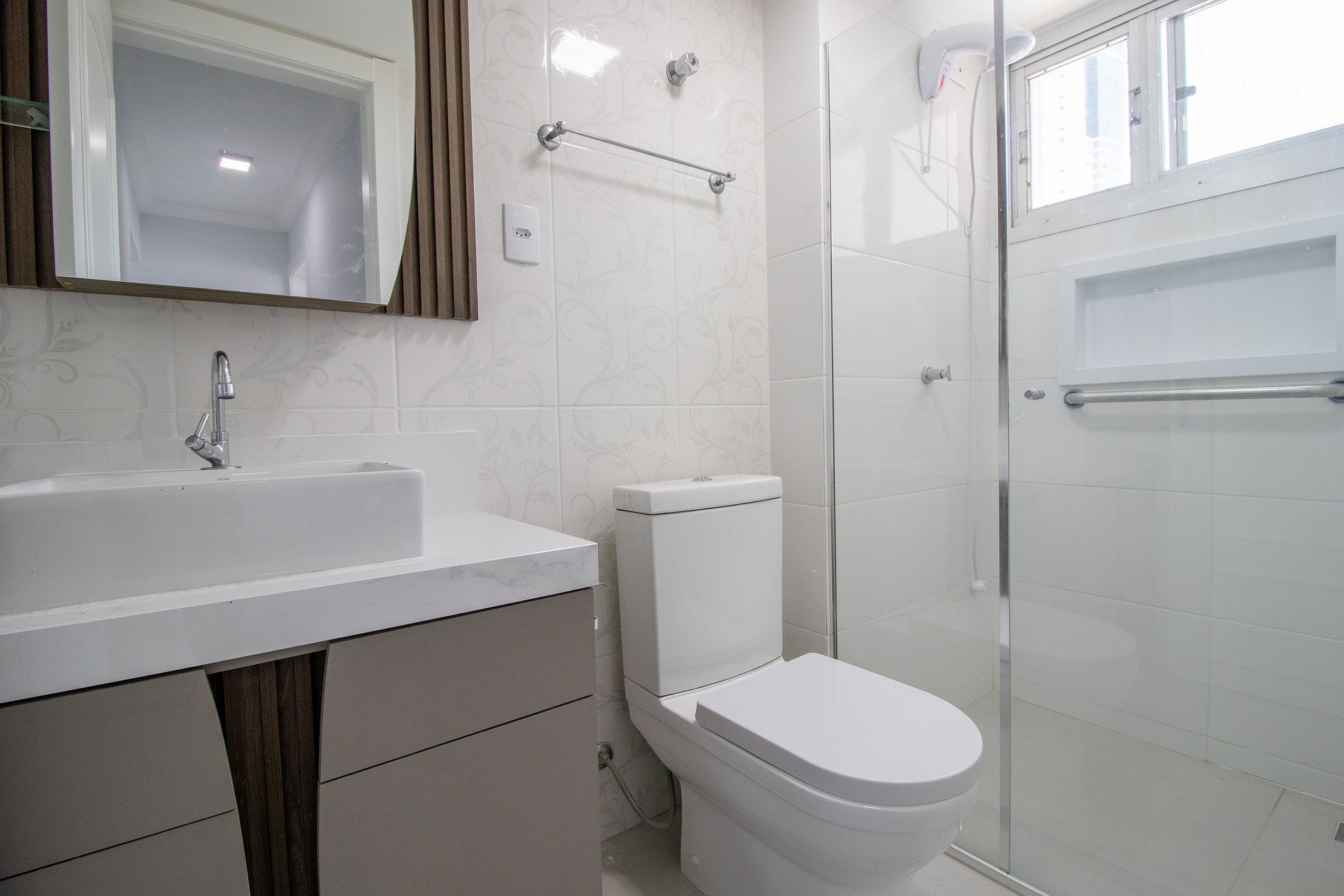 O apartamento dispõe de três dormitórios, sendo uma suíte e um banheiro social com chuveiros elétricos.