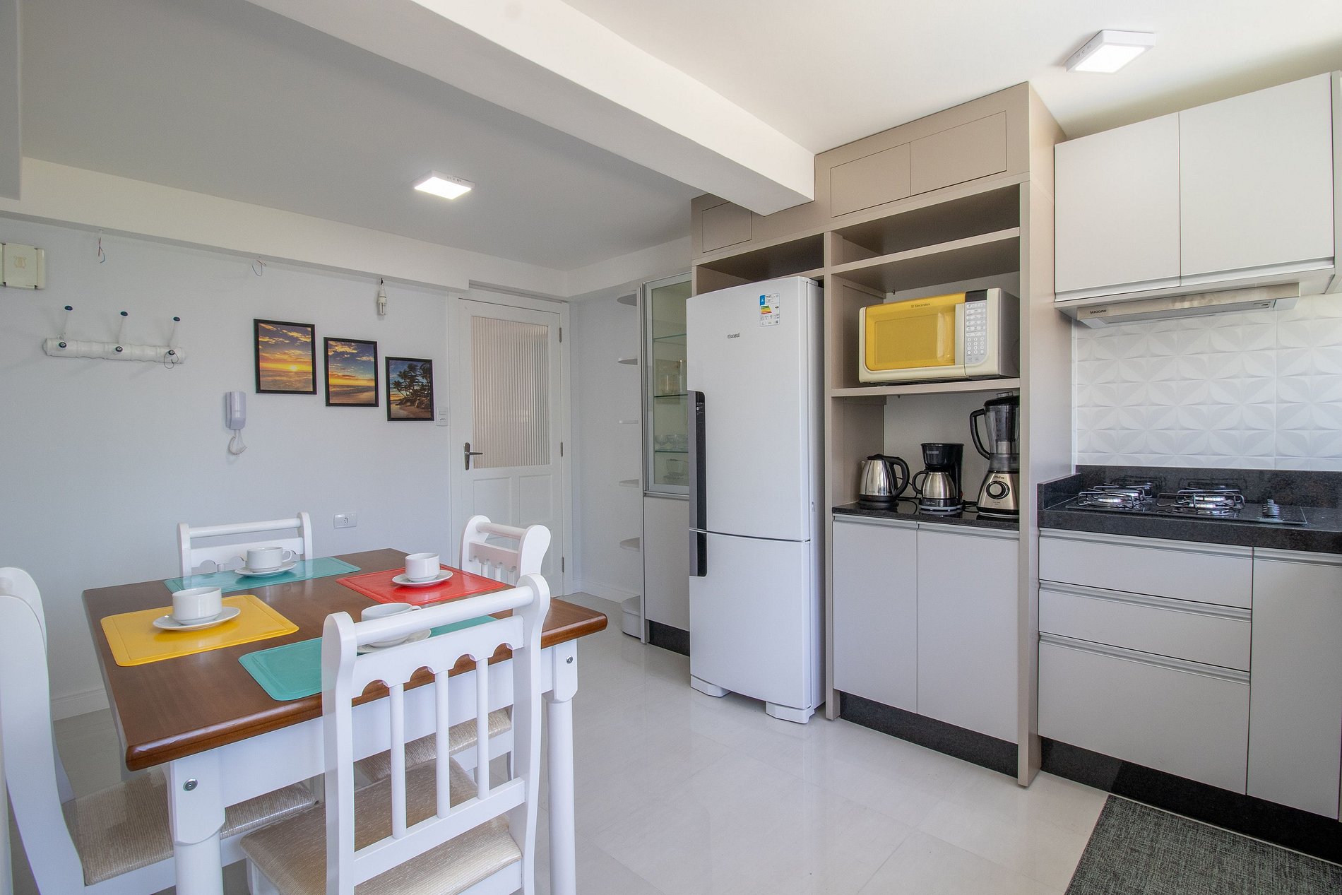 A cozinha é bem equipada com utensílios para o preparo de refeições básicas, sanduicheira, cafeteira, liquidificador e microondas. E a lavanderia com máquina de lavar, ferro de passar e secador de cabelos. Fornecemos roupa de cama, uma toalha de banho por hóspede e uma manta de microfibra para cada cama, garantindo praticidade e conforto durante sua estadia.