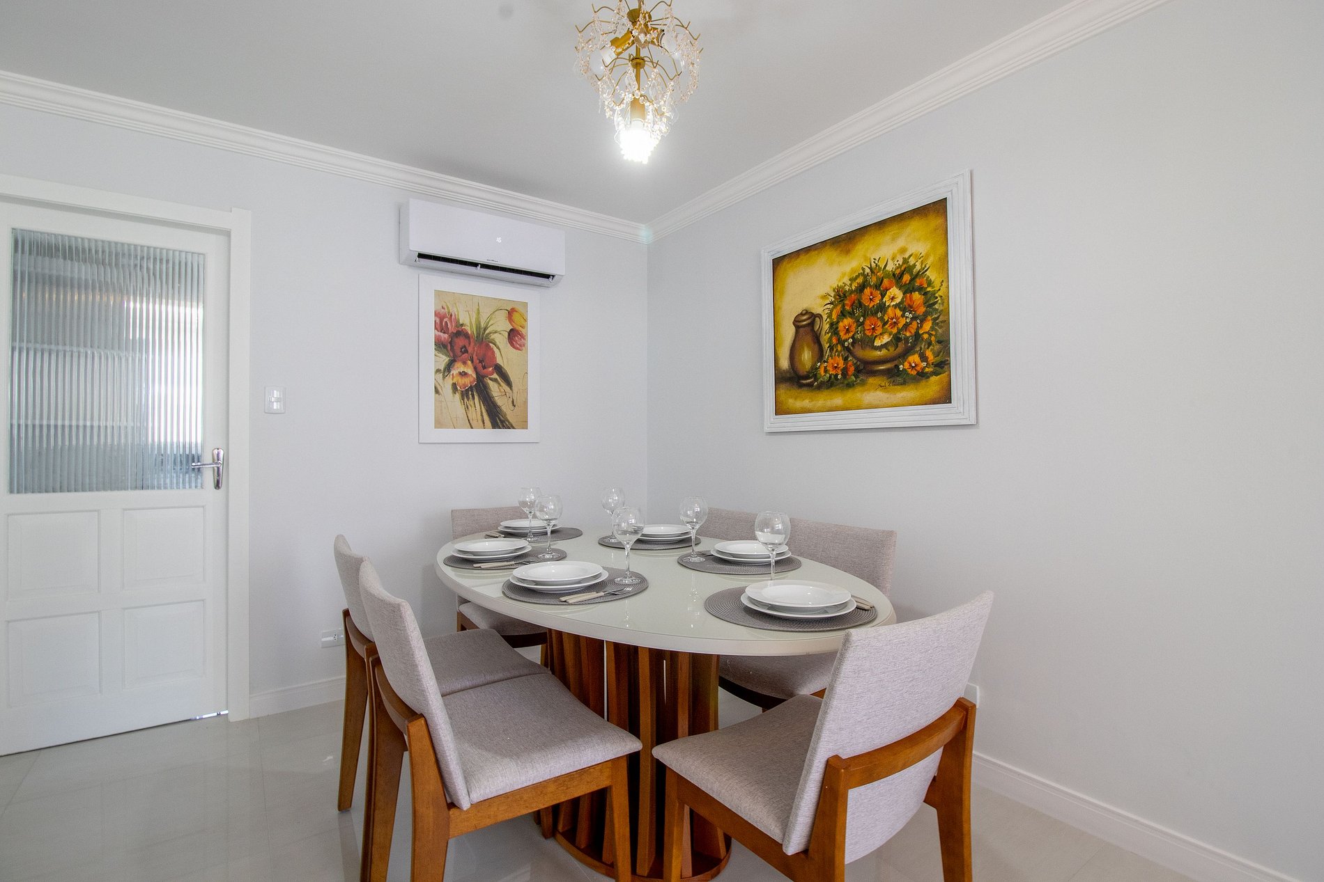 Há quatro aparelhos de ar-condicionado, um em cada dormitório e na sala. Há dois ares com os modos quente e frio (de um dormitório e da suíte), e outros dois somente com a função de refrigeração (da sala e de um dos dormitórios).