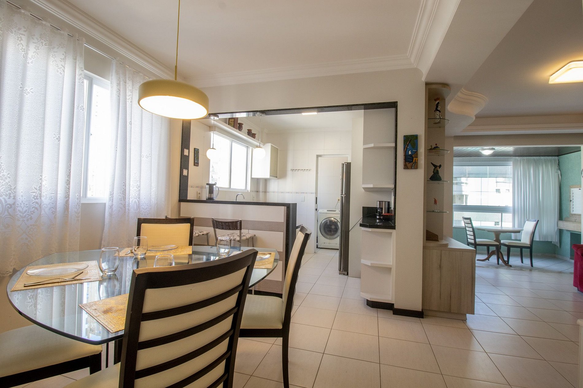 Com dois dormitórios, sendo uma suíte. Ao total, há duas camas de casal e dois colchões avulsos de solteiro, acomodando até 6 pessoas. O imóvel conta com dois banheiros equipados com chuveiro elétrico. A sala conta com um sofá, uma Smart TV e uma mesa de jantar com quatro cadeiras. Dispõe de uma sacada interna com churrasqueira, pia e uma mesa com duas cadeiras, o cenário ideal para momentos em família. A cozinha é equipada com diversos utensílios para a realizar o preparo de deliciosas refeições, são eles: cafeteira elétrica, sanduicheira, liquidificador, microondas e forno. A área de serviço possui máquina de lavar, varal, secador de cabelos e ferro de passar para maior comodidade. Disponibilizamos roupa de cama básica (lençol de elástico, sobre lençol e travesseiros com fronha) e uma toalha de banho por hóspede. Fornecemos um edredom para cada cama e uma manta para os colchões avulsos de solteiro, garantindo seu máximo conforto.