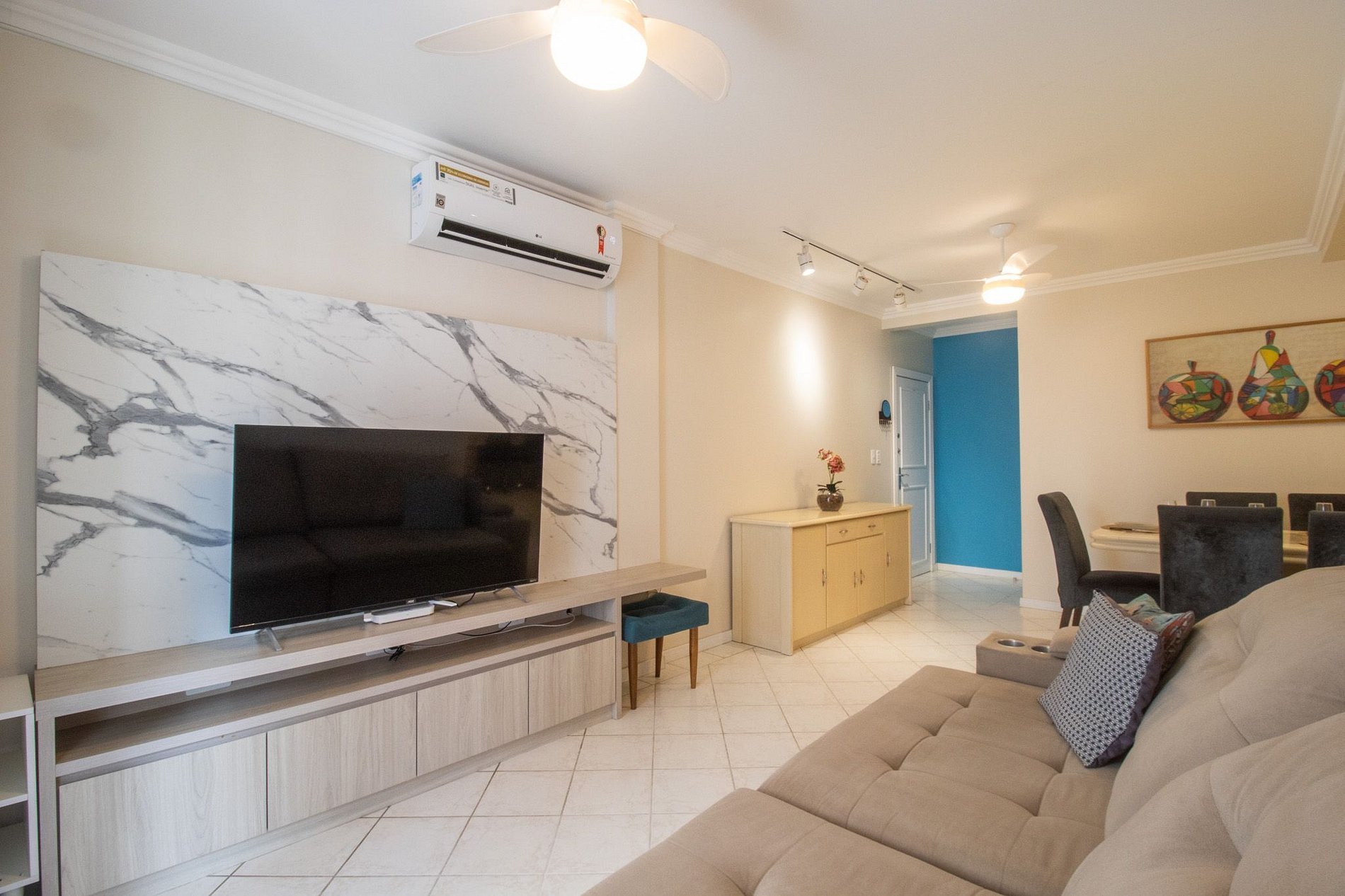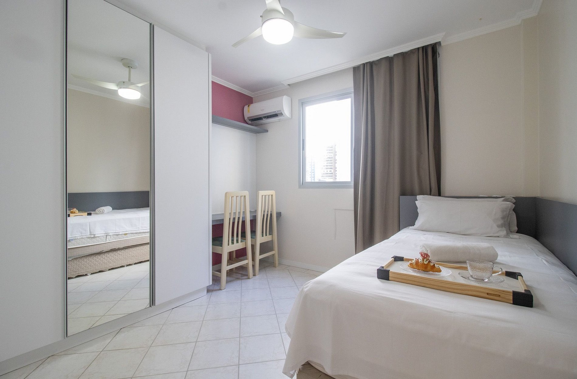 Com quatro aparelhos de ar-condicionado split. Há um aparelho em cada dormitório, todos com função quente/frio, e um aparelho na sala de estar, com função de refrigeração.