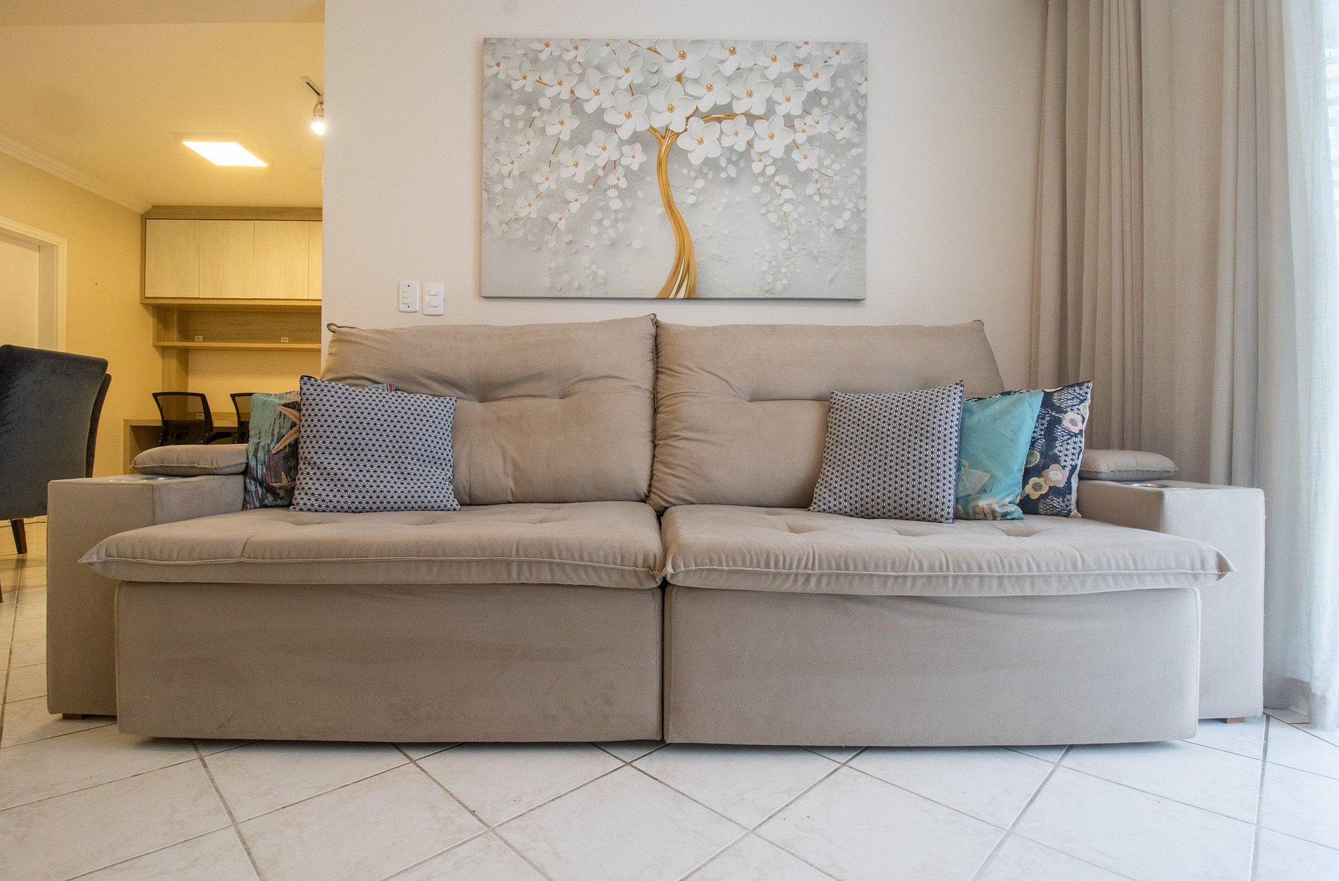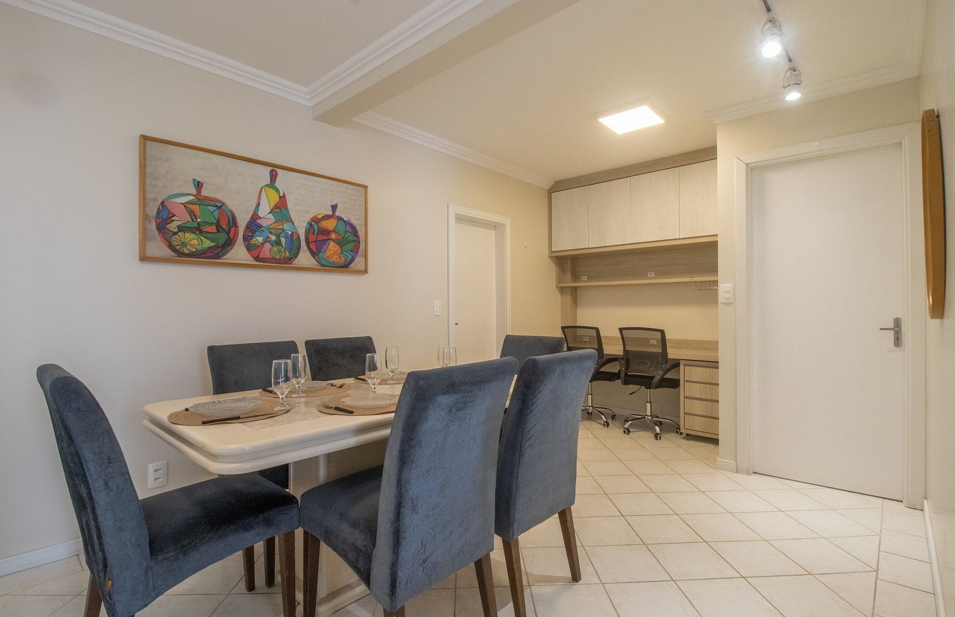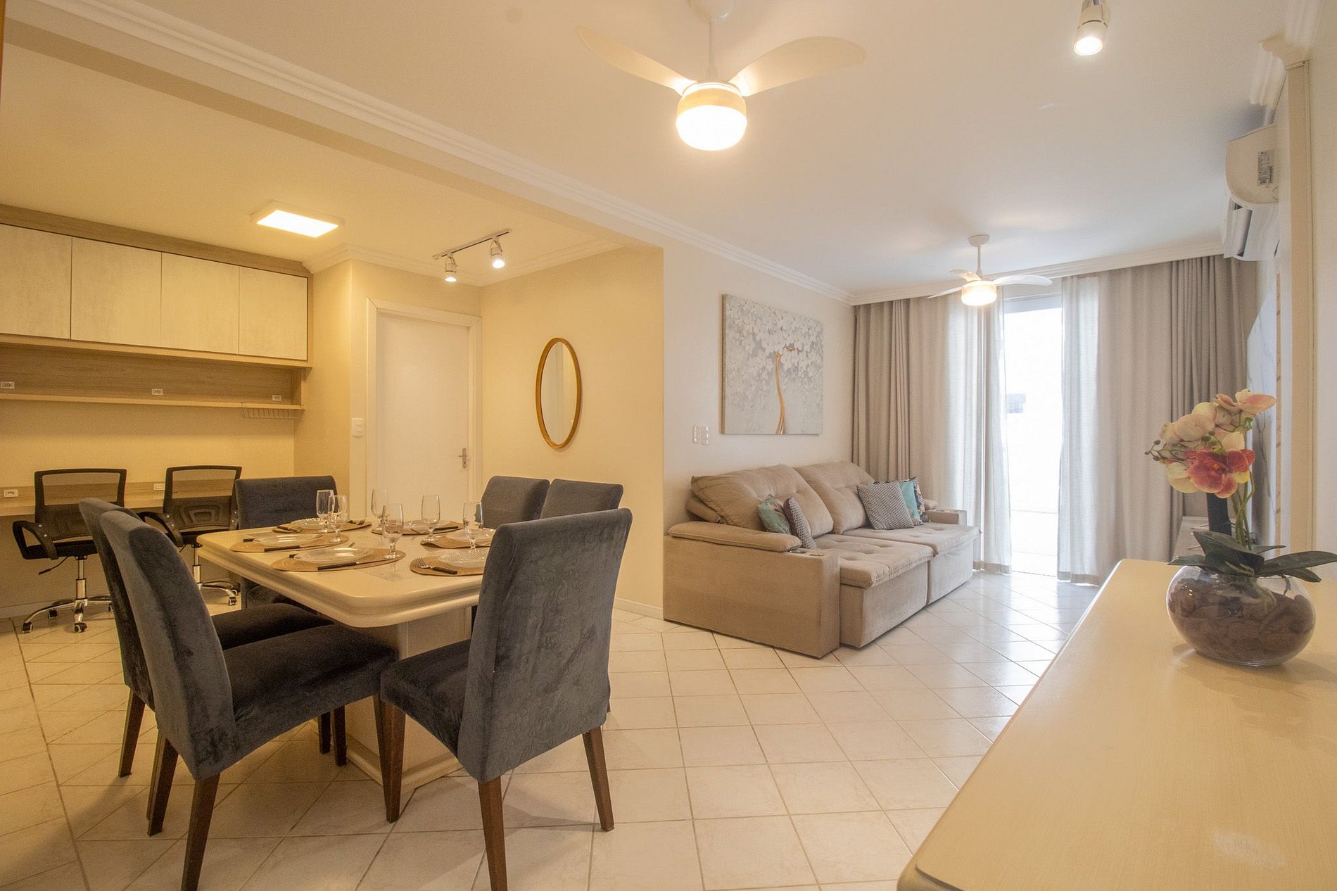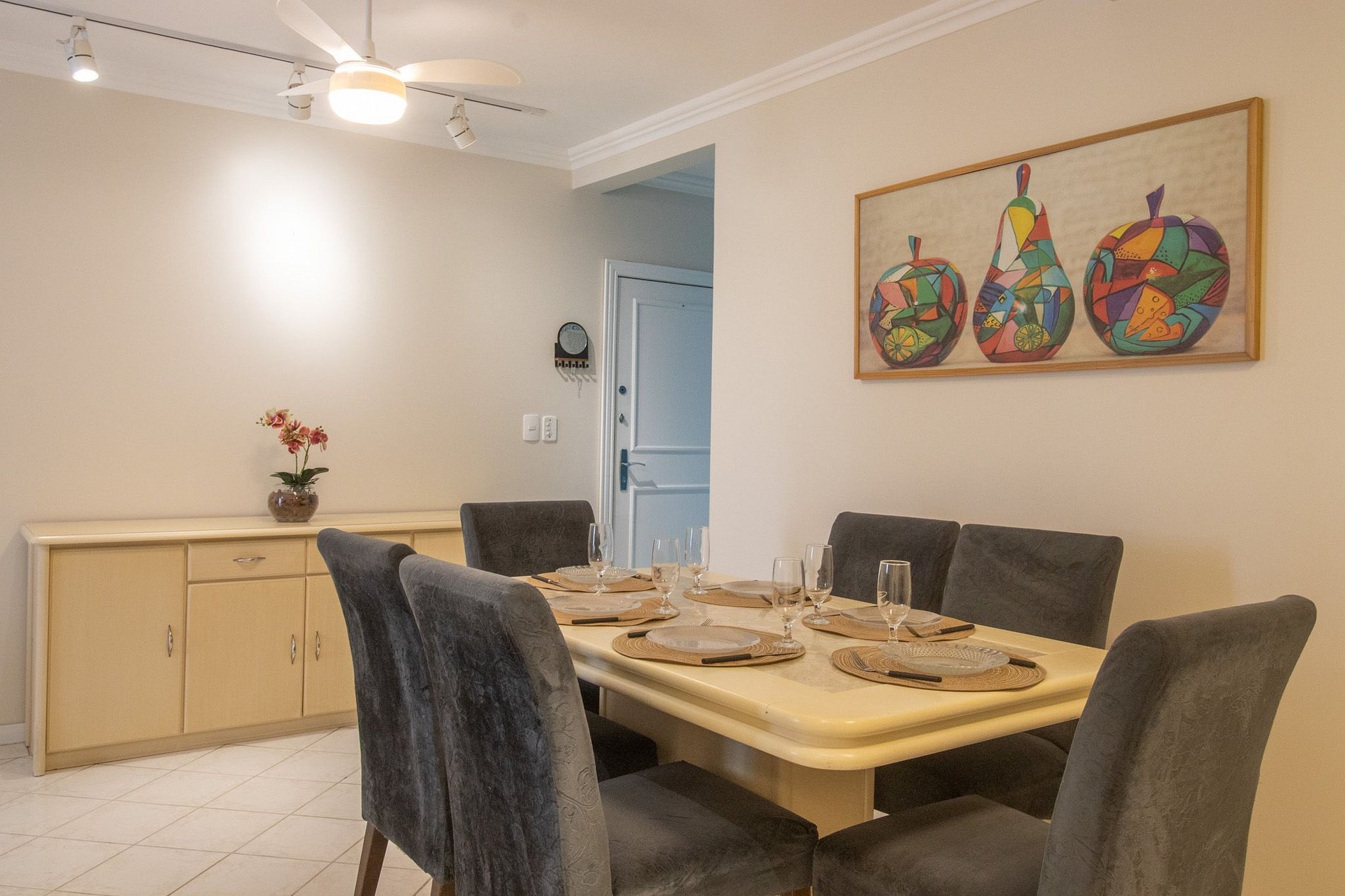 O imóvel dispõe de três dormitórios, sendo uma suíte com cama king. Os outros dois quartos contam com uma cama de solteiro, uma cama auxiliar cada e dois colchões de solteiro avulsos, acomodando confortavelmente até 8 hóspedes. São três banheiros no total, todos com chuveiros elétricos. A sala de estar oferece um sofá confortável, Smart TV e mesa de jantar com seis lugares. A cozinha é equipada com utensílios para o preparo de refeições básicas, incluindo fogão de quatro bocas, cafeteira elétrica, chaleira elétrica, sanduicheira e liquidificador. Para maior comodidade, o apartamento também dispõe de ferro de passar, secador de cabelo e área de serviço com máquina de lavar roupas e varal. Nos quartos e na sala, há espaço para trabalho com mesa, cadeira e tomada, ideal para home office. Fornecemos roupa de cama e uma toalha de banho por hóspede. Também disponibilizamos uma manta para cada cama, garantindo conforto e praticidade durante a estadia.