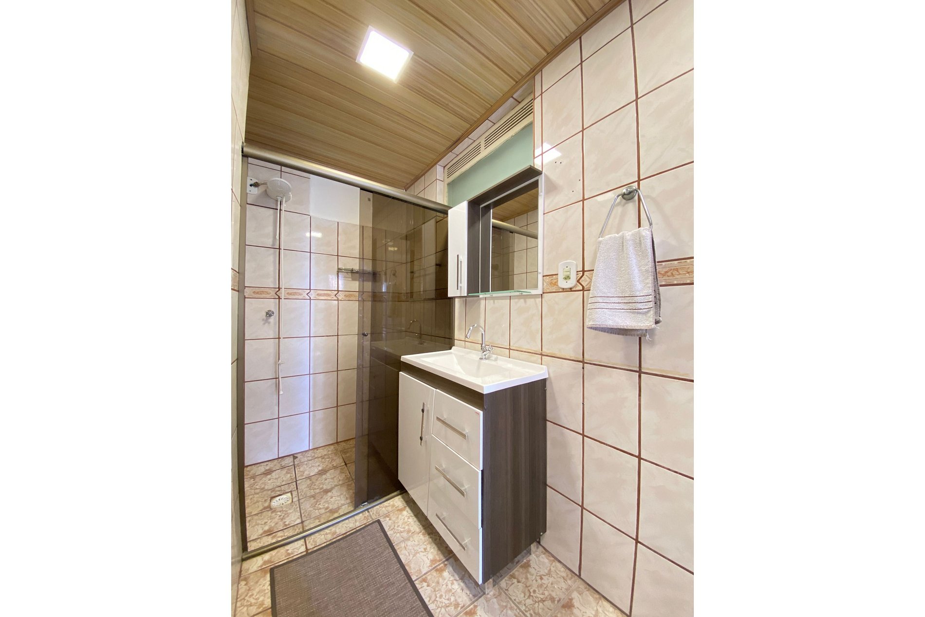 Com dois dormitórios climatizados, oferecemos duas camas de casal e dois colchões de solteiro adicionais. Há um banheiro com chuveiro elétrico. A cozinha conta com itens para realizar as refeições básicas, comodidades como sanduicheira, cafeteira e liquidificador. Também, há uma máquina de lavar, ferro de passar e secador de cabelos que auxiliam na comodidade durante sua estadia.