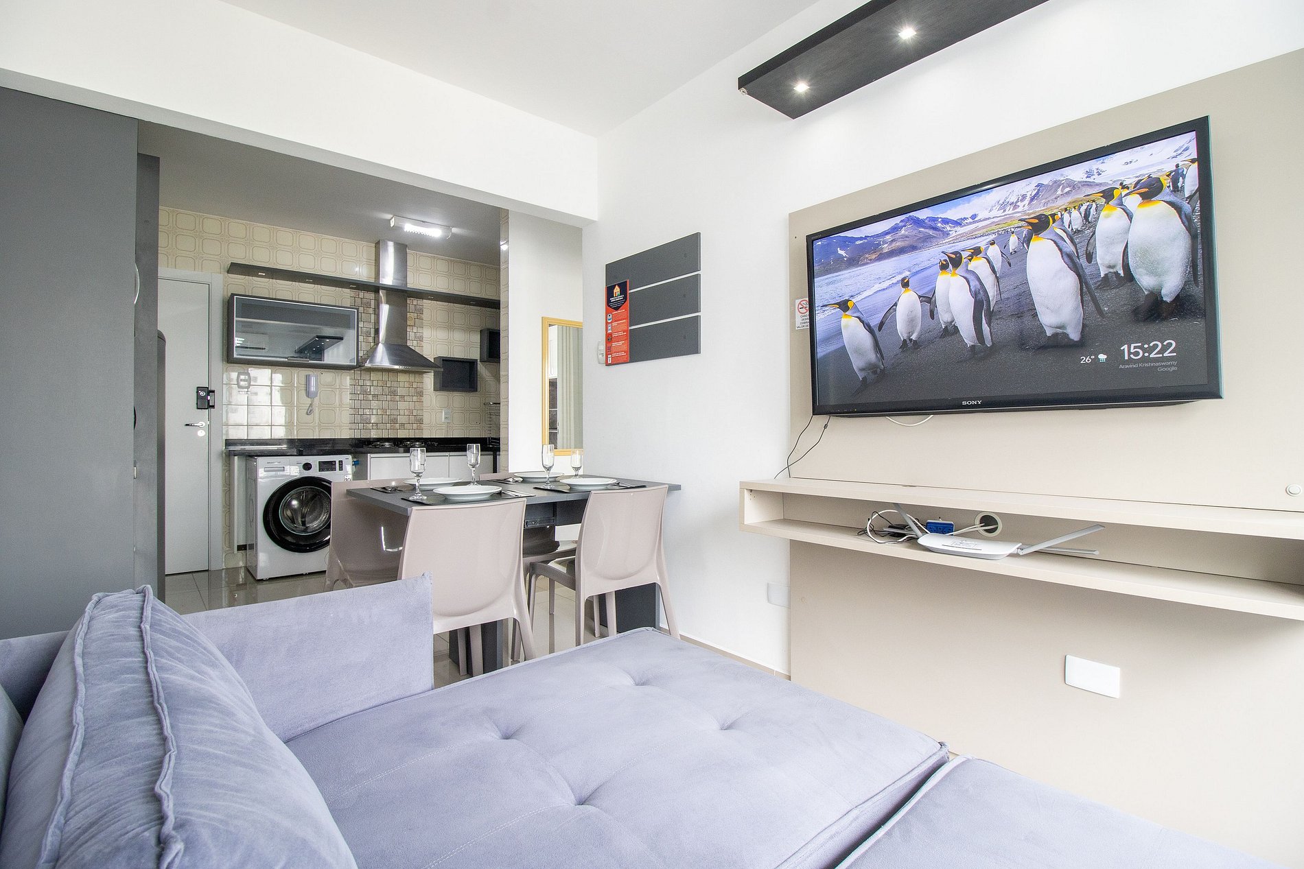 O espaço conta com internet wi-fi de 50mb própria do apartamento, TV no quarto com canais abertos e TV na sala com acesso a serviços de streaming.