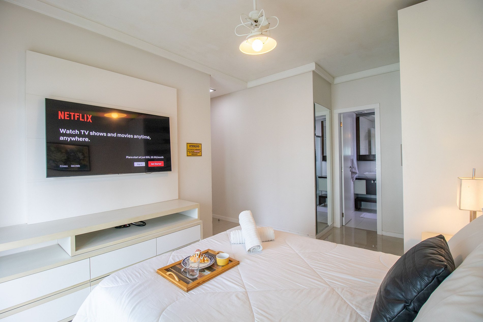 O espaço conta com internet wi-fi de 300mb própria do apartamento e compatível para trabalhos de home office, na suíte e na sala as televisões possuem acesso a serviços de streaming.