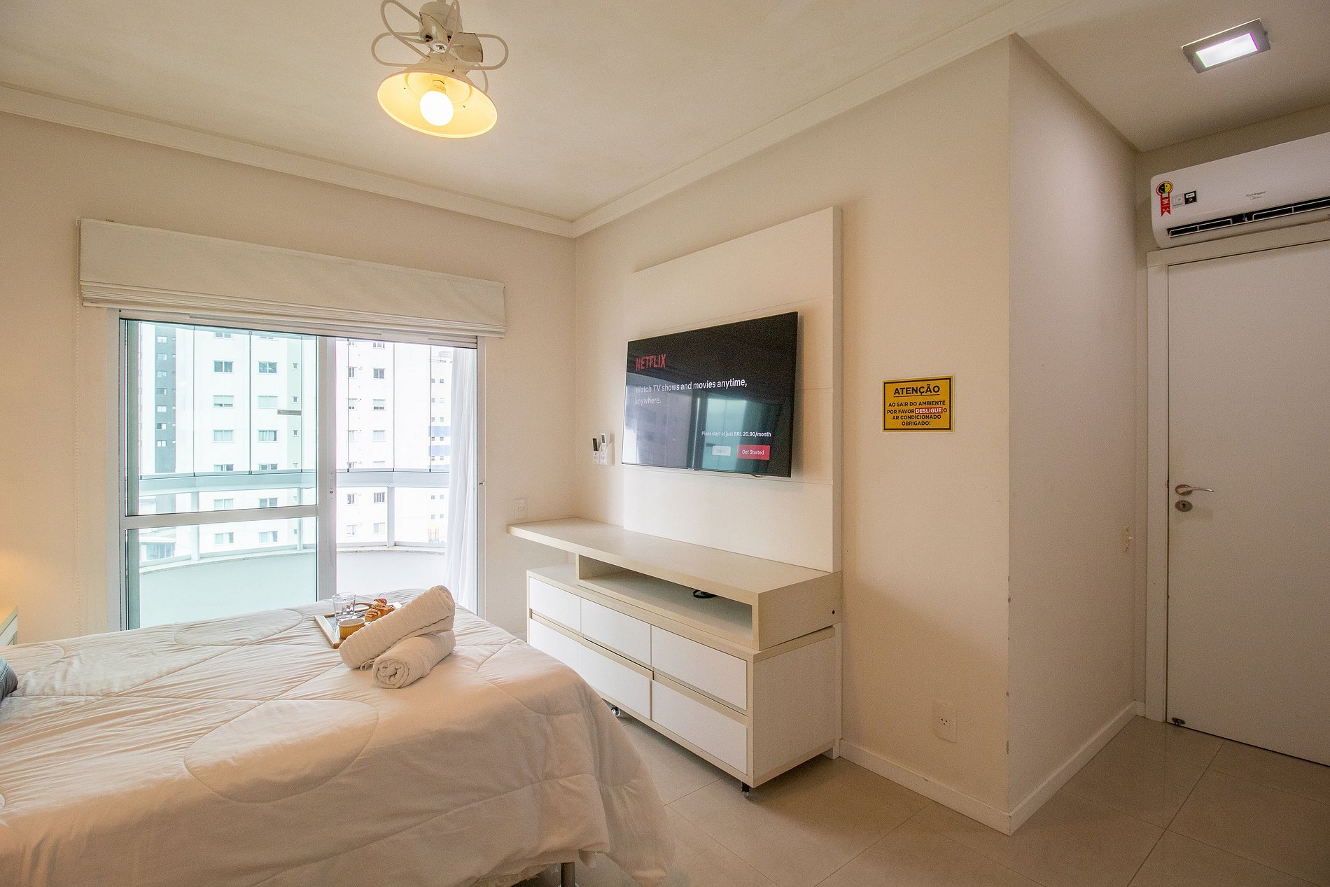 Venha para Balneário Camboriú e fique confortavelmente hospedado nesse lindo espaço. Há climatização com ar condicionado split quente e frio e televisões com acesso a serviços de streaming na suíte e na sala. Os colchões são de ótima qualidade, a cozinha é equipada com utensílios para preparar refeições completas e uma garagem privativa. Além disso há filtro de água, ferro e secador de cabelo.