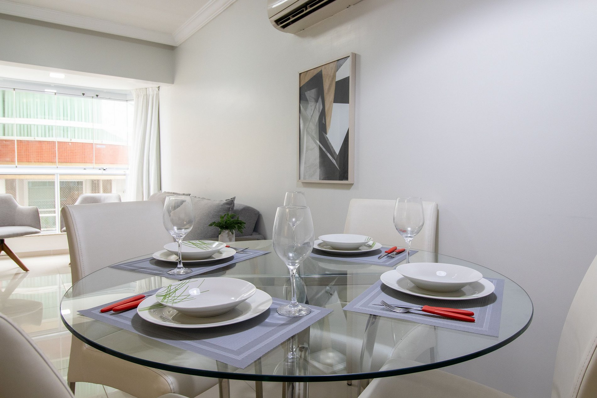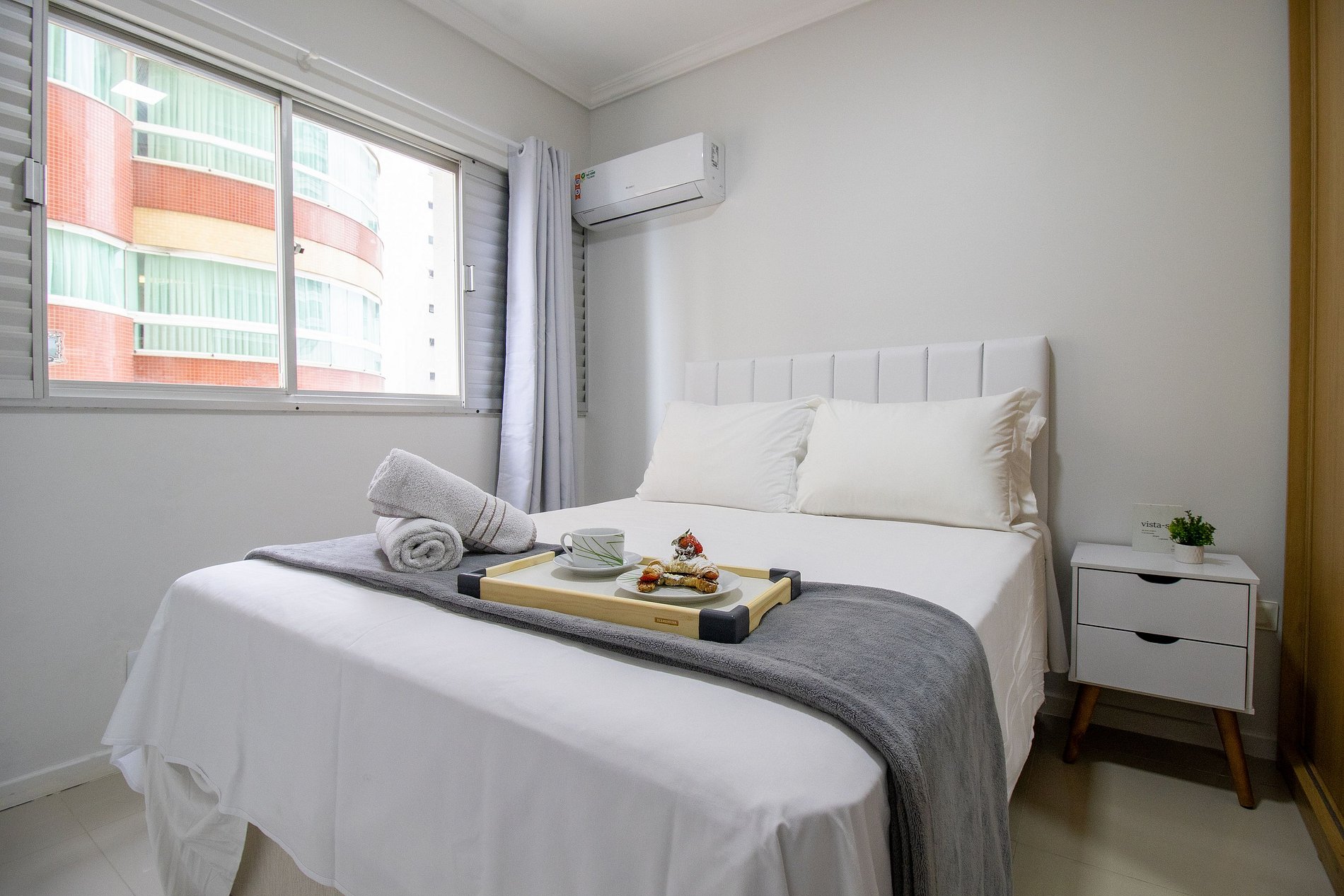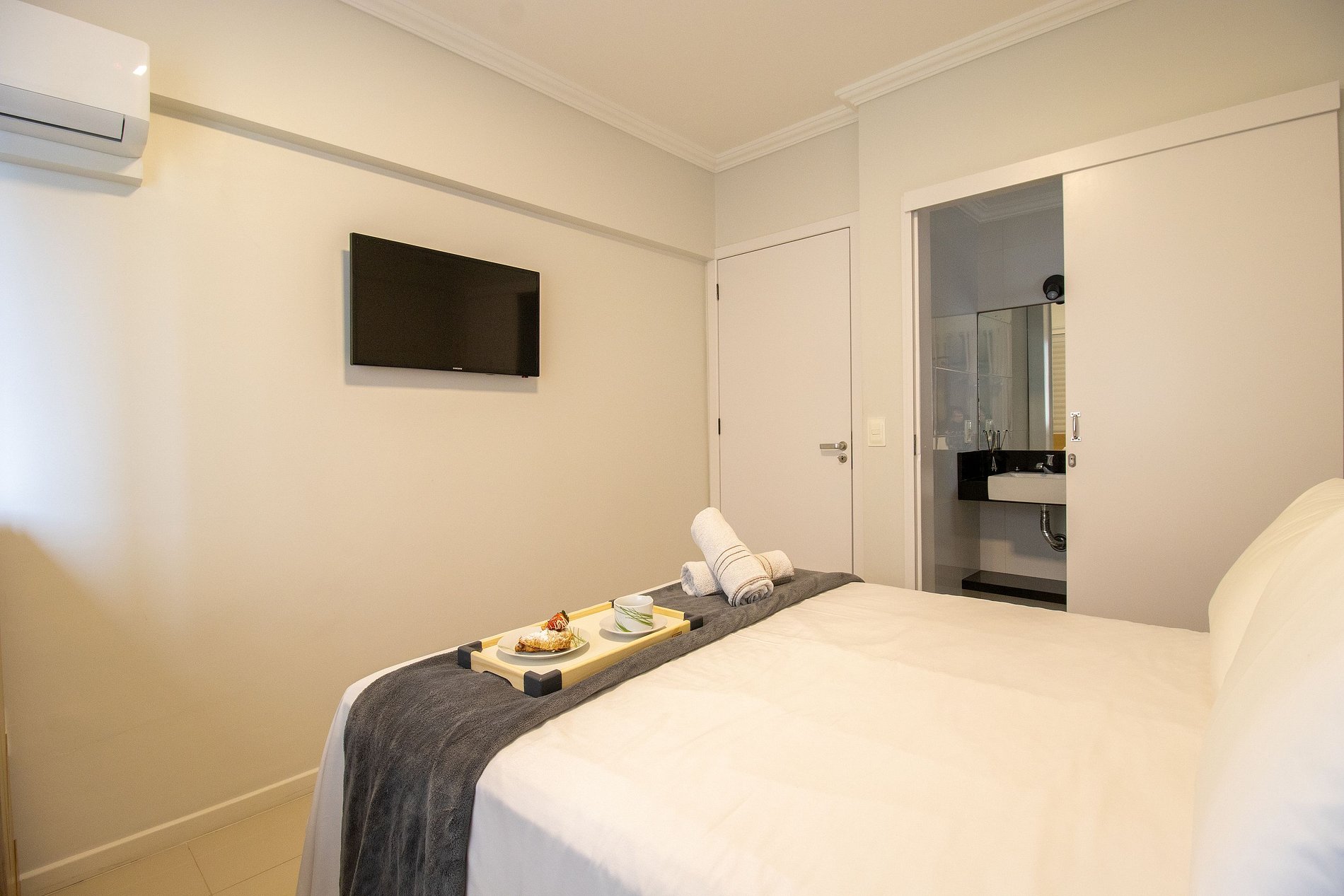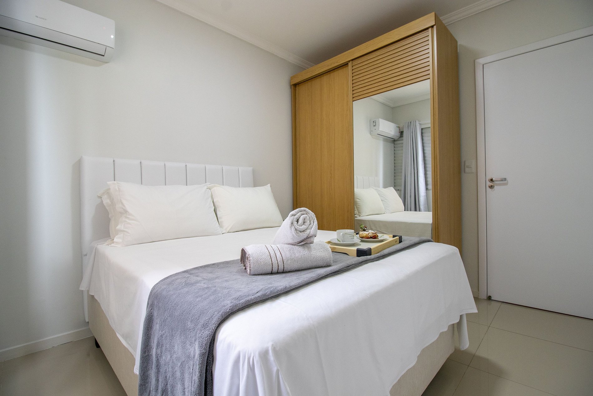 O apartamento possui três ares condicionados, sendo um em cada dormitório (quente/frio) e na sala.