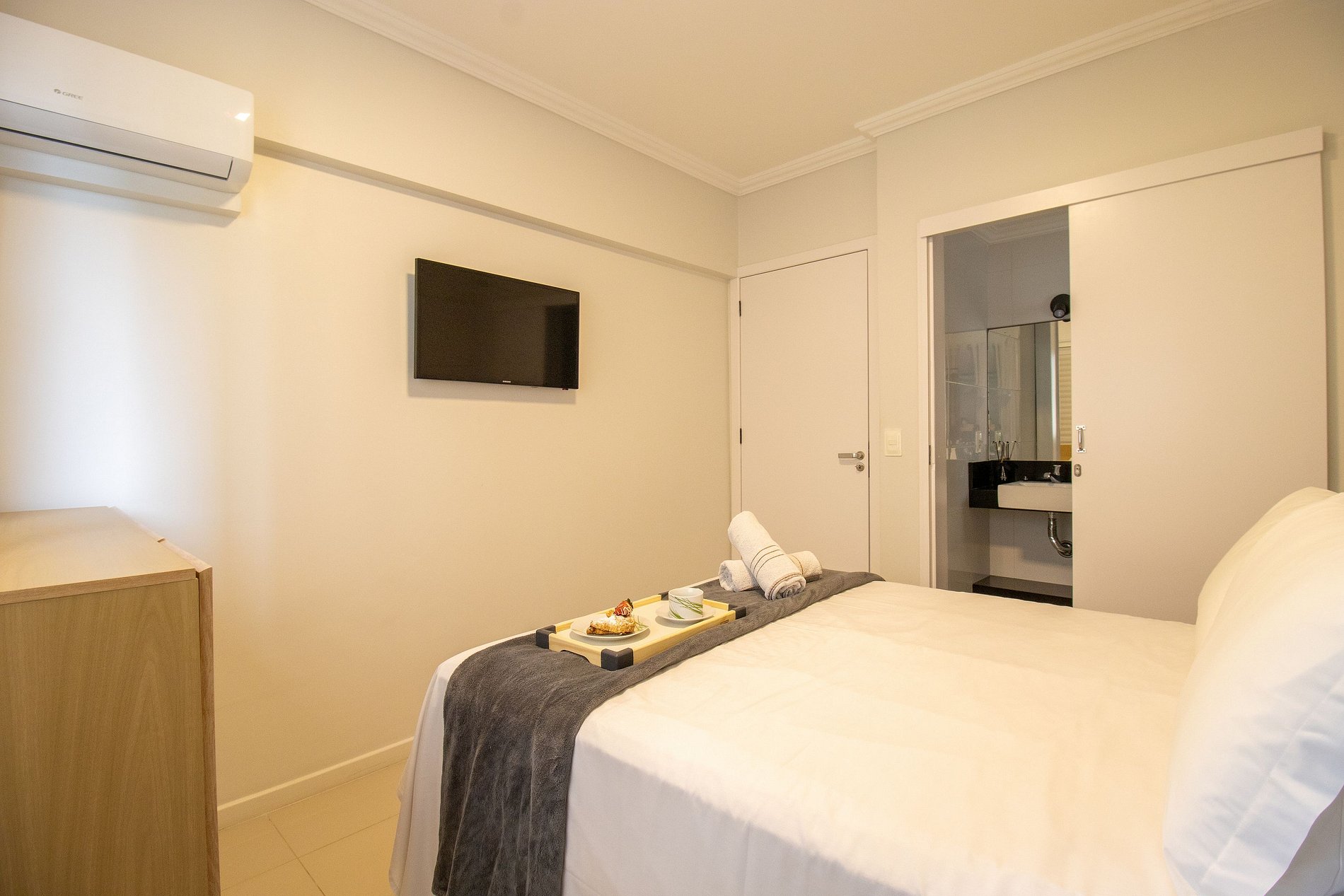 Mantenha-se conectado com nossa internet Wi-Fi de qualidade e própria do apartamento, desfrute de entretenimento com TV Smart na sala e uma TV no quarto com apenas canais abertos.
