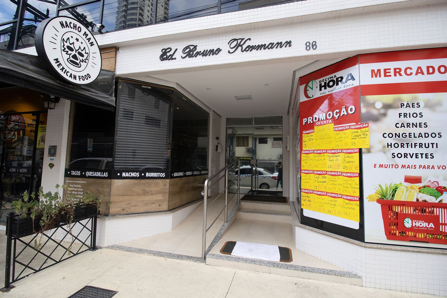Esse apartamento fica no Edifício Bruno Kormann, localizado na rua mil, número oitenta e seis. O espaço fica a menos de três minuto caminhando até o calçadão central, cerca de cinco minutos até a areia do praia e a sete minutos do Shopping Atlântico. Embora a localização fique bem pertinho das ruas mais movimentadas da cidade, a rua mil é bem tranquila durante o dia.