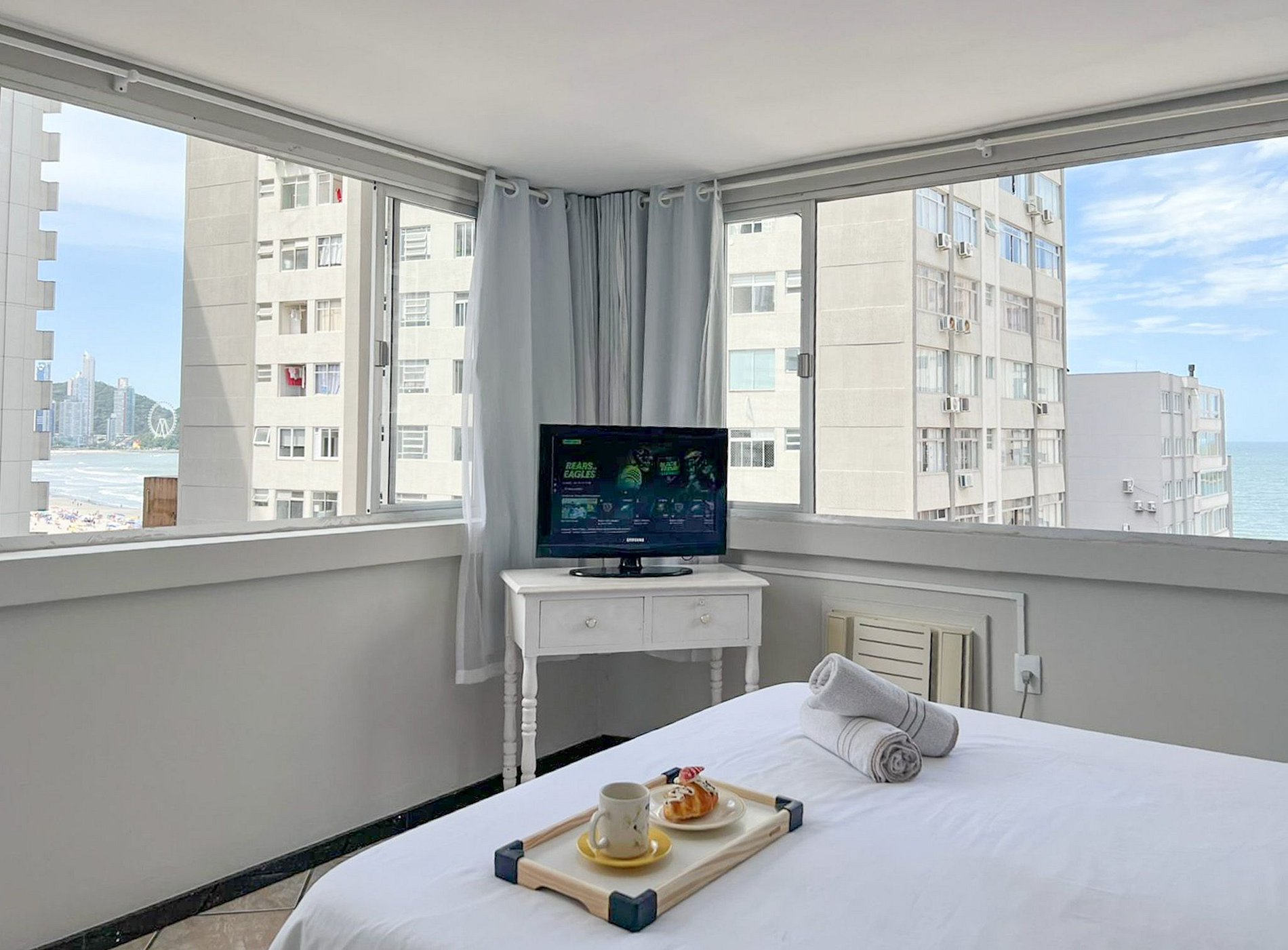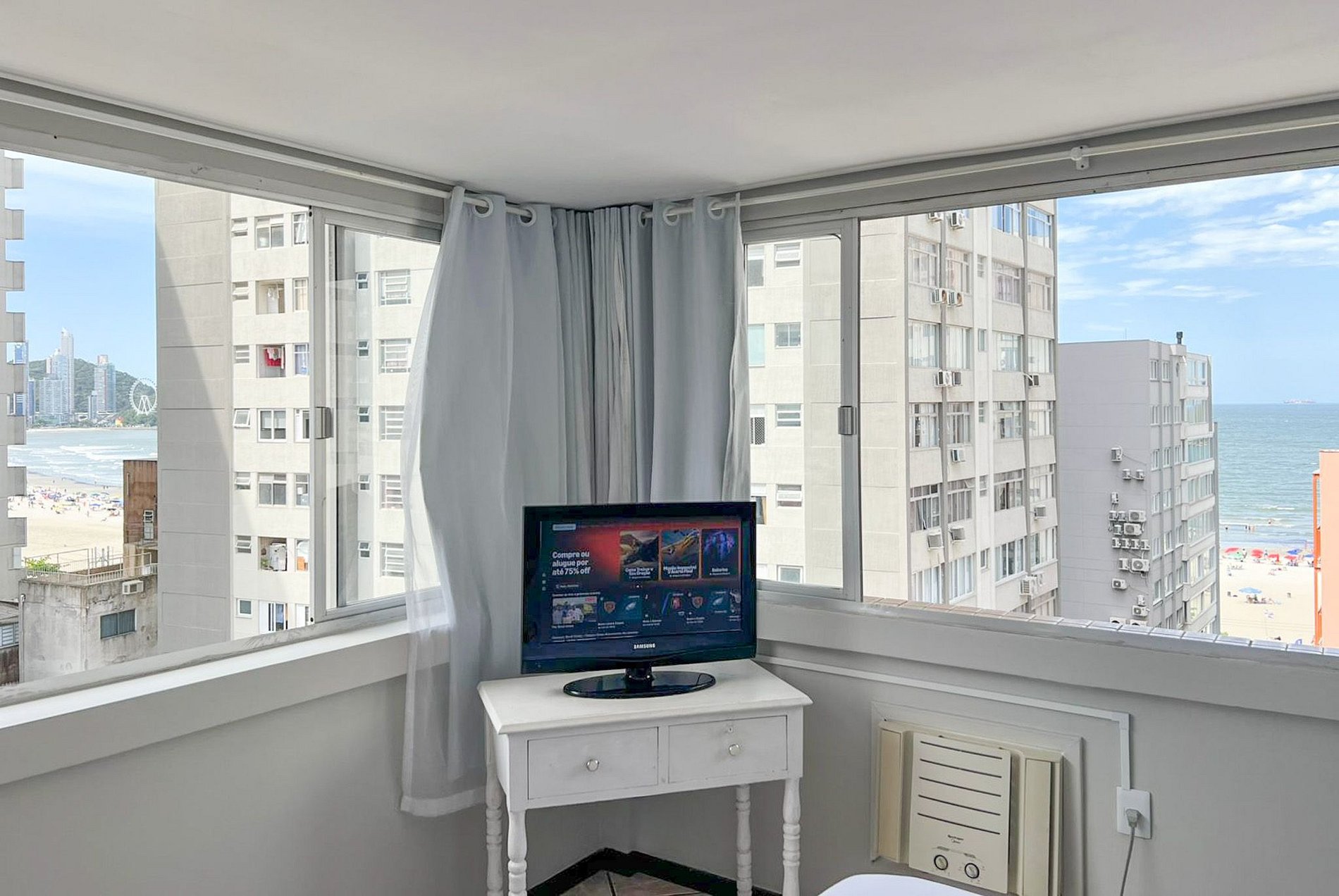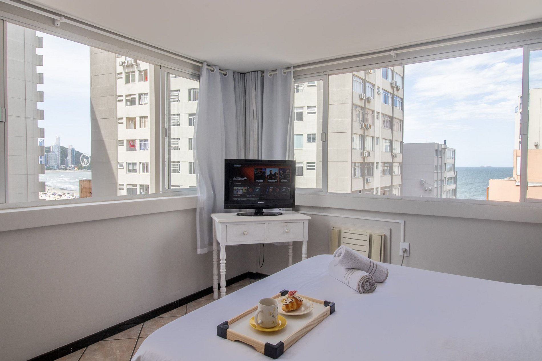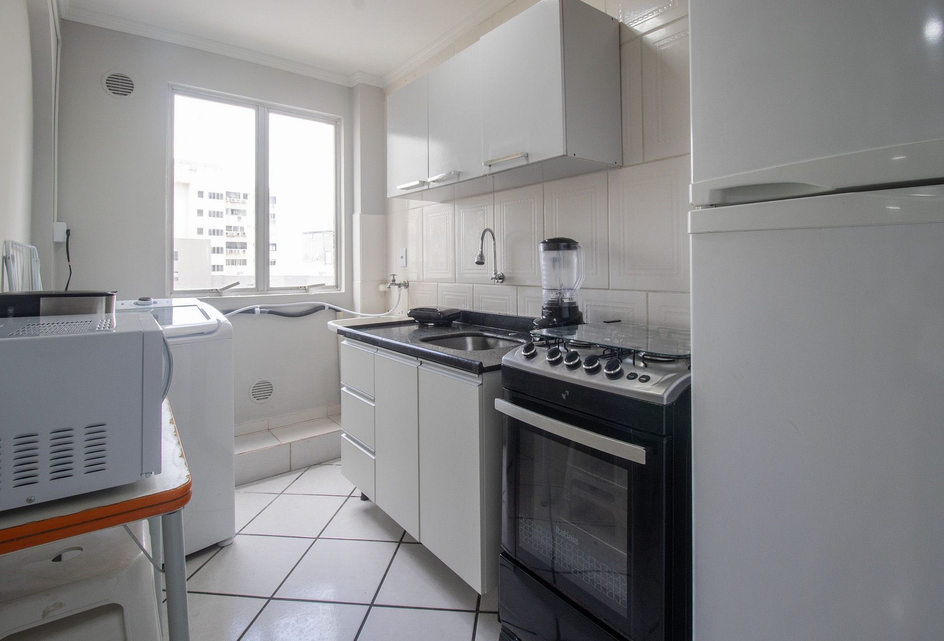 Localização no calçadão da Avenida Central em Balneário Camboriú a menos de um minutinho caminhando até a areia da praia, esse espaço de um dormitório oferece tudo que um viajante precisa, temos uma garagem privativa em prédio próximo, internet wi-fi, ar condicionado no dormitório, cozinha completa para preparo de refeições básicas, cafeteira, liquidificador, sanduicheira, ferro de passar roupa e secador de cabelo.