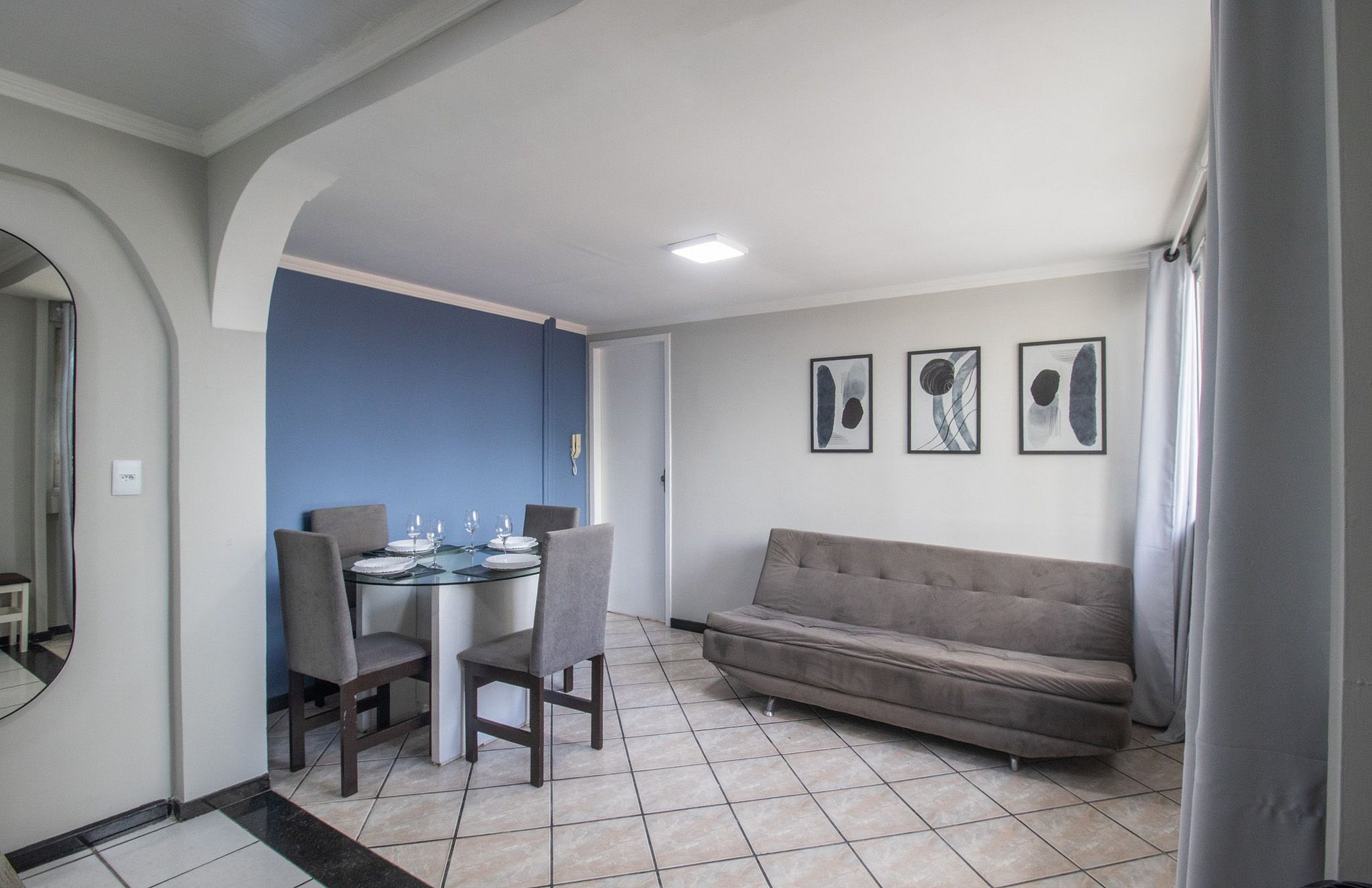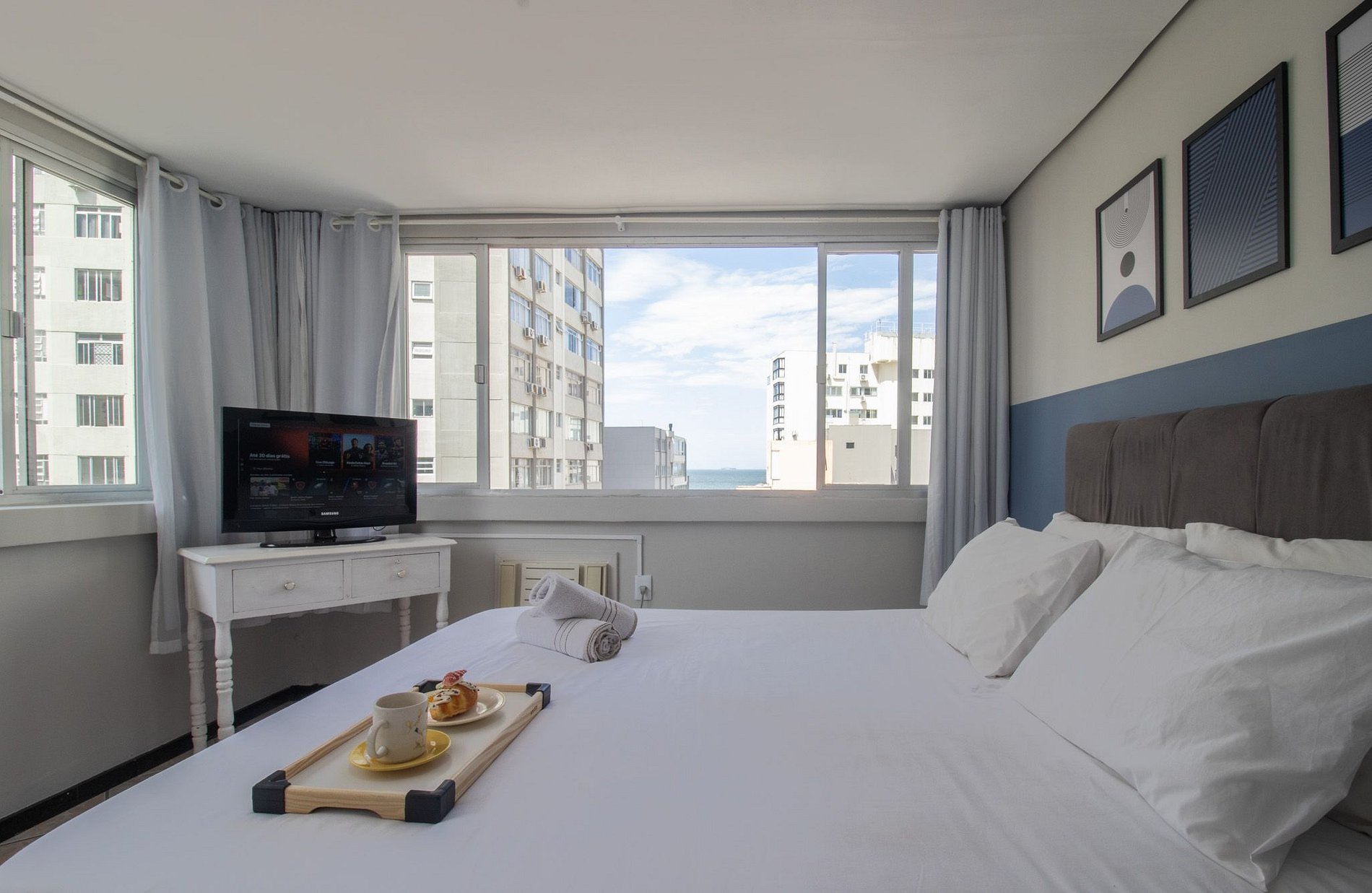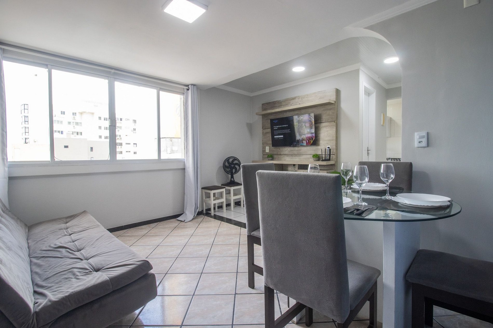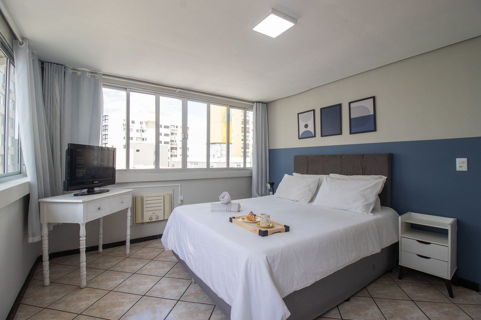O espaço possui um dormitório com uma cama de queen e ar condicionado, na sala há um sofá cama, mesa com quadro cadeiras e TV com acesso a serviços de streaming. O apartamento é relativamente simples e pode ter alguns móveis e infraestrutura em estado de conservação baixo.