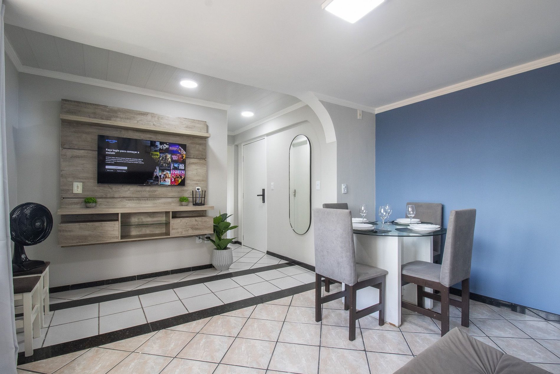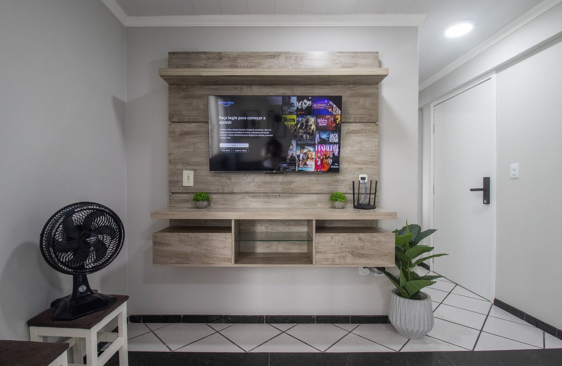 Internet WI-FI de boa velocidade e TV na sala e no quarto com acesso a serviços de streaming.