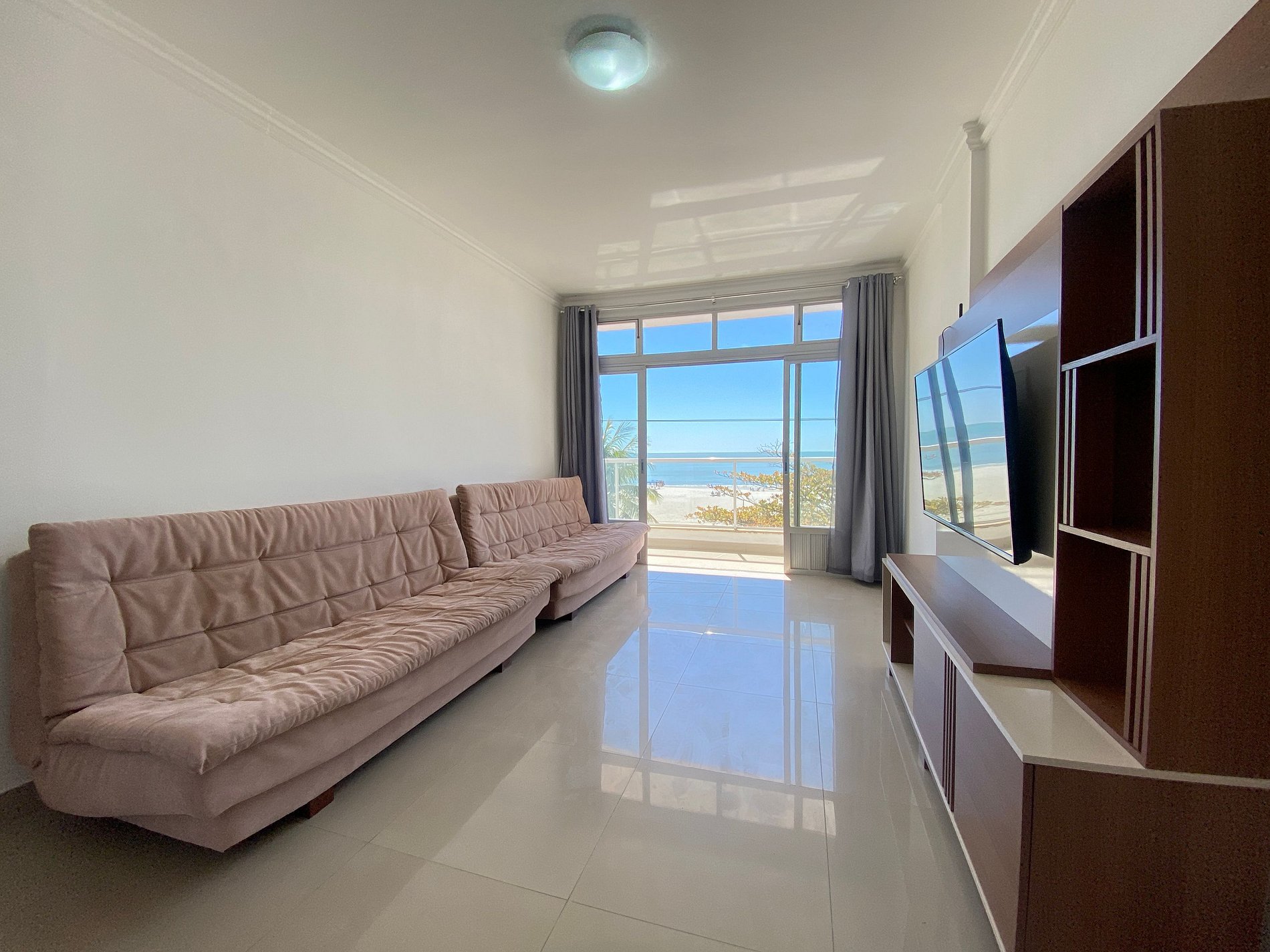 Este espaçoso apartamento conta com uma suíte, mais dois dormitórios e um banheiro social. Os chuveiros do espaço são elétricos. Com uma vista deslumbrante para o mar da sala e de um dos dormitórios, a suíte e o outro dormitório possui vista lateral ao mar. Ao total temos duas camas de casal, duas camas de solteiro e três colchões de solteiro avulsos. A cozinha possui itens como sanduicheira, cafeteira elétrica, liquidificador. Além de itens adicionais como ferro de passar, secador de cabelos e máquina de lavar.
