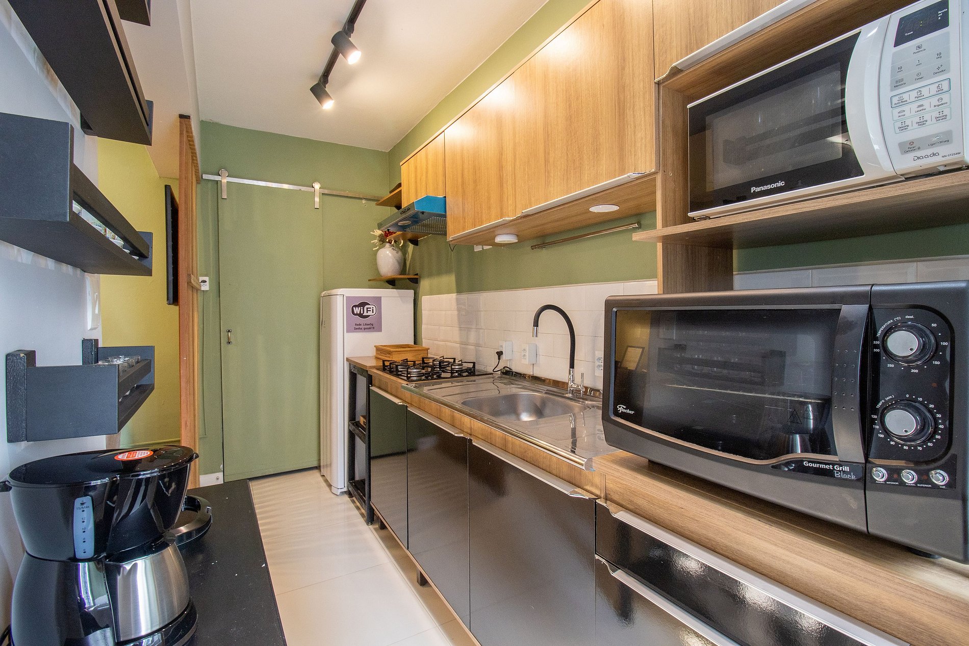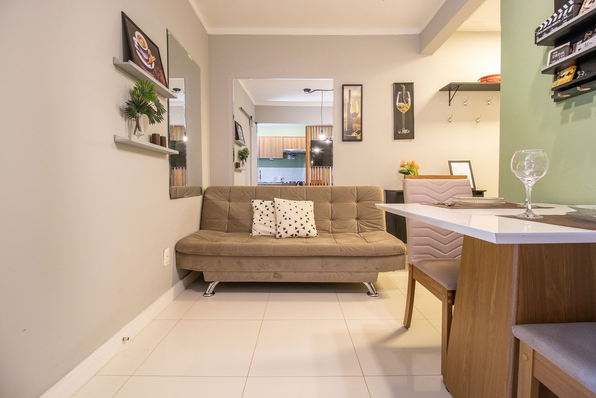 Esse espaço possui um dormitório com uma cama queen e um colchão de solteiro avulso. Um banheiro com chuveiro elétrico. A sala conta com uma TV e um sofá cama. A cozinha possui os itens básicos para realizar refeições do cotidiano. Conta com microondas, cafeteira, sanduicheira, liquidificador, cooktop, forno elétrico e chaleira elétrica. Além de uma máquina de lavar e varal de parede. Disponibilizamos também ferro de passar e secador de cabelos.