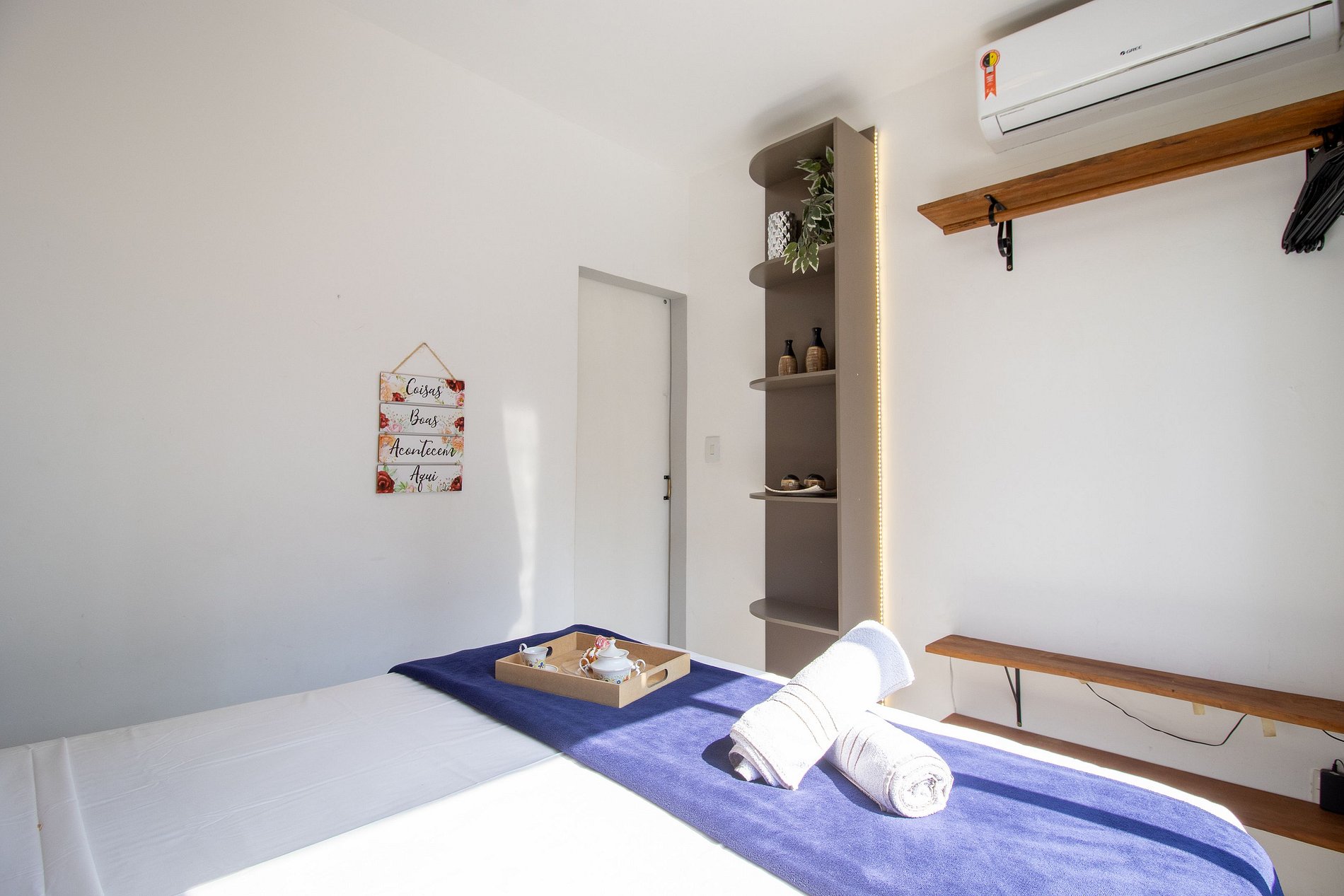 Há um ar condicionado split no dormitório, funciona no modo quente e frio.