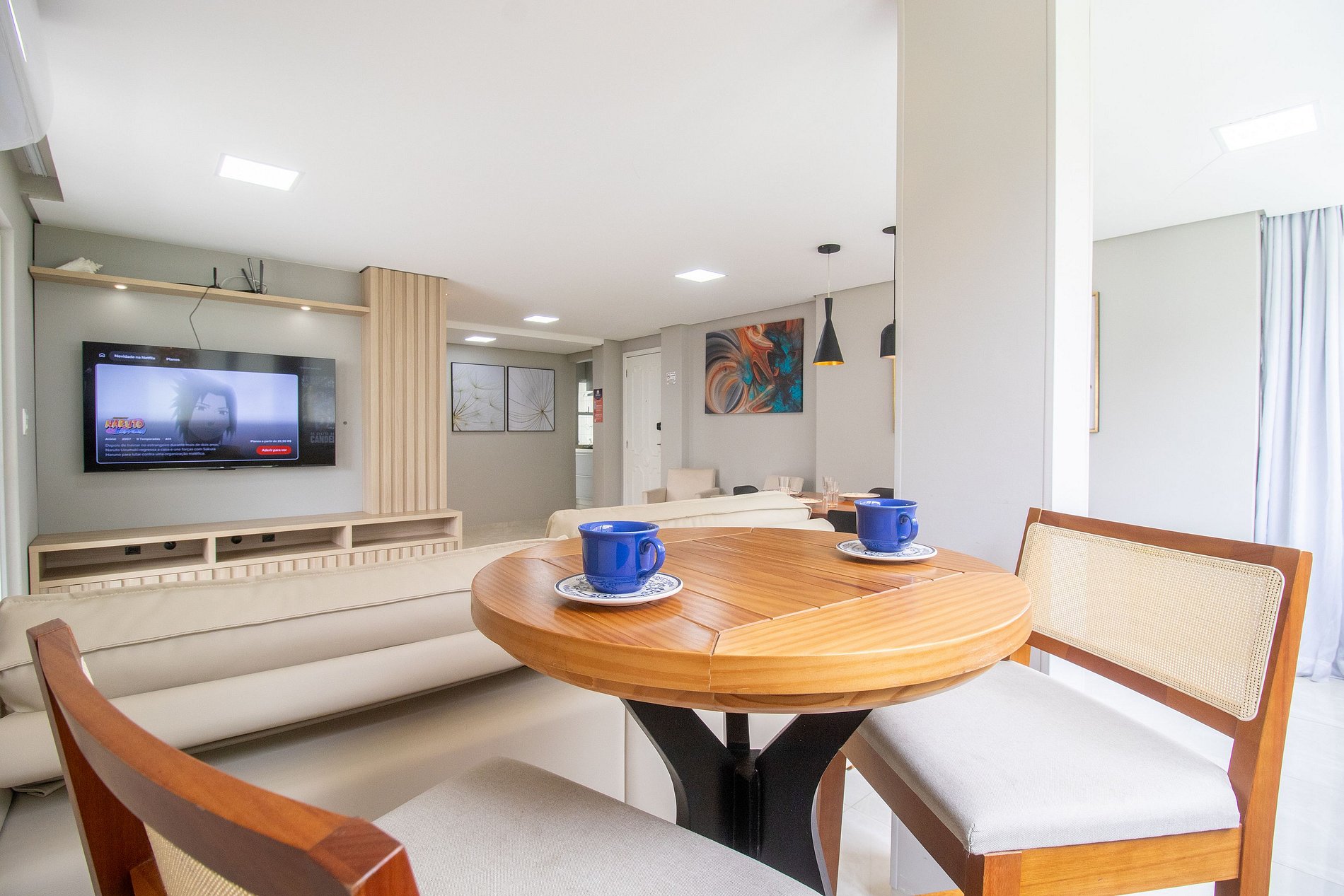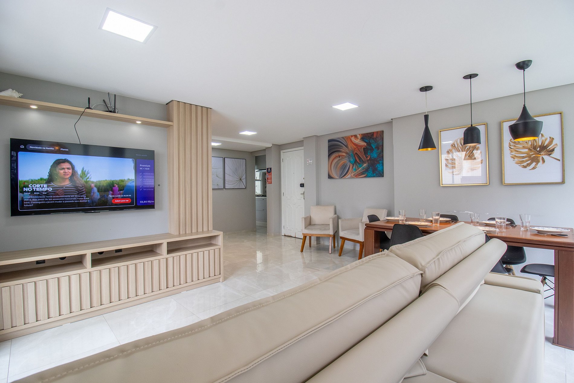 Internet wi-fi de boa velocidade própria do apartamento, própria para home office. TV Smart na sala e TV com acesso a serviços de streaming em um dos quartos.