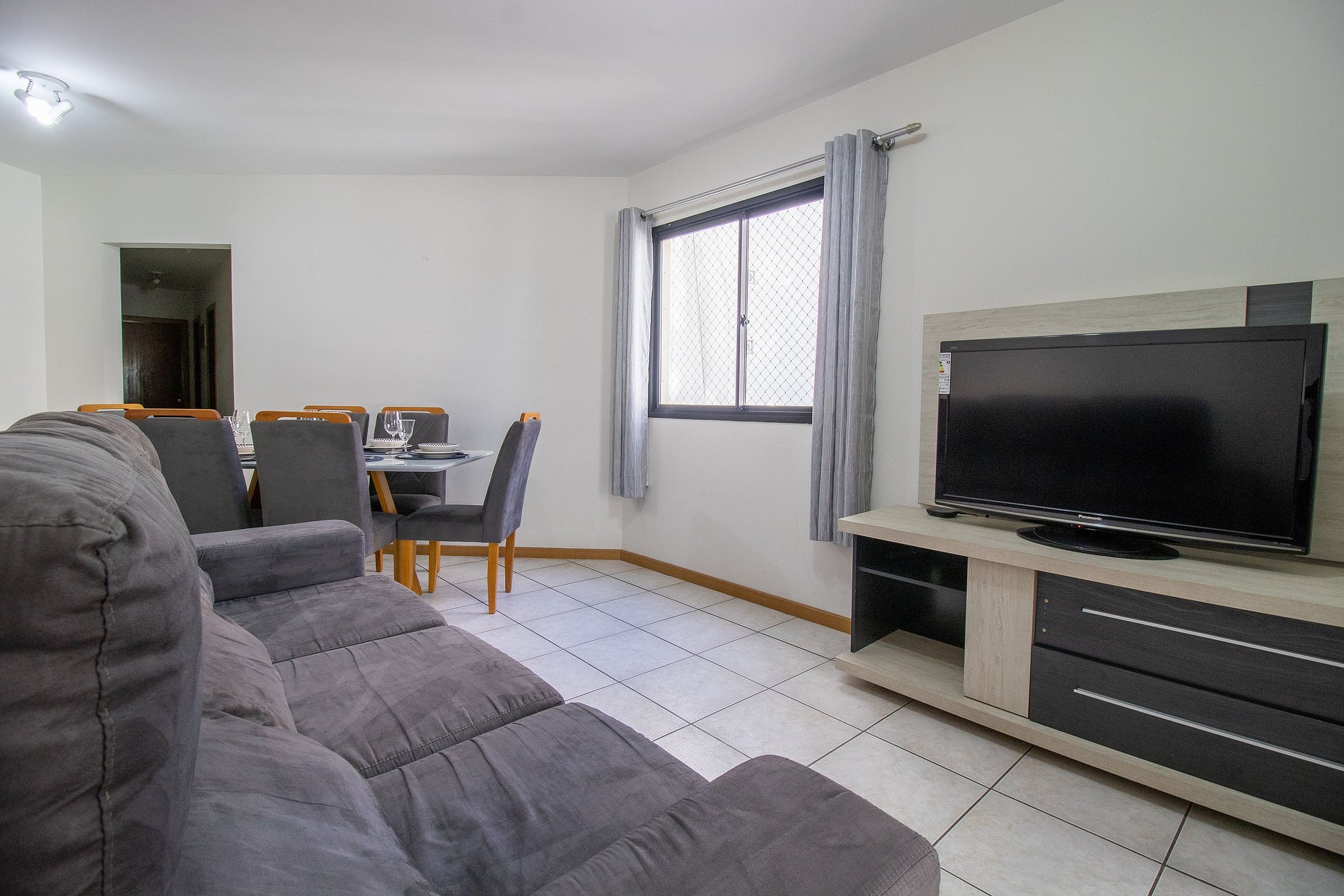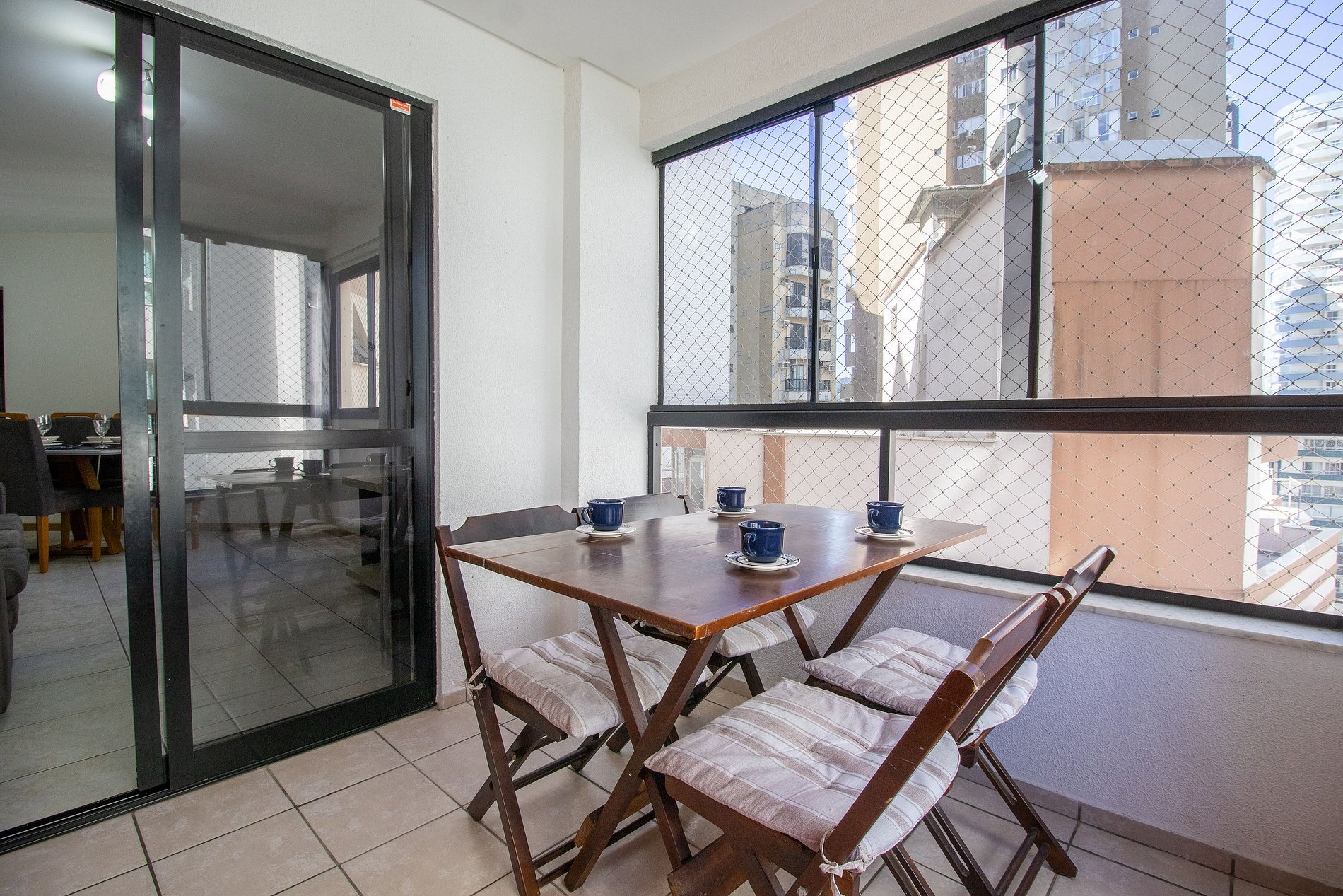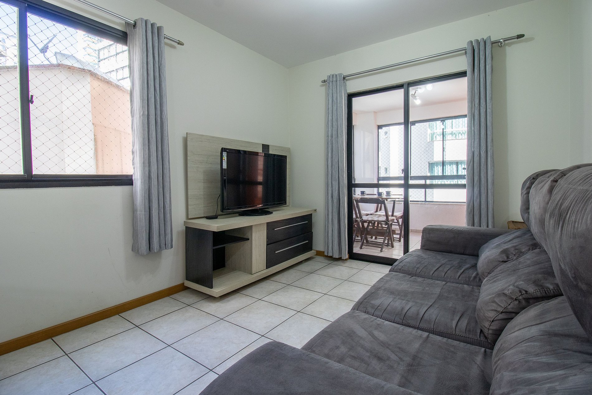 O apartamento possui três dormitórios, sendo uma suíte. Conta com dois banheiros com chuveiros elétricos. Ao total há duas camas queen, duas camas de solteiro e dois colchões de solteiro avulsos. Esse apartamento oferece uma sala com sofá, TV e uma mesa de jantar de 6 lugares. A varanda é fechada, conta com churrasqueira a carvão, ideal para momentos de lazer. A cozinha está equipada com o que você precisa para preparar refeições básicas para seu dia a dia, incluindo filtro de água, liquidificador e sanduicheira. Também dispõe de uma máquina de lavar, varal de chão, ferro de passar e secador de cabelo.