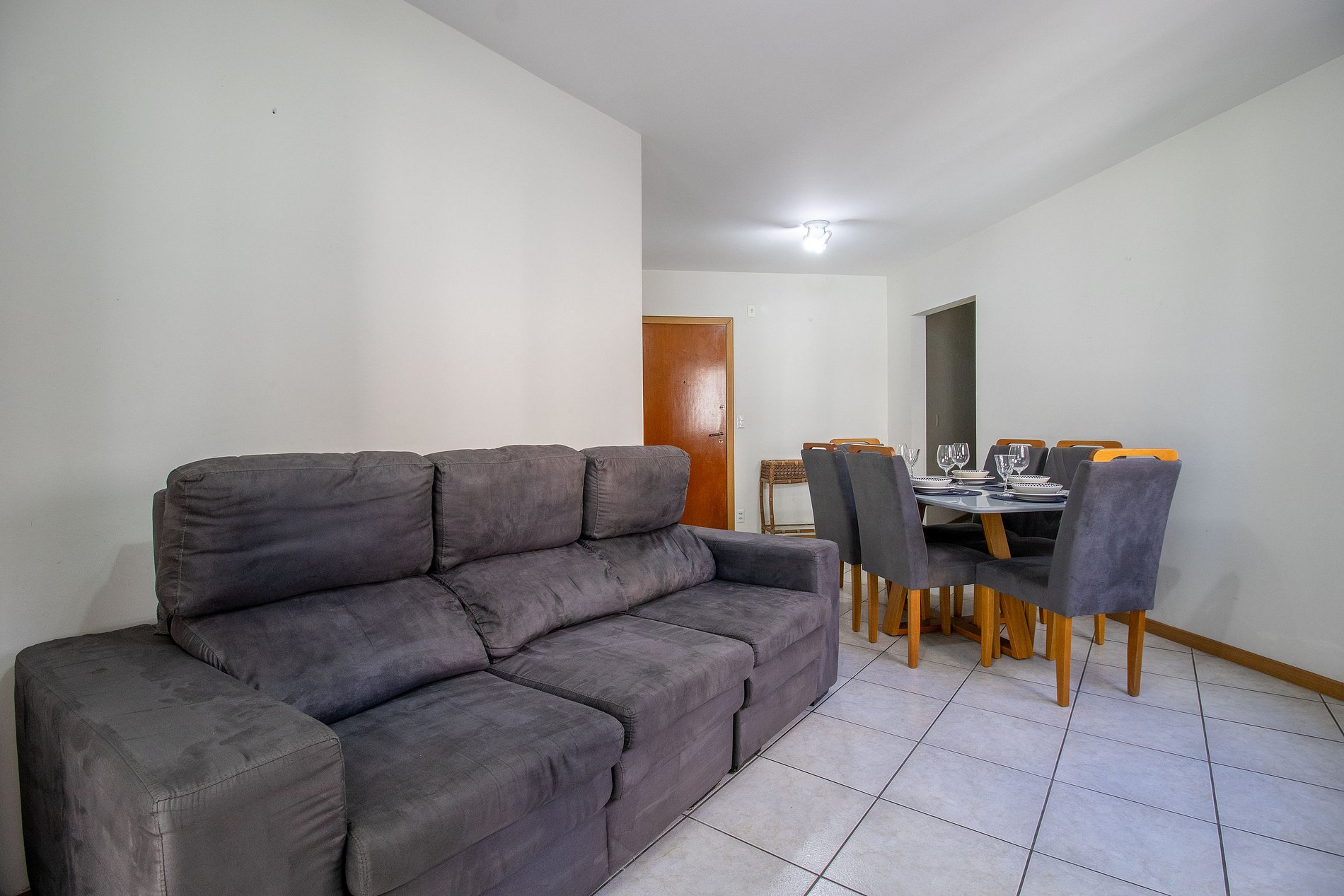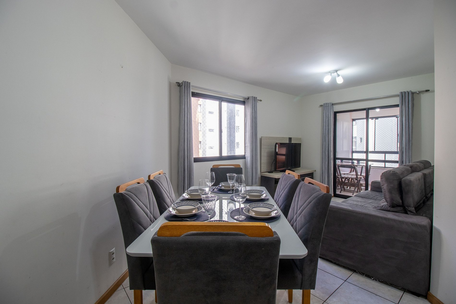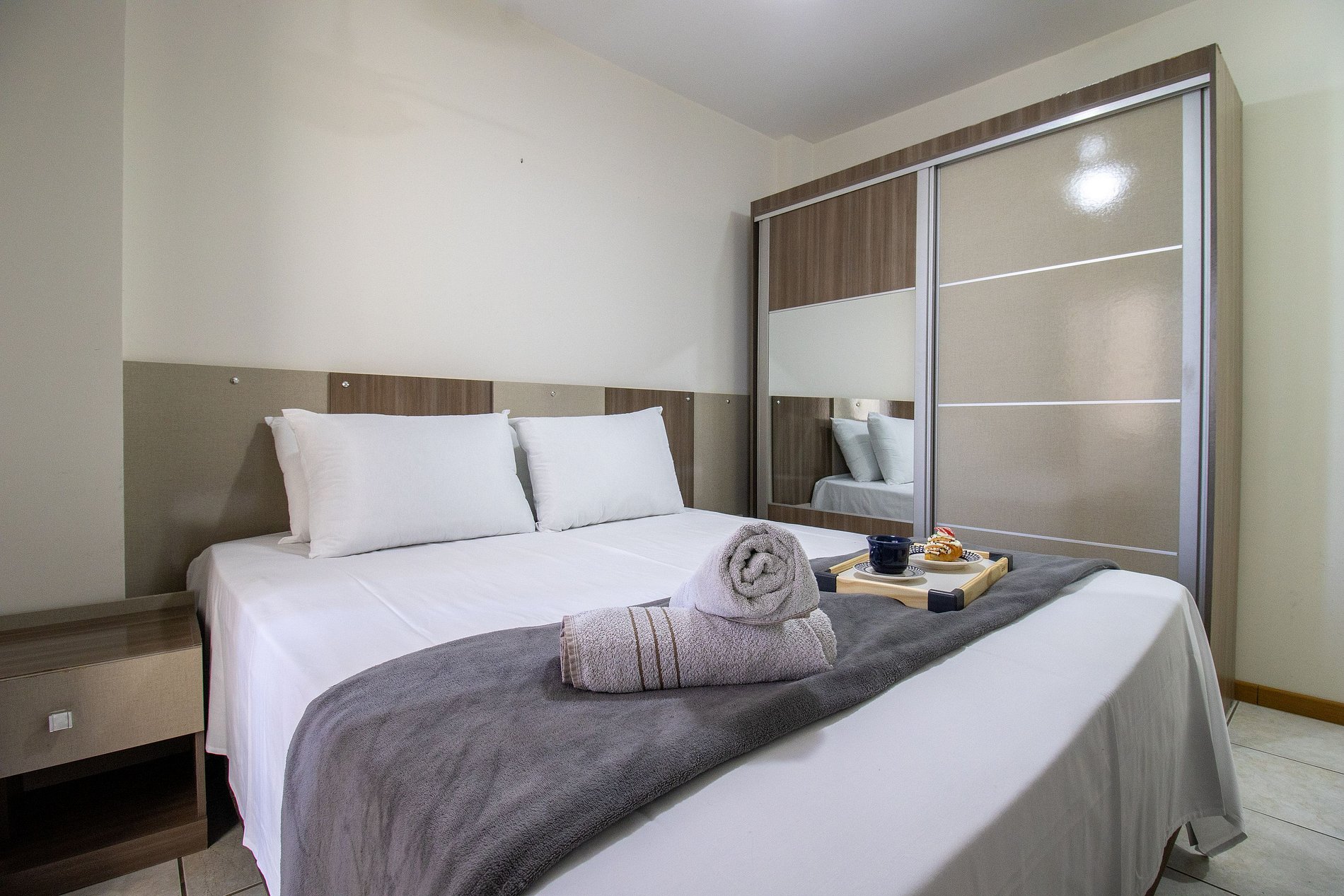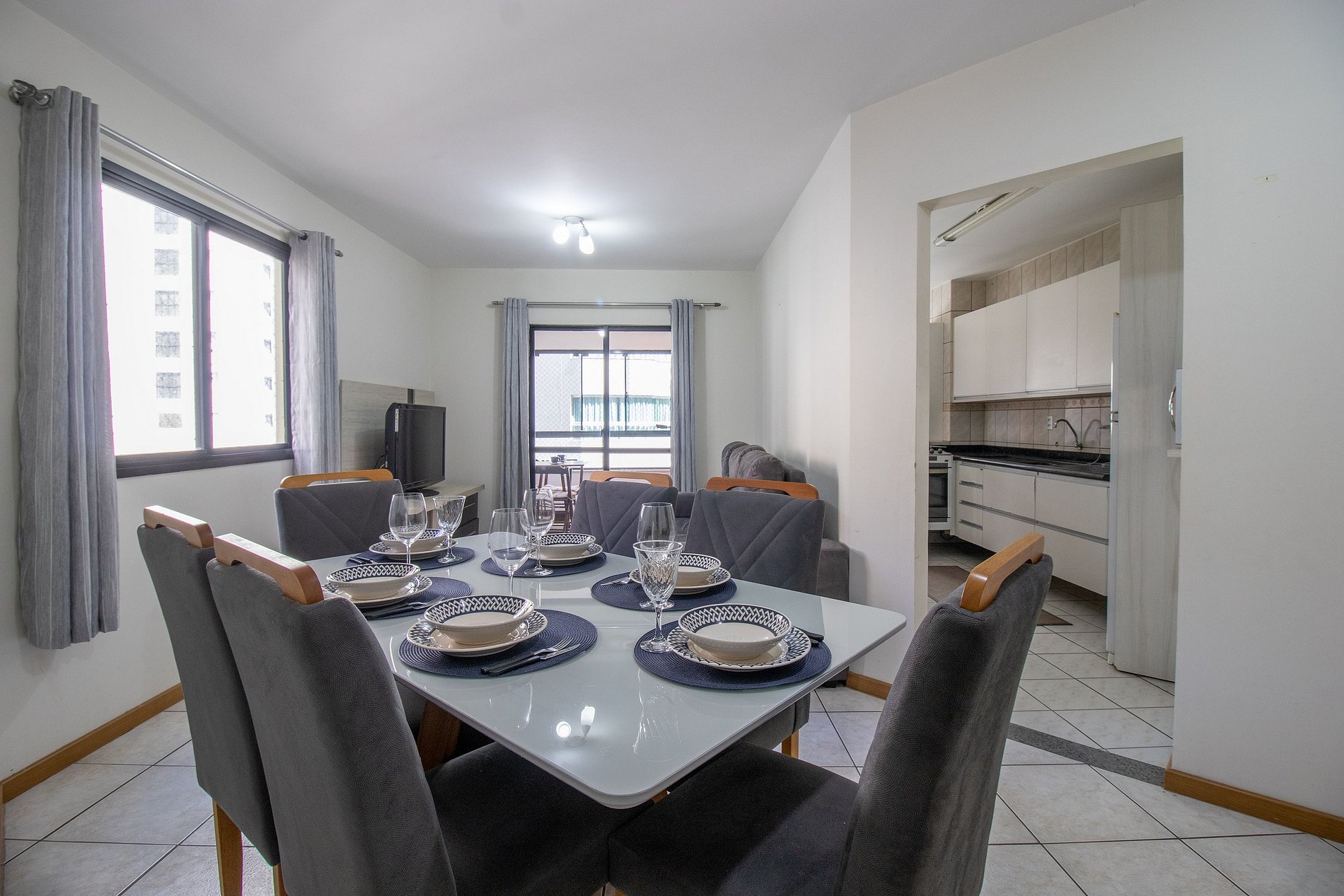 O apartamento possui três dormitórios, sendo uma suíte. Conta com dois banheiros com chuveiros elétricos. Ao total há duas camas queen, duas camas de solteiro e dois colchões de solteiro avulsos. Esse apartamento oferece uma sala com sofá, TV e uma mesa de jantar de 6 lugares. A varanda é fechada, conta com churrasqueira a carvão, ideal para momentos de lazer. A cozinha está equipada com o que você precisa para preparar refeições básicas para seu dia a dia, incluindo filtro de água, liquidificador e sanduicheira. Também dispõe de uma máquina de lavar, varal de chão, ferro de passar e secador de cabelo.