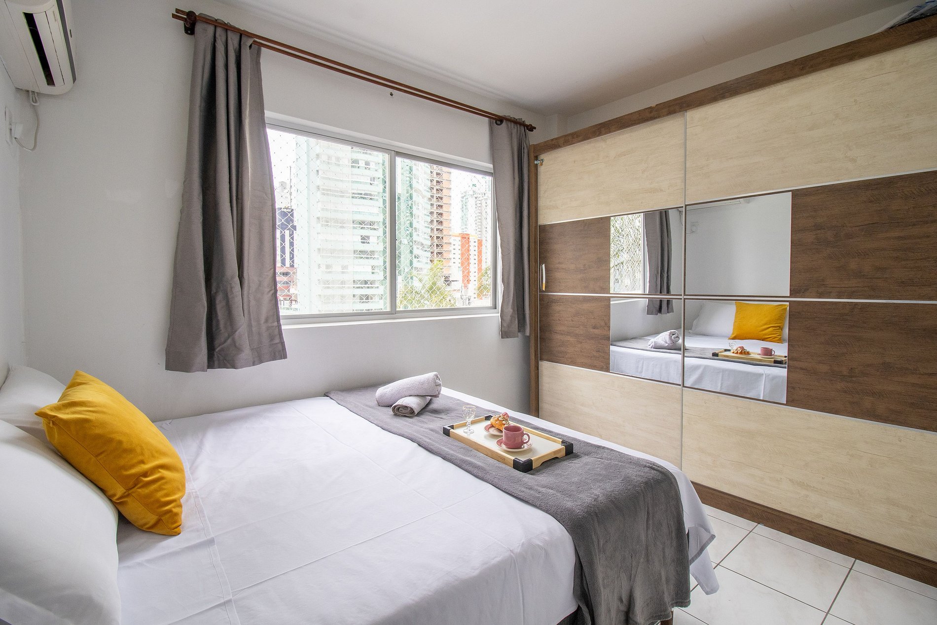 Este apartamento acomoda até 4 pessoas, oferecendo uma combinação de conforto e praticidade. A sala de estar possui sacada com redes de proteção, um sofá cama confortável e uma TV Smart, ideal para relaxar assistindo a seus filmes e séries favoritos. O dormitório possui cama queen que é formada por dois colchões box de solteiro e há um colchão de solteiro avulso. O banheiro possui chuveiro elétrico. A cozinha está completa, pronta para suas necessidades diárias. Equipamentos como liquidificador, microondas, forno, fogão, cafeteira e chaleira elétrica estão à disposição. Para maior comodidade, o apartamento também oferece ferro de passar, secador de cabelos e máquina de lavar. Fornecemos roupa de cama e uma toalha de banho por hóspede, garantindo praticidade e conforto durante sua estadia. Disponibilizamos uma manta de microfibra para a cama, sofá-cama e colchão avulso, garantindo seu máximo conforto.