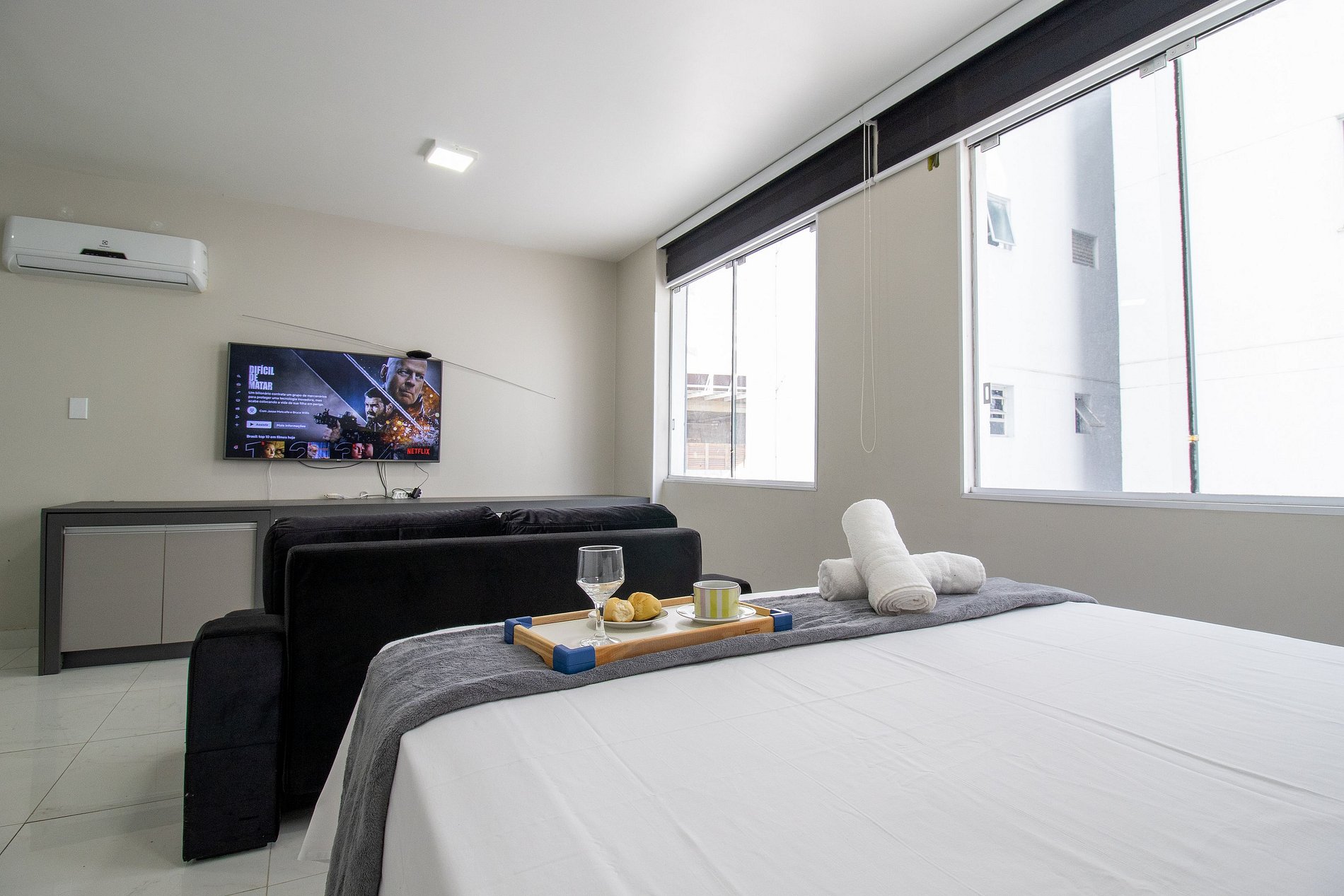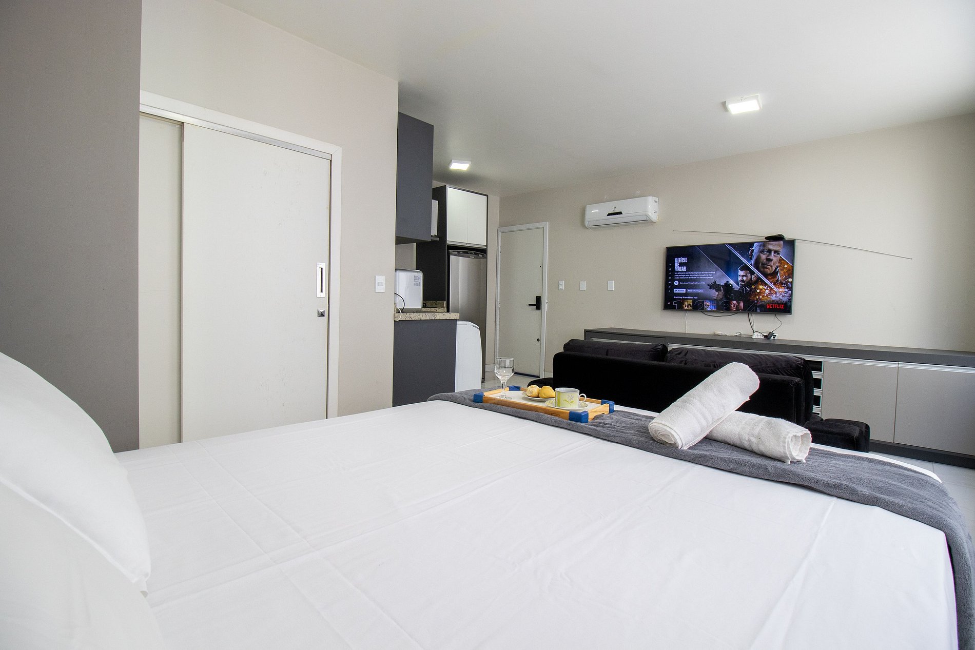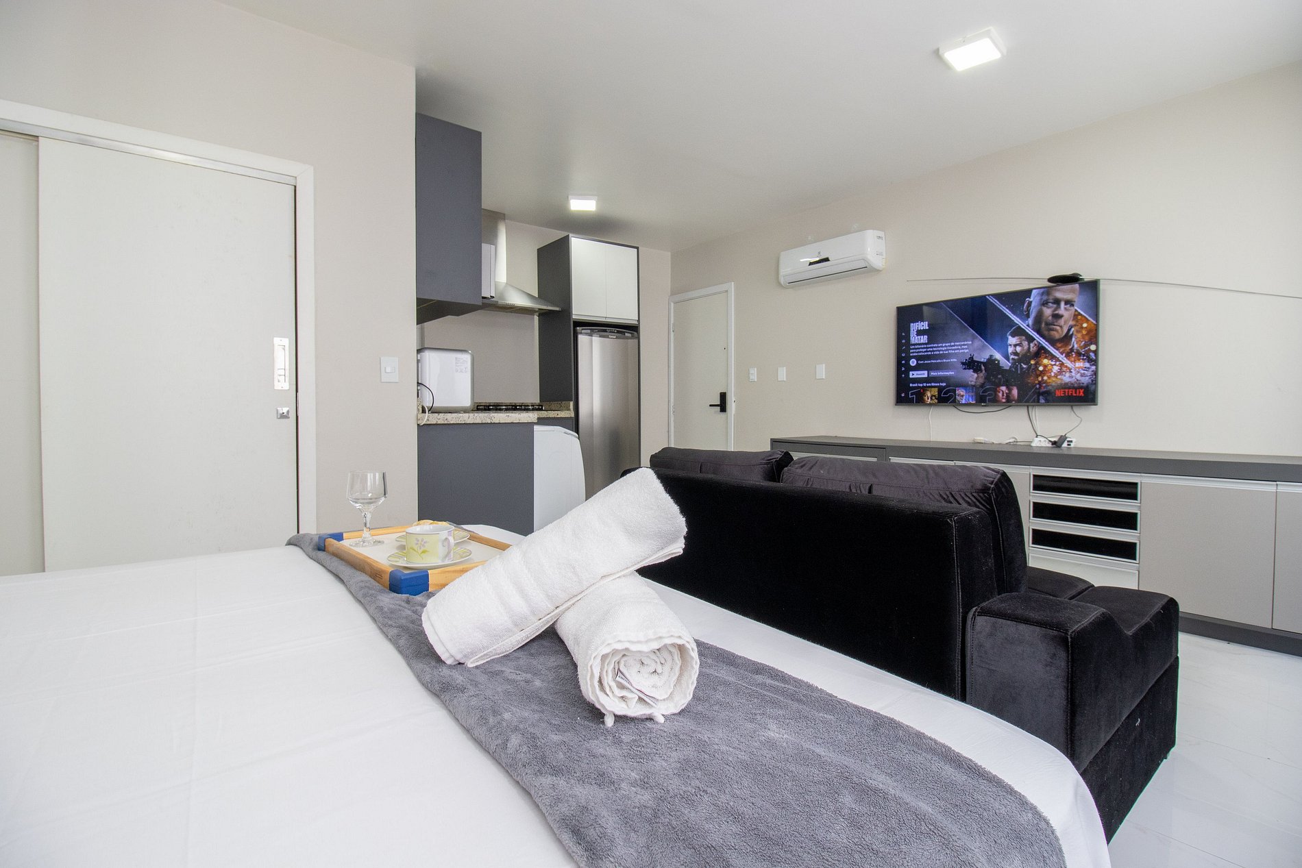 O apartamento tem conceito aberto e conta com uma cama de casal, um sofá-cama confortável, ar condicionado split, TV smart. Cozinha com microondas, sanduicheira, liquidificador, máquina de lavar, utensílios para refeições básicas, ferro de passar roupa e secador de cabelo. O banheiro com chuveiro elétrico tem acesso pelo quarto. Não há mesa de jantar nesse apartamento.