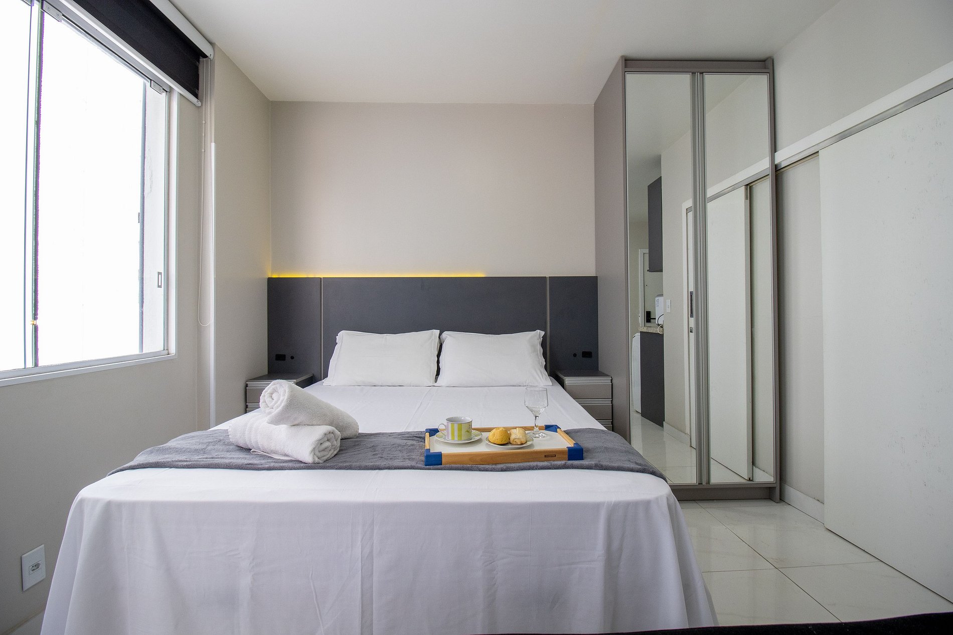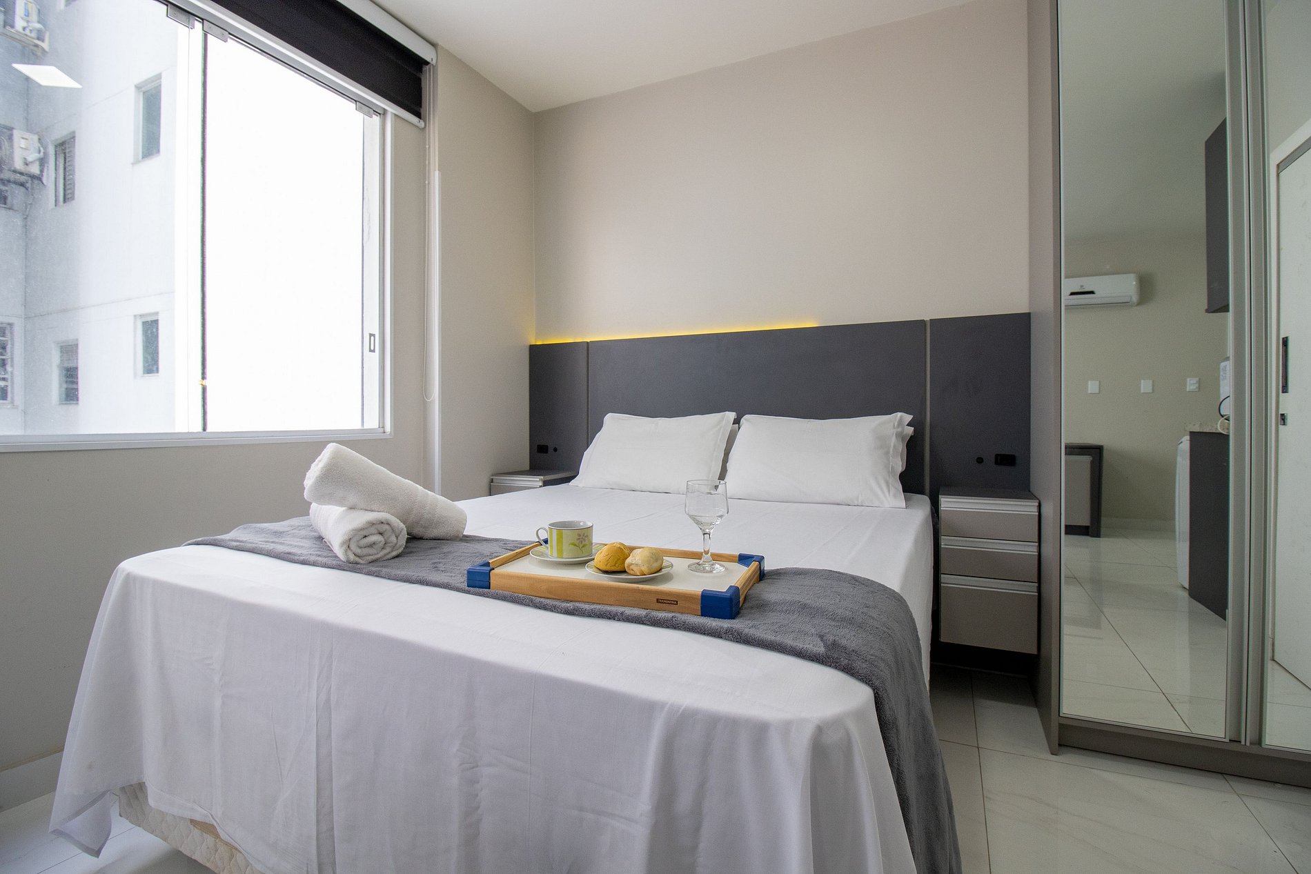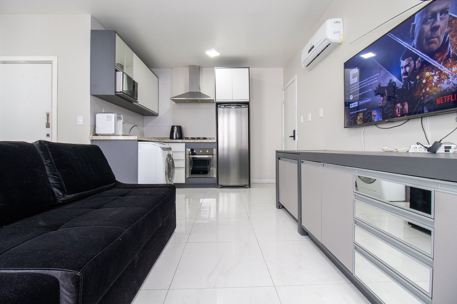 O apartamento tem conceito aberto e conta com uma cama de casal, um sofá-cama confortável, ar condicionado split, TV smart. Cozinha com microondas, sanduicheira, liquidificador, máquina de lavar, utensílios para refeições básicas, ferro de passar roupa e secador de cabelo. O banheiro com chuveiro elétrico tem acesso pelo quarto. Não há mesa de jantar nesse apartamento.