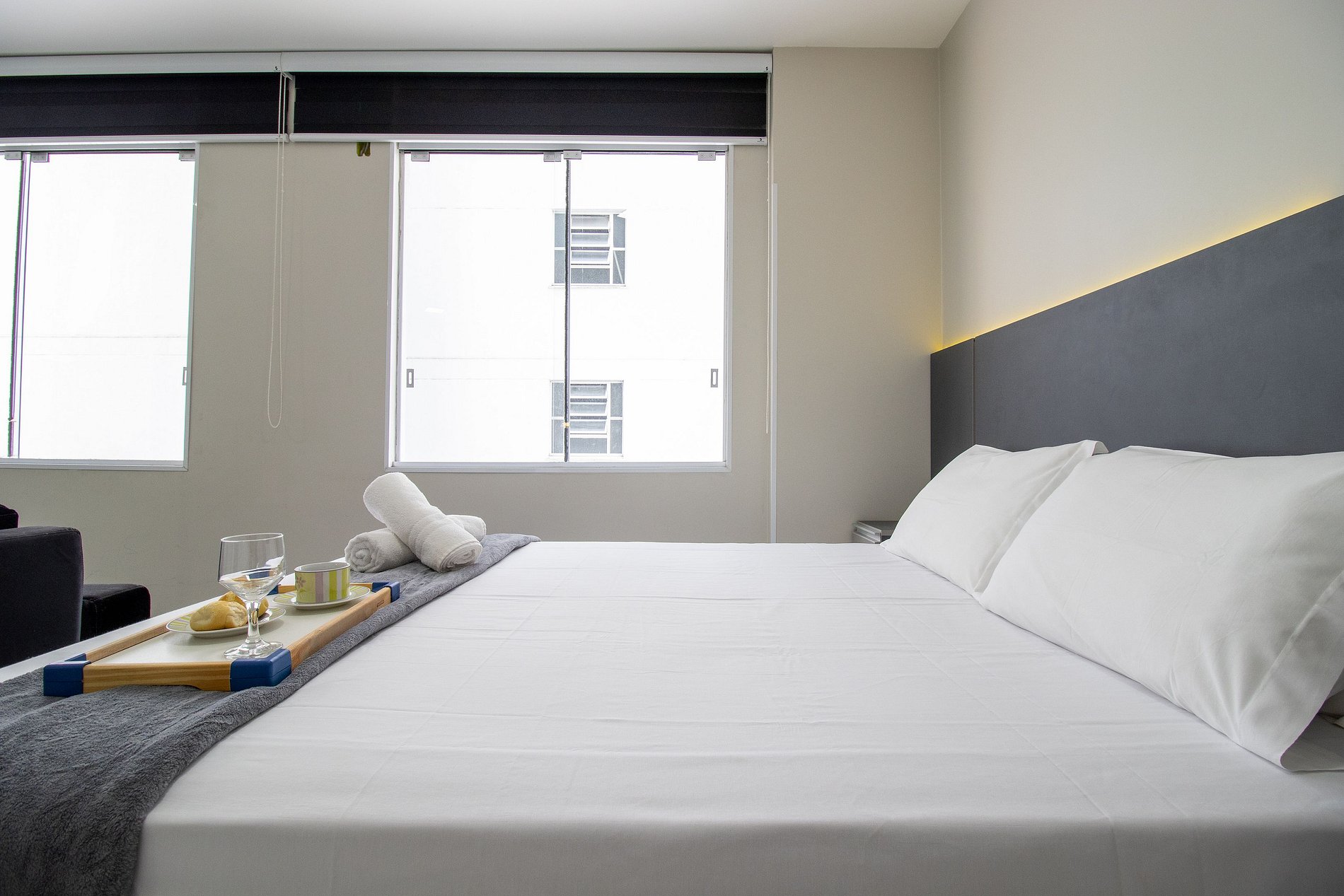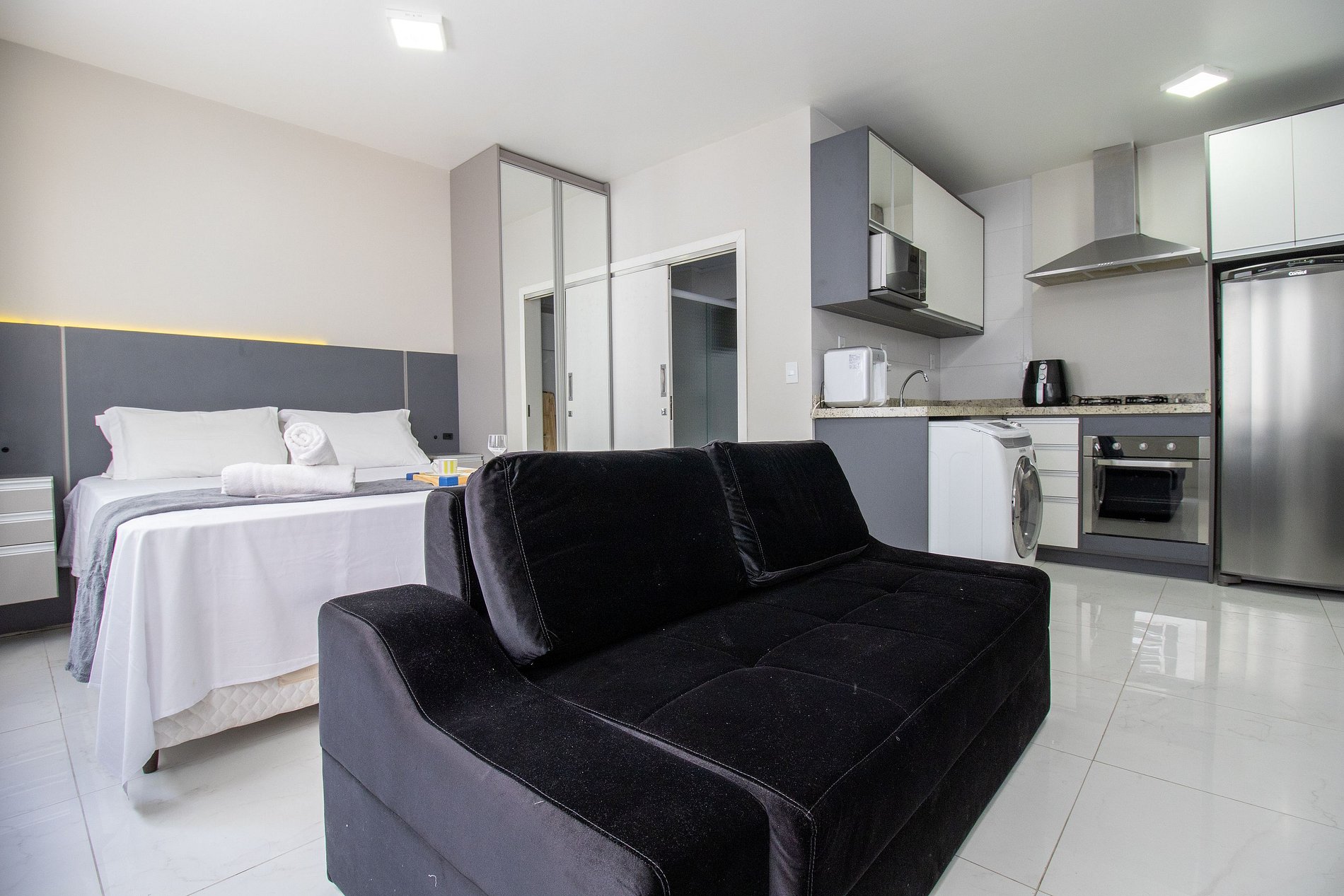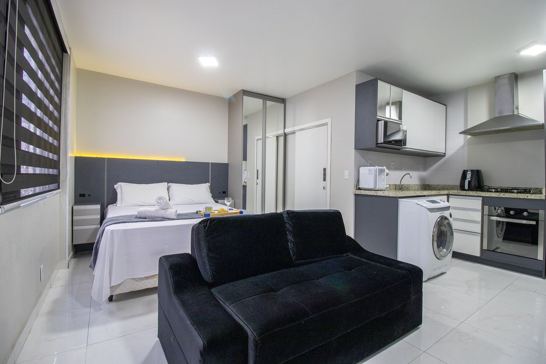 O apartamento tem conceito aberto e conta com uma cama de casal, um sofá-cama confortável, ar condicionado split, TV smart. Cozinha com microondas, sanduicheira, liquidificador, máquina de lavar, utensílios para refeições básicas, ferro de passar roupa e secador de cabelo. O banheiro com chuveiro elétrico tem acesso pelo quarto. Não há mesa de jantar nesse apartamento.