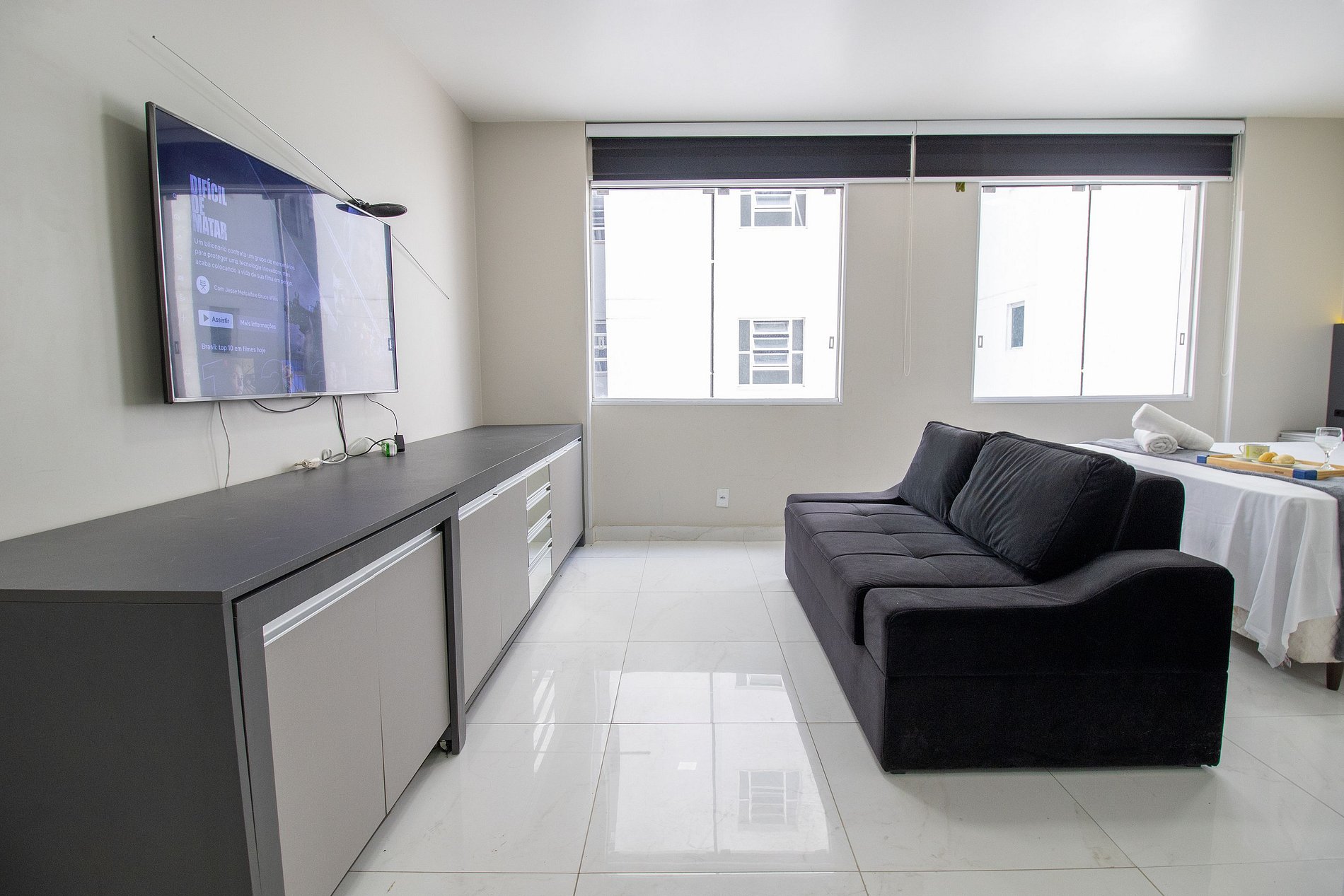 Internet wi-fi de boa velocidade própria do apartamento, TV Smart na suíte e na sala.