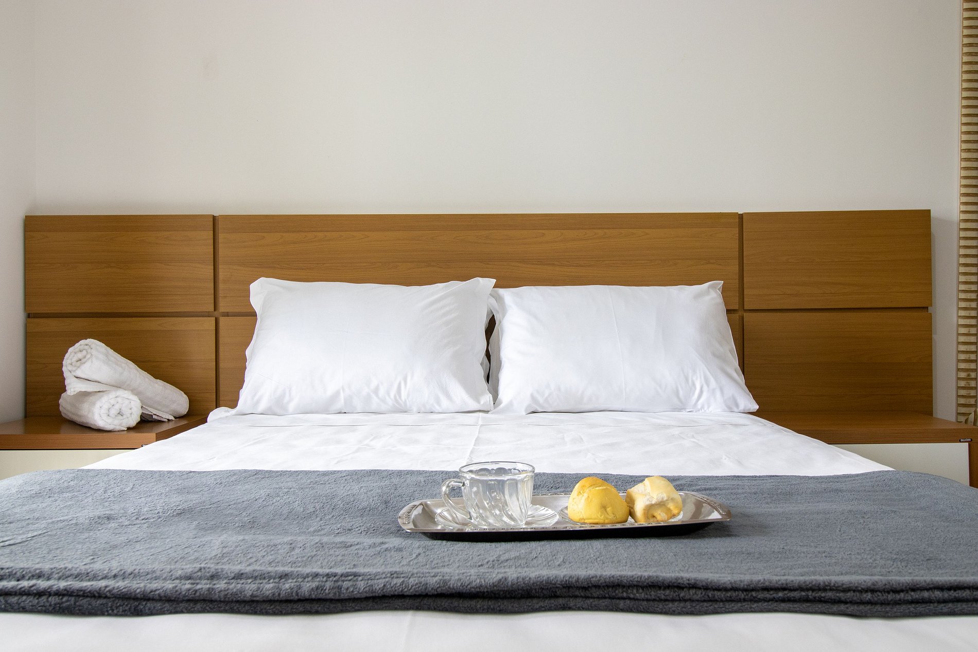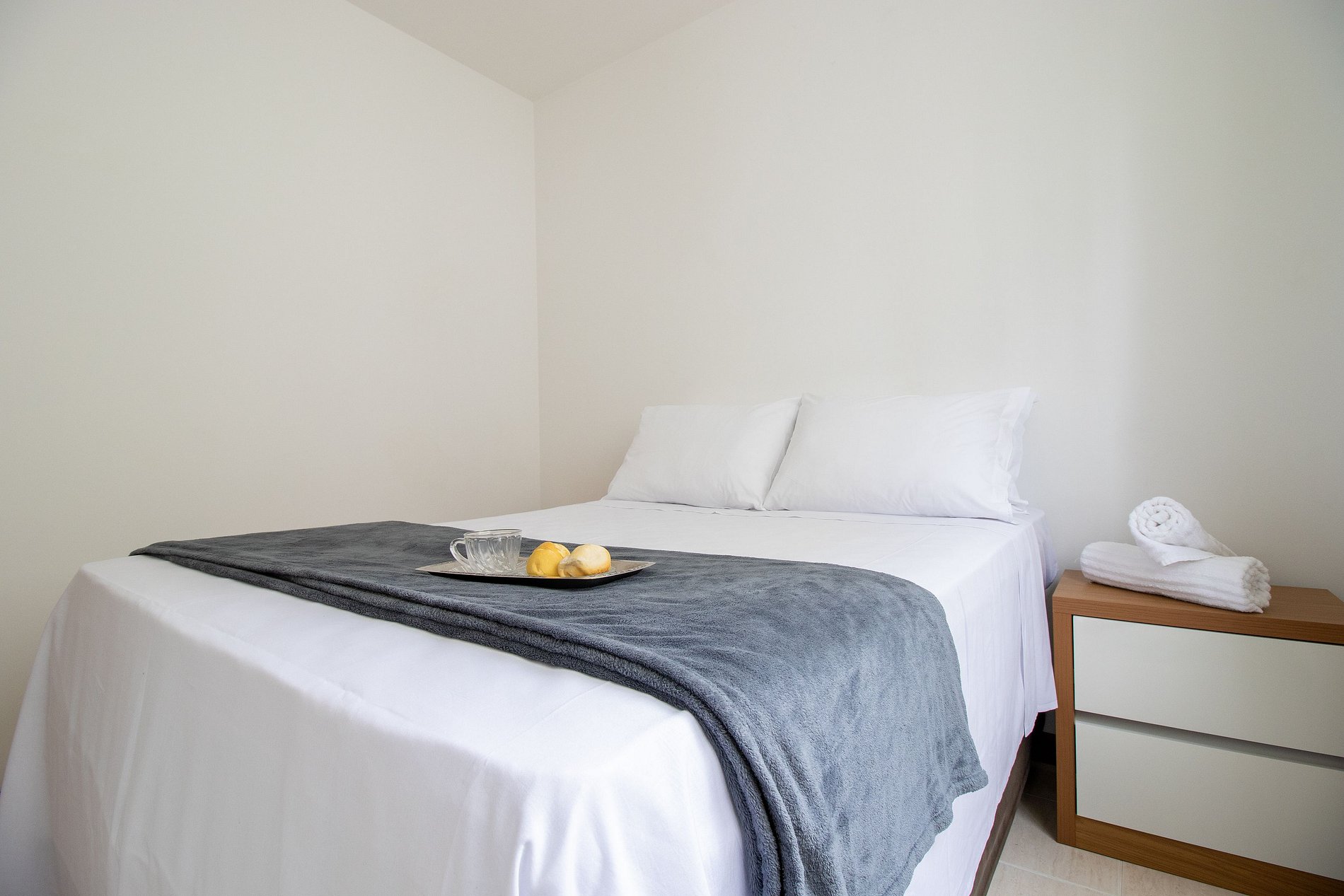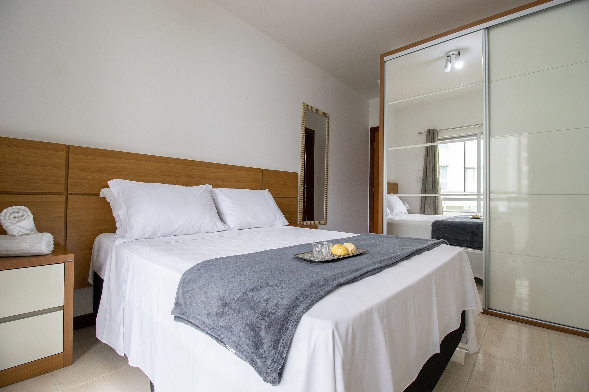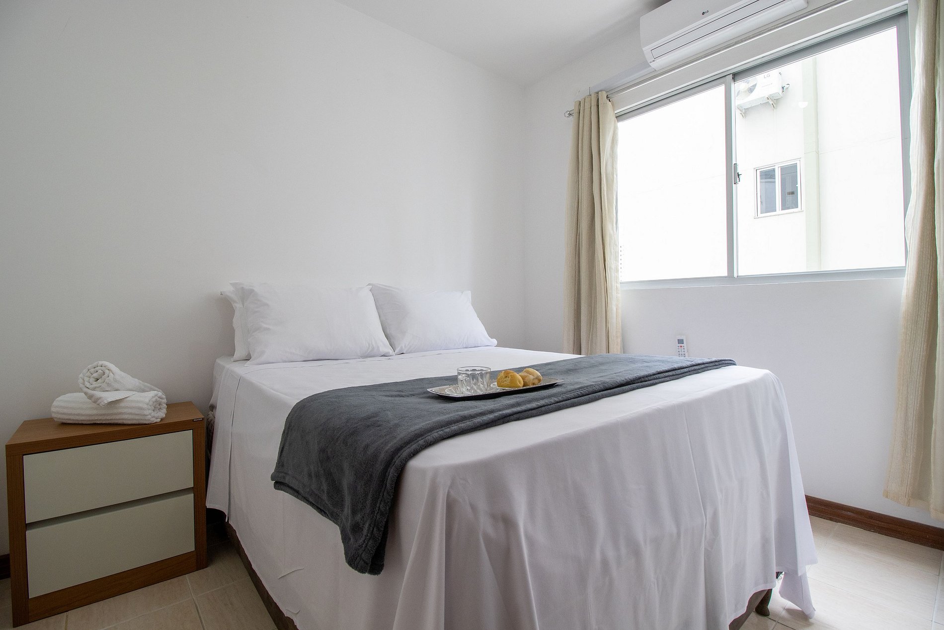 O apartamento conta com dois dormitórios, sendo uma suíte e mais um dormitório. Há duas cama de casal e dois colchões de solteiro avulsos. Disponibilizamos roupa de cama básica (lençol de elástico, sobre lençol e travesseiros com fronha) e uma toalha de banho por hóspede. Oferecemos um edredom para cada cama e uma manta de microfibra para cada colchão avulso, garantindo seu máximo conforto.