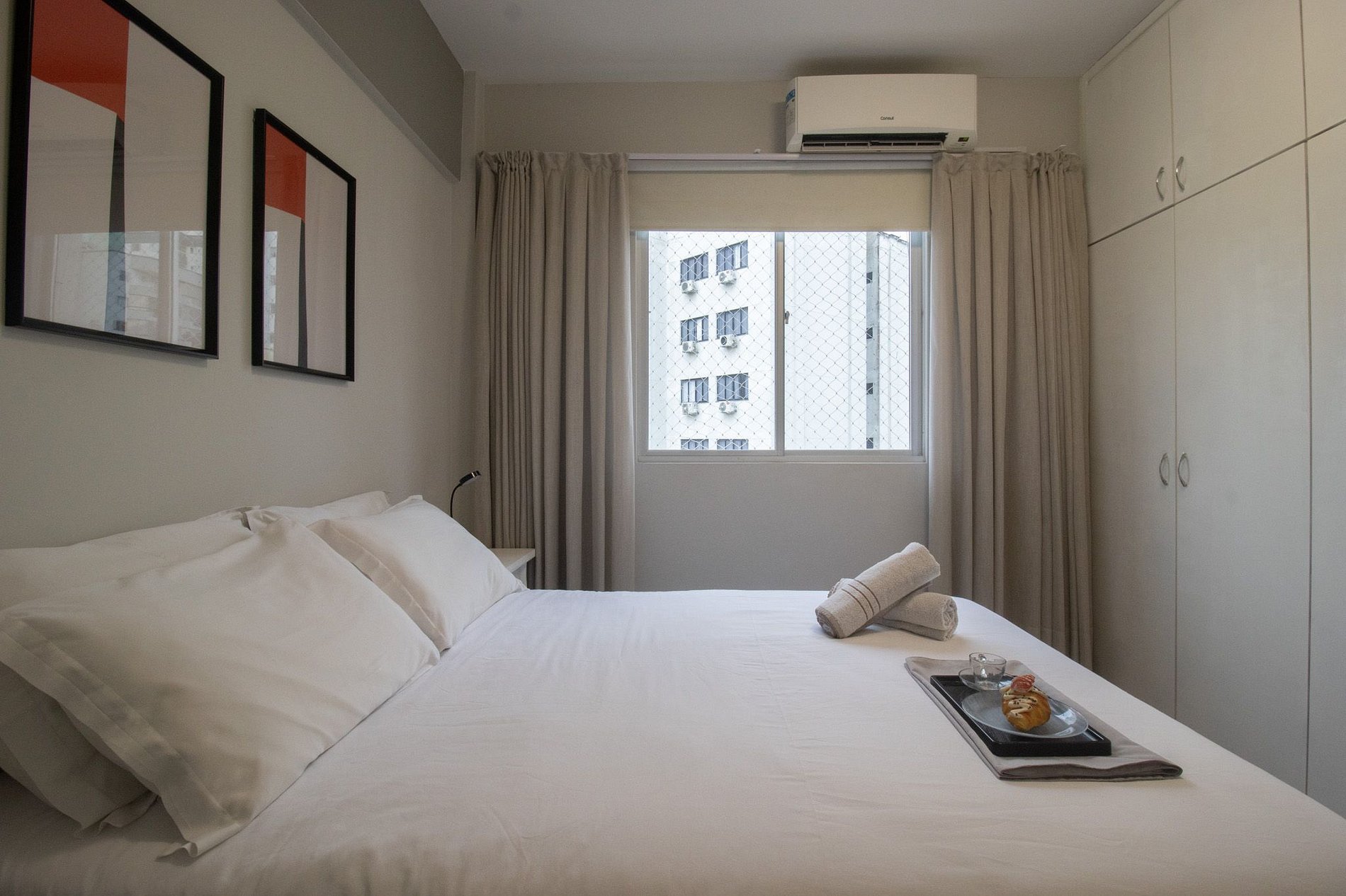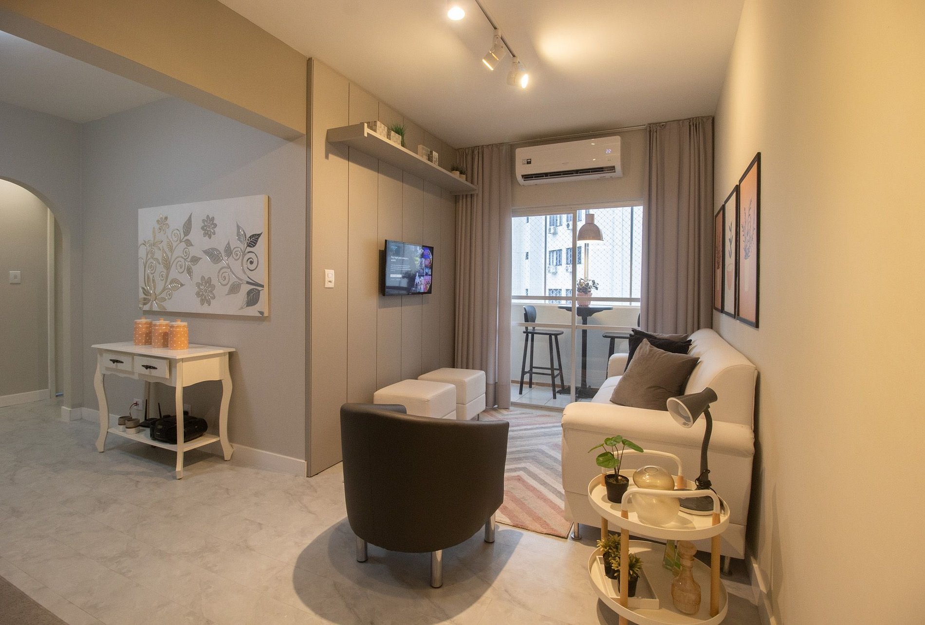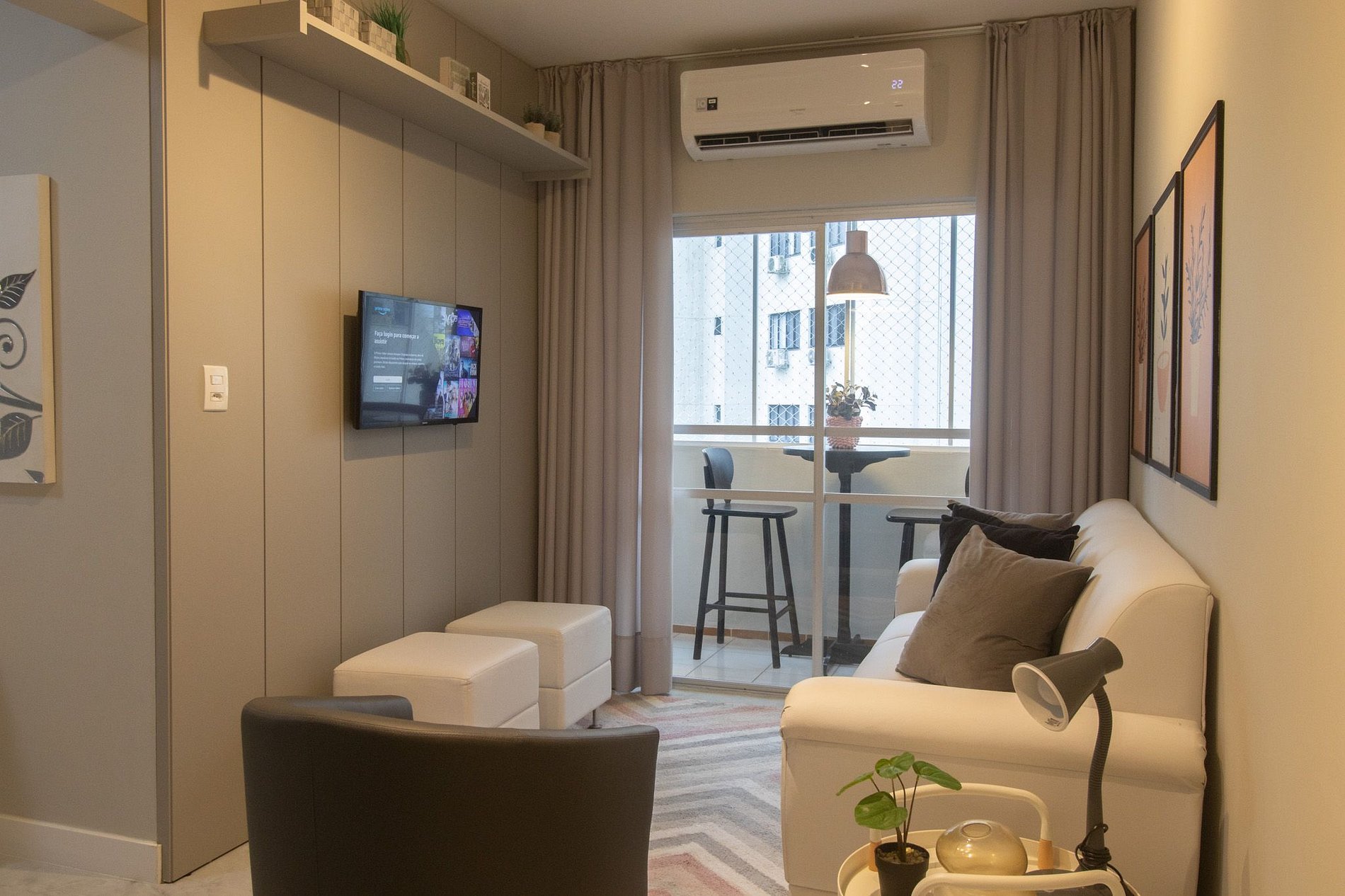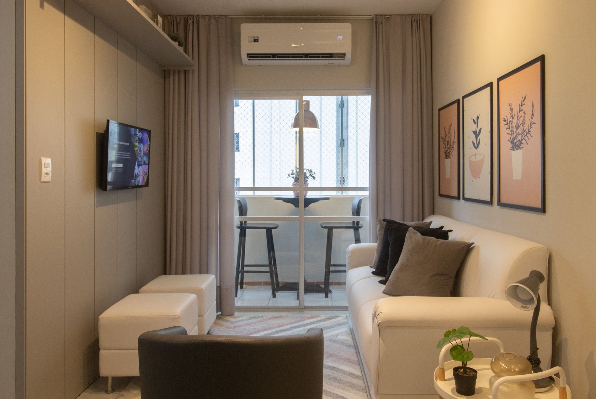 Espaço climatizado com três ares condicionados, sendo um em cada quarto e na sala.
