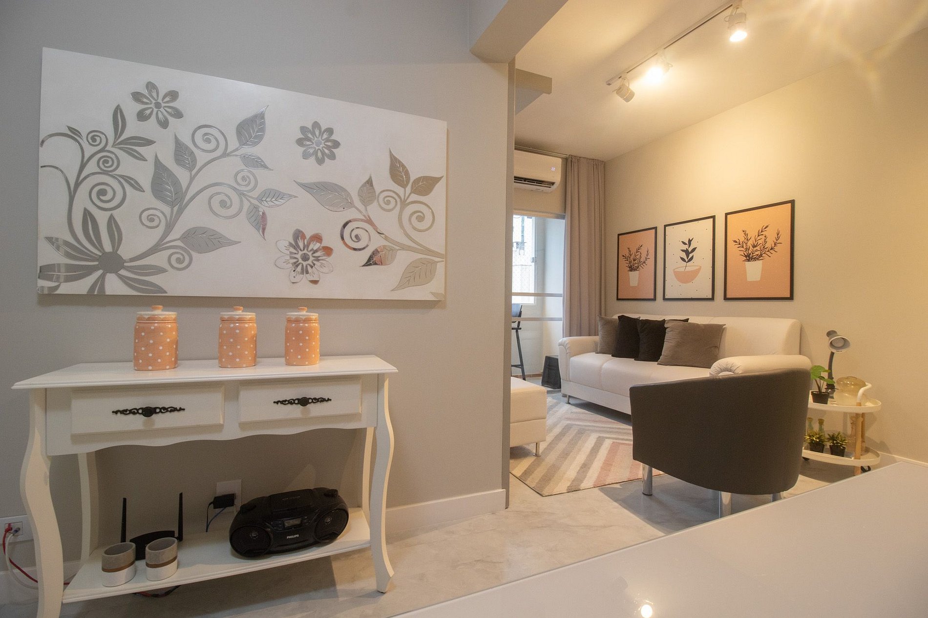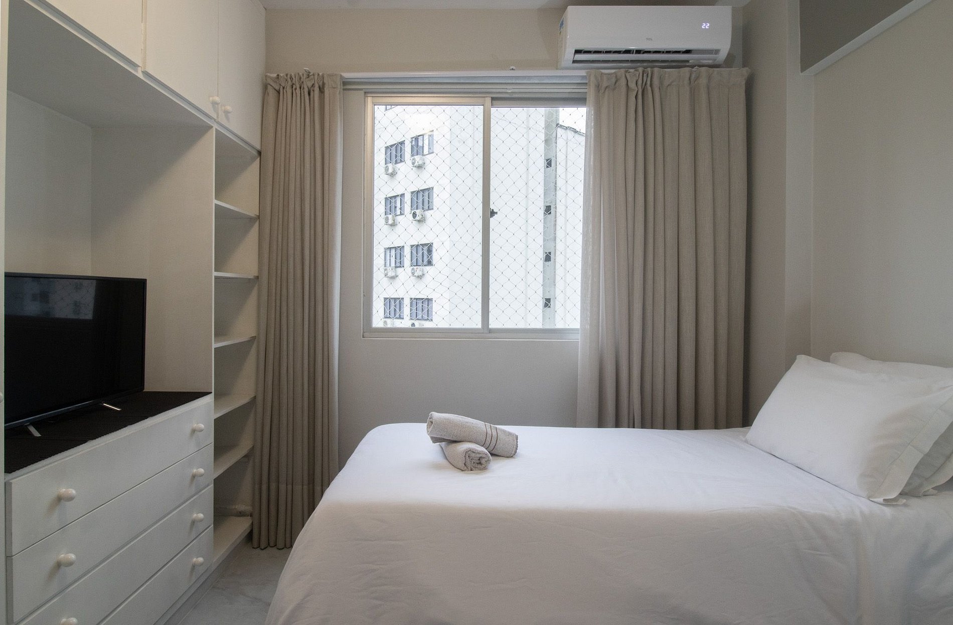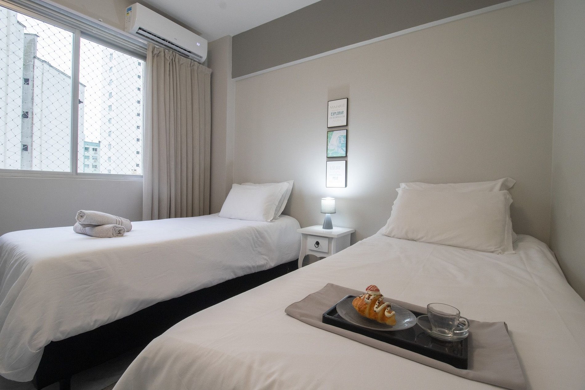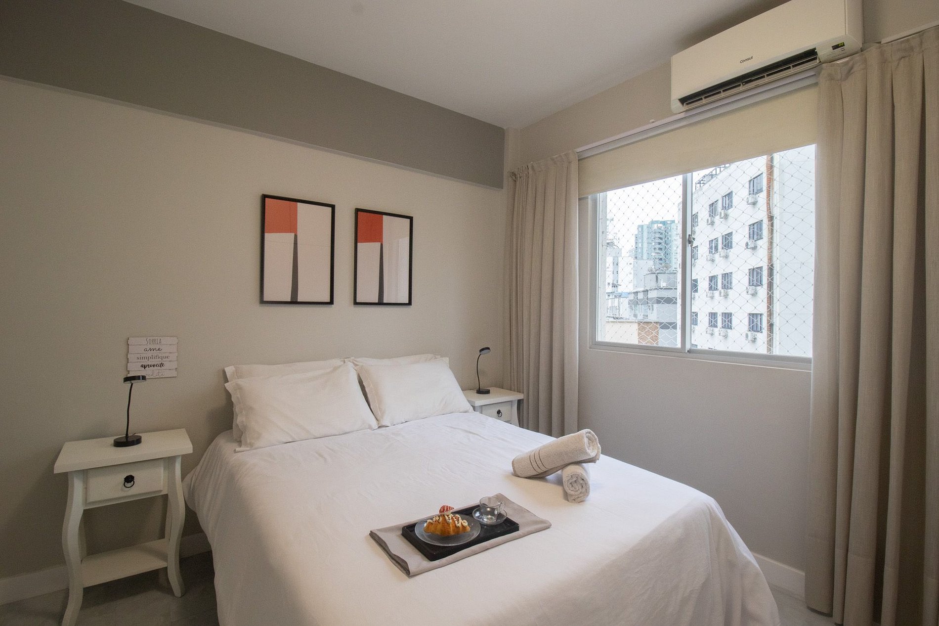Espaço climatizado com três ares condicionados, sendo um em cada quarto e na sala.