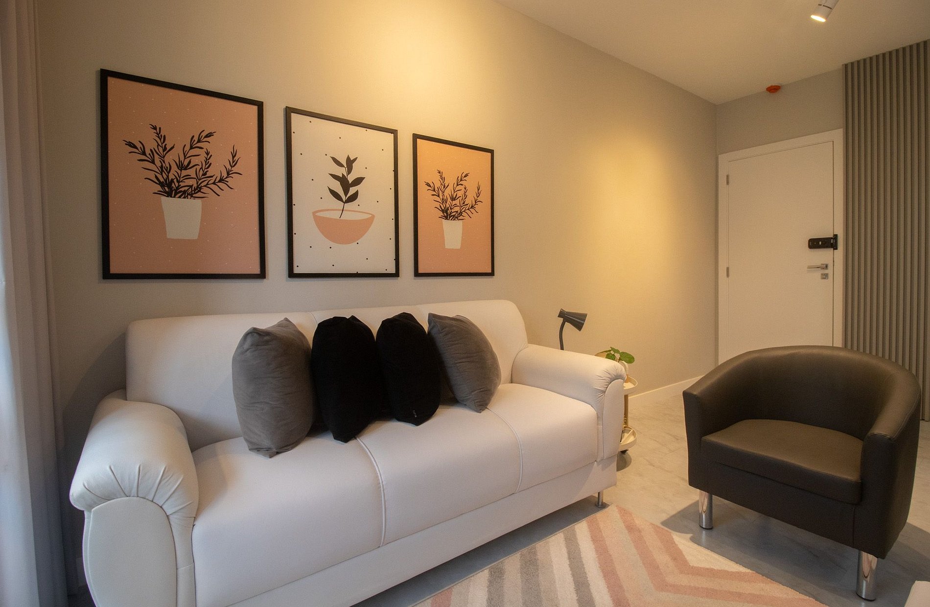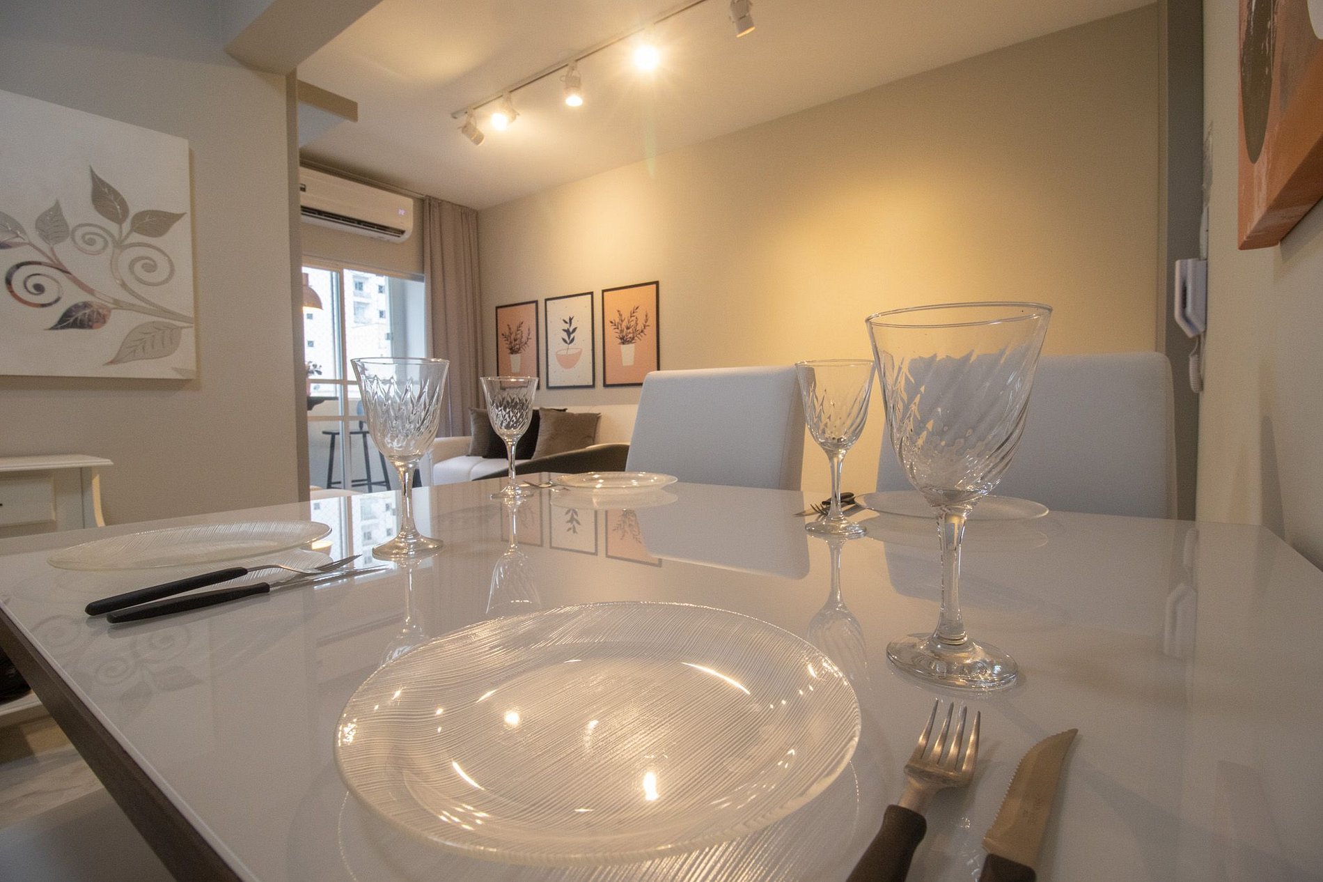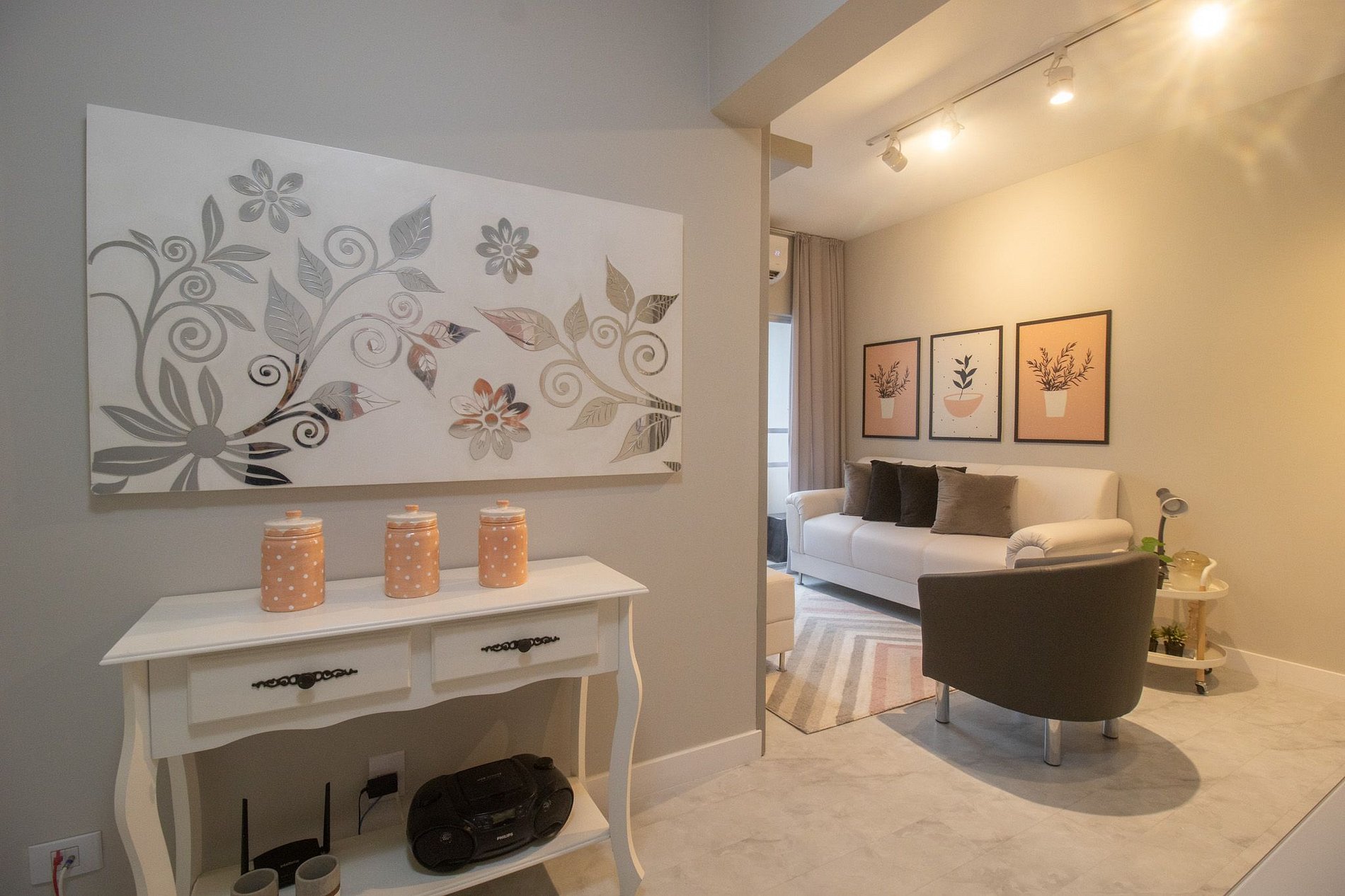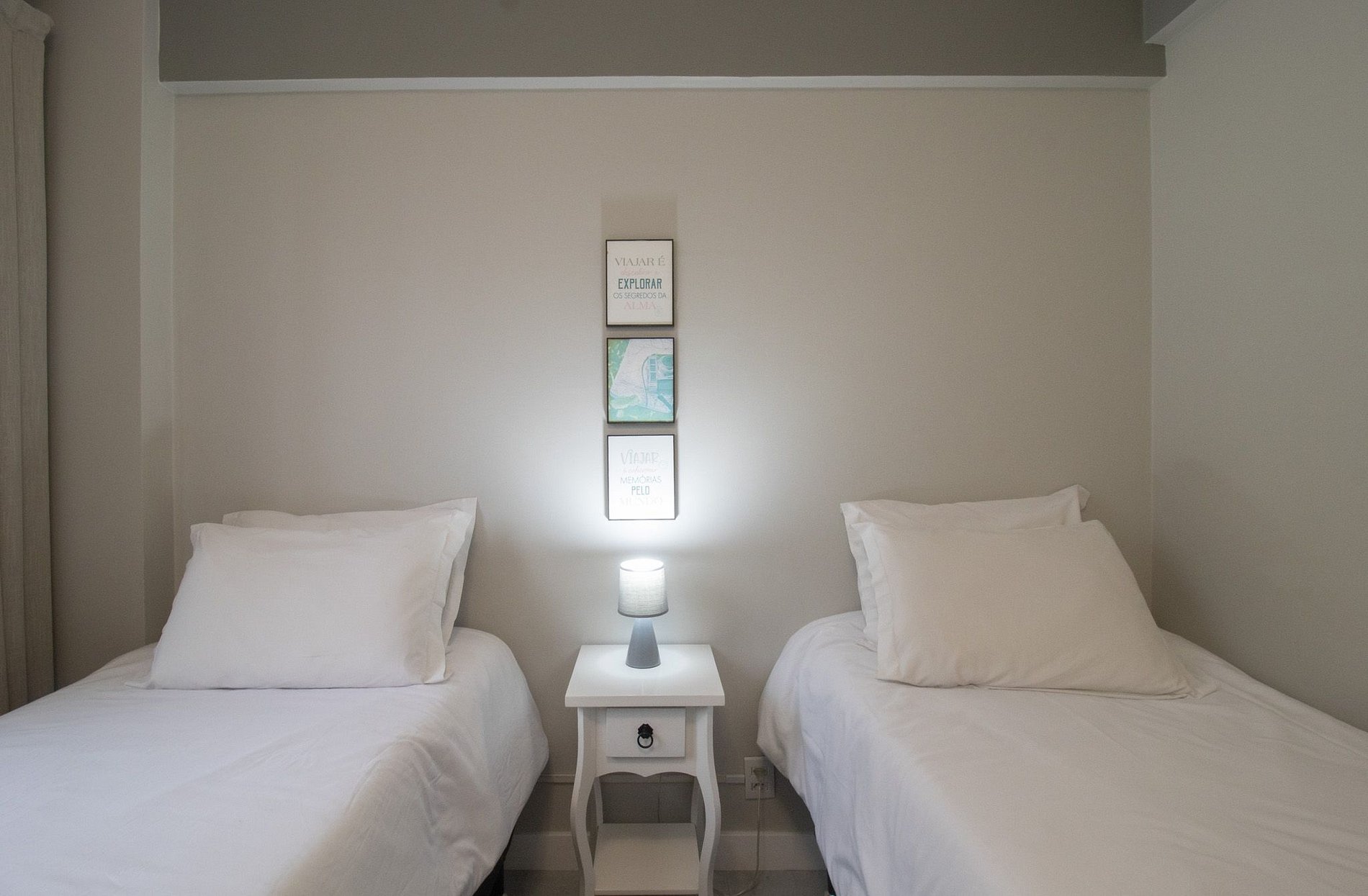 Espaço climatizado com três ares condicionados, sendo um em cada quarto e na sala.