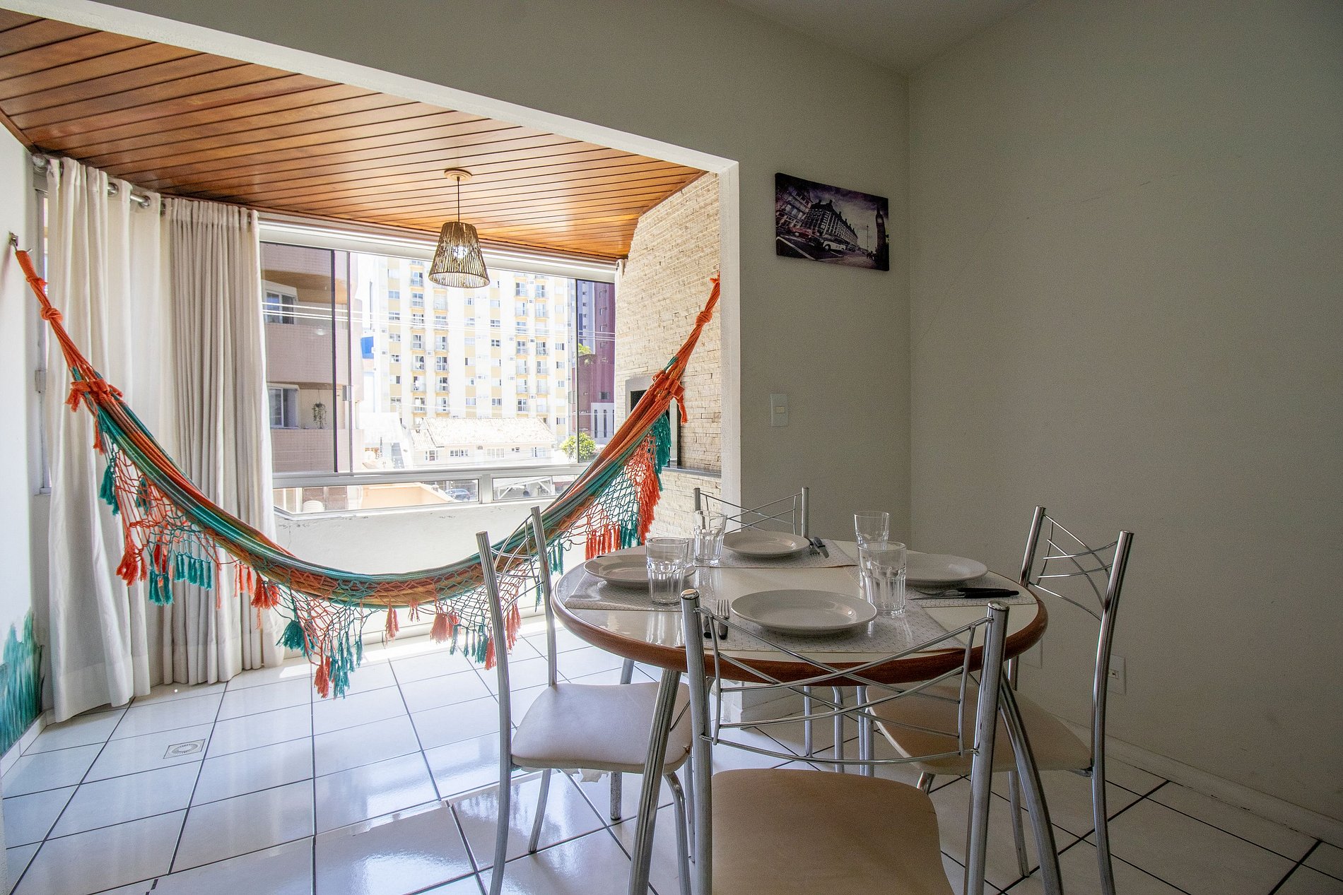 A sacada é equipada com uma churrasqueira e uma confortável rede, ideal para relaxar enquanto se aprecia a vista da cidade e se prepara um bom churrasco.