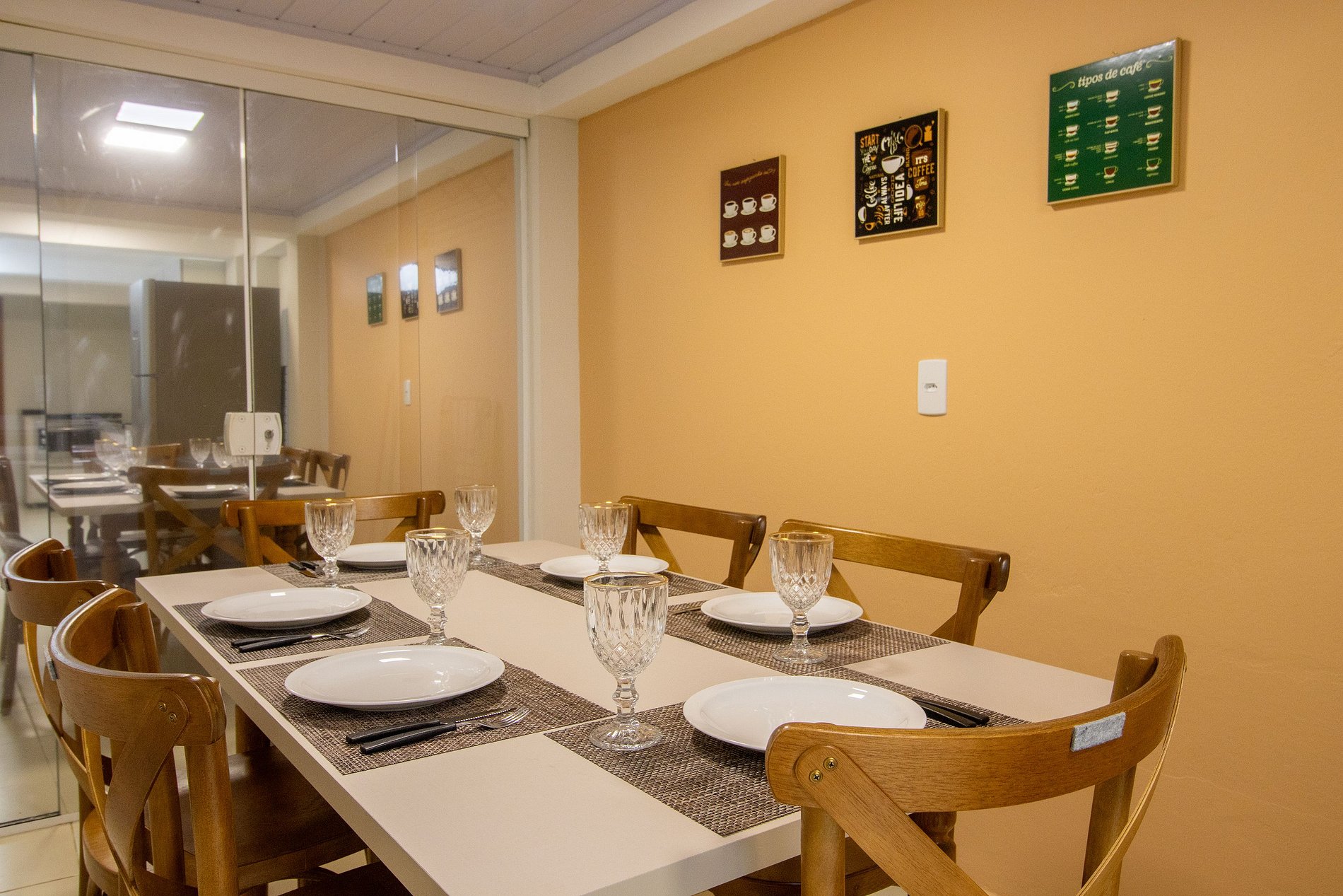 O espaço é térreo, ideal para famílias ou grupos de até 10 pessoas, com 3 quartos confortáveis: uma suíte com cama queen, um quarto com cama queen e outro dormitório com duas camas de solteiro, além de oferecer dois colchões de casal avulsos, oferecendo versatilidade para todos os hóspedes. São dois banheiros ao total com chuveiro elétrico, garantindo mais comodidade para todos. A sala de estar é equipada com uma TV Smart e um sofá confortável para seus momentos de lazer. A cozinha conta com uma claraboia, além de ser integrada à sala de jantar e conta com todos os utensílios essenciais para o dia a dia, além de aparelhos como sanduicheira, cafeteira, airfryer, chaleira elétrica e liquidificador para preparar suas refeições com facilidade. A área de serviço completa o ambiente com máquina de lavar, ferro e secador de cabelo, oferecendo ainda mais praticidade.