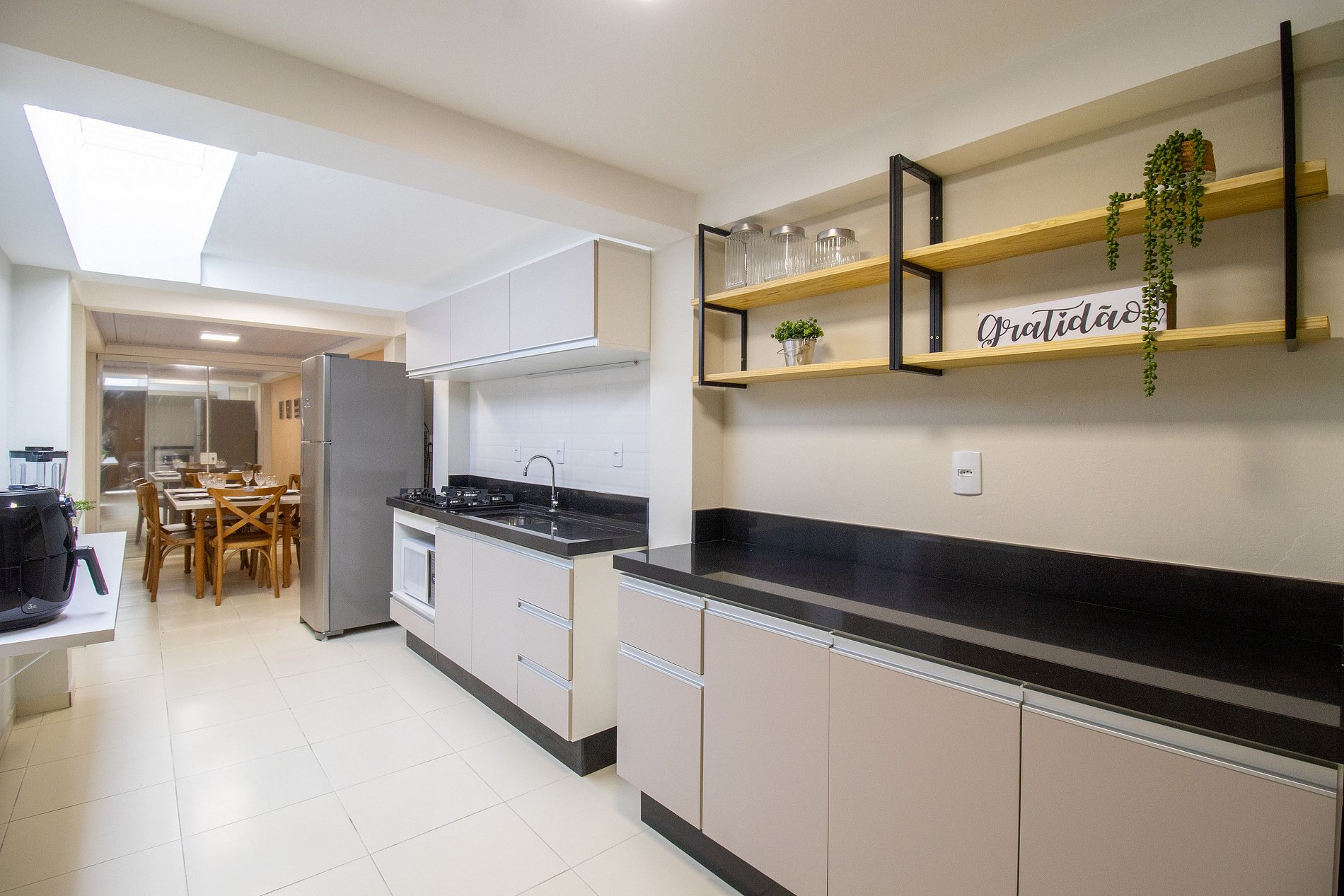 O espaço é térreo, ideal para famílias ou grupos de até 10 pessoas, com 3 quartos confortáveis: uma suíte com cama queen, um quarto com cama queen e outro dormitório com duas camas de solteiro, além de oferecer dois colchões de casal avulsos, oferecendo versatilidade para todos os hóspedes. São dois banheiros ao total com chuveiro elétrico, garantindo mais comodidade para todos. A sala de estar é equipada com uma TV Smart e um sofá confortável para seus momentos de lazer. A cozinha conta com uma claraboia, além de ser integrada à sala de jantar e conta com todos os utensílios essenciais para o dia a dia, além de aparelhos como sanduicheira, cafeteira, airfryer, chaleira elétrica e liquidificador para preparar suas refeições com facilidade. A área de serviço completa o ambiente com máquina de lavar, ferro e secador de cabelo, oferecendo ainda mais praticidade.