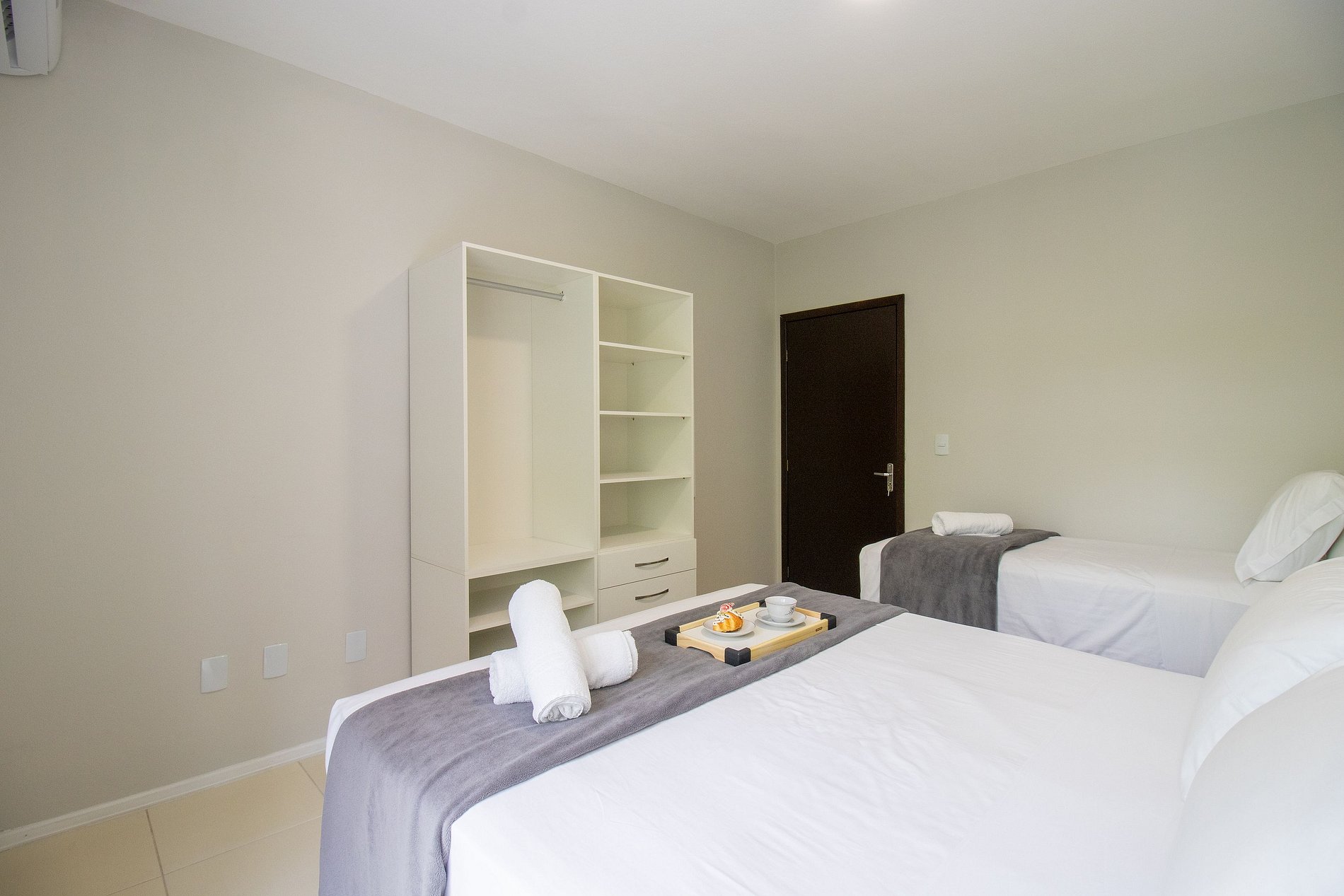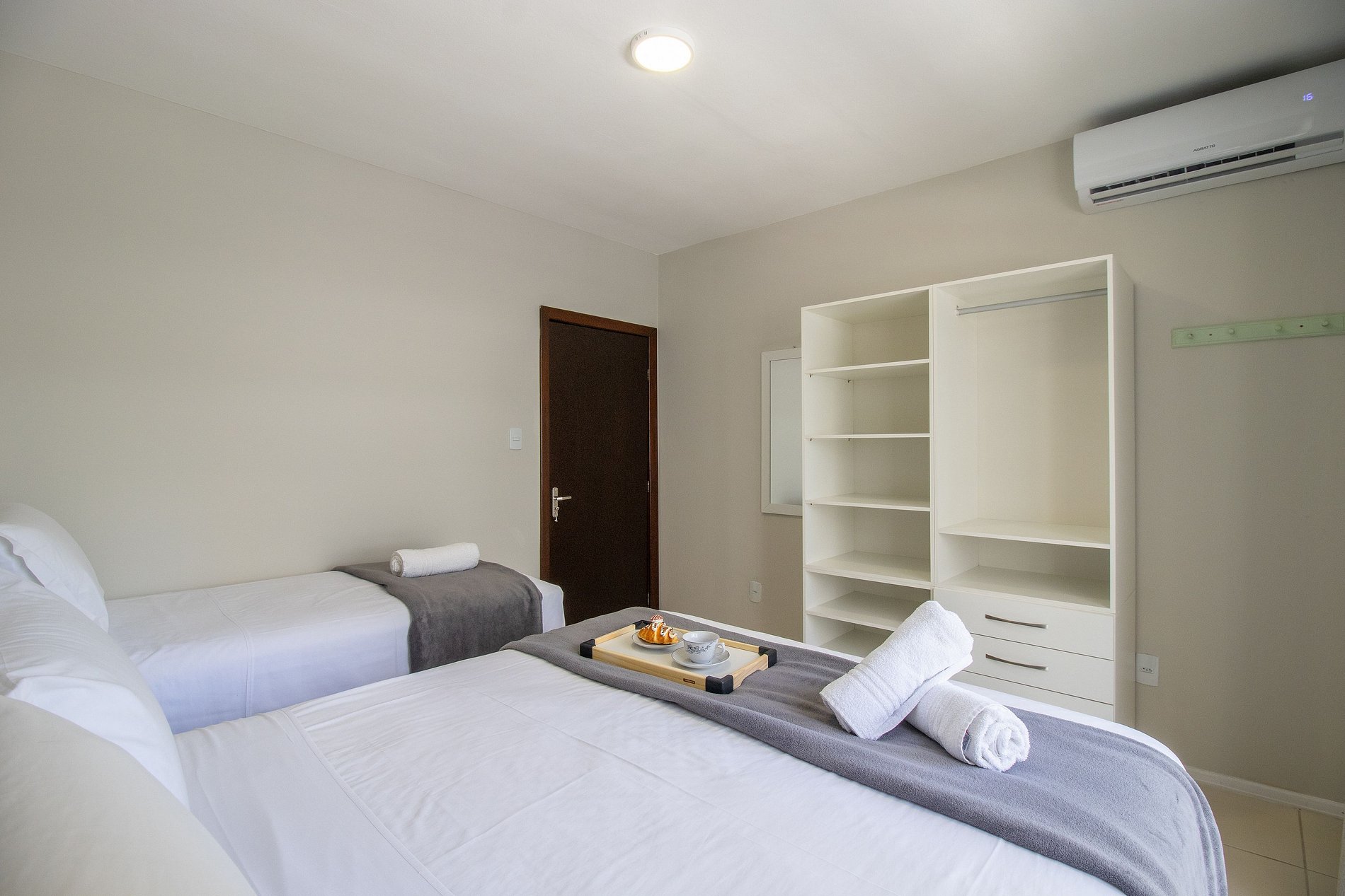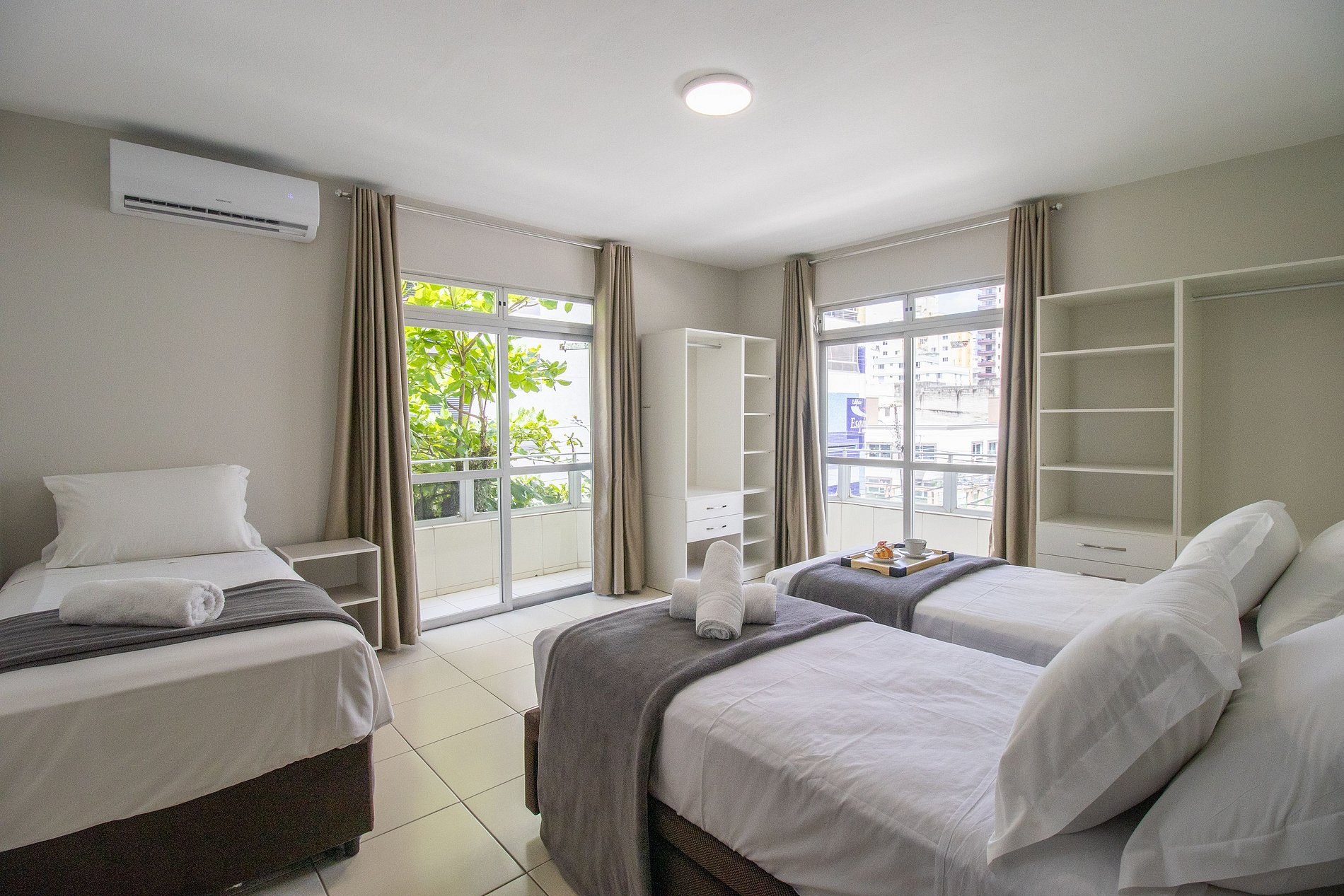 O espaço possui três ares condicionados split, apenas na função resfriamento, sendo um em cada dormitório.